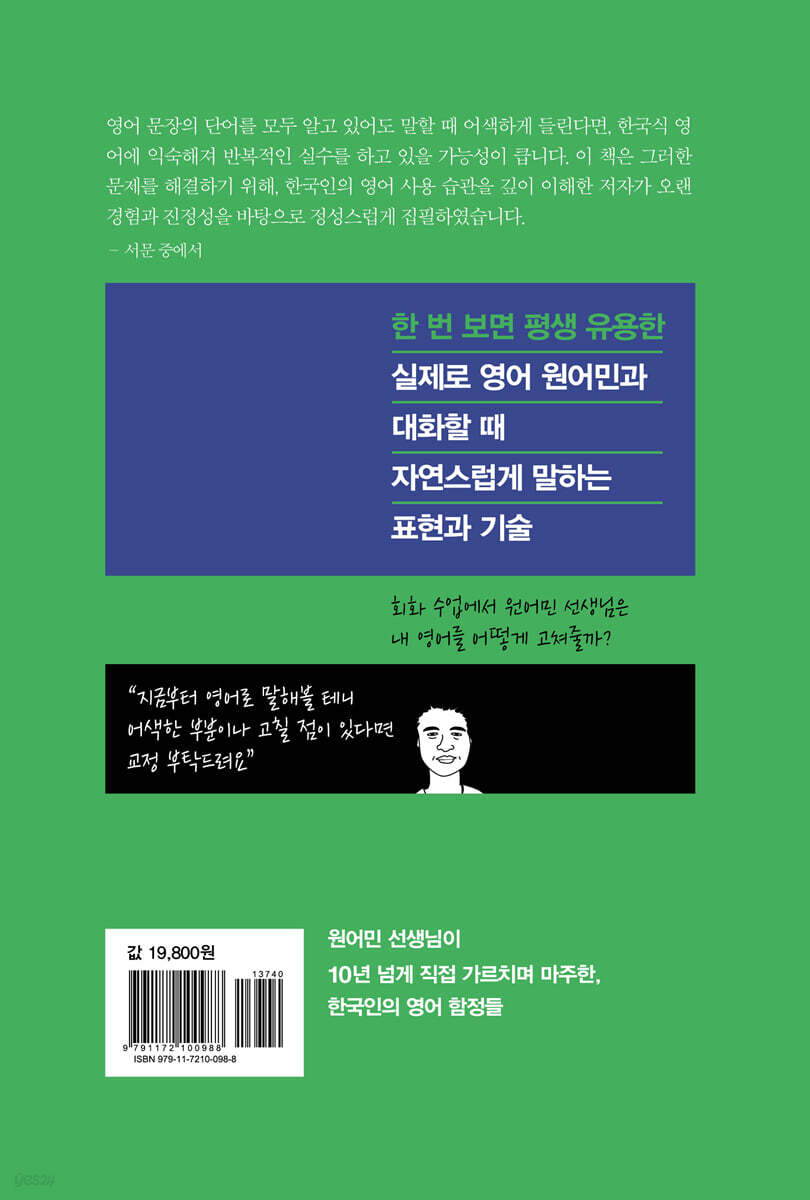많은 한국인 영어 학습자들이 오랜 시간과 노력을 들였음에도 어딘가 어색한 영어를 사용하고 있다고 느낍니다. 이는 단순한 어휘나 문법의 문제가 아니라, 한국어와 영어의 구조적 차이에서 비롯된 문제이며, 한국어식 사고방식을 그대로 영어에 적용하면서 발생하는 현상입니다. 예를 들어, 한국어로는 "시간이 부족해"라고 표현하지만, 이를 직역해 "Time is not enough"라고 하면 원어민에게는 어색하게 들립니다. 원어민은 "I don't have enough time"이라고 표현하는 것이 자연스럽습니다. 이처럼 두 언어 간의 결정적인 구조적 차이를 이해하고, 영어식 사고방식을 체득하는 것이 자연스러운 영어 구사의 핵심입니다. 이 책은 지난 10여 년 동안 약 1,000명의 한국인 학습자들을 지도해 온 저자가 공통적으로 반복되는 실수 패턴을 분석하고, 이를 극복하는 실질적인 방법을 제시한 결과물입니다. 특히, 한국어식 문장 구조로 인해 발생하는 어색한 표현을 원어민처럼 자연스럽게 바꾸는 전략을 상세히 다룹니다. 또한, 문화적 차이에서 비롯된 언어적 어색함도 집중적으로 분석합니다. 예를 들어, 한국어에서 흔히 쓰는 "고생하셨습니다"를 직역해 "You worked hard"라고 하면 원어민에게는 어색하게 들릴 수 있습니다. 이럴 때는 "I appreciate your effort" 또는 "That must have been tough"처럼 표현하는 것이 훨씬 자연스럽습니다. 이 책은 단순한 문법 설명서가 아닙니다. 한국인 학습자들이 쉽게 빠지는 오류를 정확히 짚어내고, 보다 효과적인 영어 의사소통이 가능하도록 돕는 실용적인 학습서입니다. 영어를 오랫동안 공부했지만 여전히 문장이 어색하다고 느끼는 학습자, 어디가 문제인지 알지만 어떻게 고쳐야 할지 모르는 학습자, 그리고 한국어식 영어에서 벗어나 원어민처럼 자연스럽고 유창한 영어를 구사하고 싶은 모든 사람들에게 이 책이 강력한 해결책이 될 것입니다. 한국어에서는 ‘약속’이라는 단어를 정말 다양한 상황에서 폭넓게 사용하죠? 그런데 영어에서는 ‘약속’이라는 개념이 언제, 어떤 상황에서 이루어지는가에 따라 다른 단어를 써야 해요. 이것이 영어를 배우는 재미이기도 하죠. promise는 보통 한국어로 ‘약속’으로 해석하지만, 사실 영어에서는 promise가 좀 더 무거운 의미를 가져요. 맹세하거나 반드시 지키겠다는 다짐을 할 때 주로 사용하는 단어죠. 예를 들어, I will never break my promise to you.(내 약속을 절대 어기지 않을 거예요) 라는 문장에서처럼 꼭 지키겠다는 다짐을 나타낼 때 사용하면 딱 맞아요. 반면에 친구와의 만남처럼 가벼운 약속을 표현할 때는 promise를 쓰면 조금 어색하게 들릴 수 있어요. 이런 경우에는 plans라는 단어를 사용하는 것이 더 자연스러워요. plans는 주로 친구나 가족과 함께하는 사교적인 약속을 표현할 때 잘 어울리는 단어예요. 예를 들어, I have plans with friends tonight. (오늘 밤에 친구들과 만나기로 했어요)처럼 사용할 수 있답니다. 약속의 종류와 상황에 따라 단어를 달리 사용하는 것이 영어의 섬세한 매력이에요. 주의하세요! 영어에서는 친구와의 약속을 표현할 때 단수형 plan보다는 복수형 plans를 사용하는 것이 더 자연스러워요. 왜 그럴까요? 친구와의 만남은 보통 한 가지 활동만 하는 것이 아니라 저녁을 먹고, 카페에 가고, 이야기를 나누는 등 여러 활동을 포함하기 때문이에요. 그래서 I have plans with a friend.라고 말하면 ‘친구와 여러 활동을 계획한 약속이 있다’는 의미로 자연스럽게 들려요.반면에 I have a plan with a friend.라고 하면 어떨까요? 이 표현은 친구와의 약속을 말한다기보다는 특정한 단일한 계획을 암시하게 되어 다소 어색하게 들릴 수 있어요. 사실 I have a plan.은 주로 큰 목표나 구체적인 계획을 강조할 때 사용돼요. 예를 들어, I have a plan to study abroad.라고 하면 ‘유학을 가겠다’란 구체적인 계획을 말하는 거예요. |