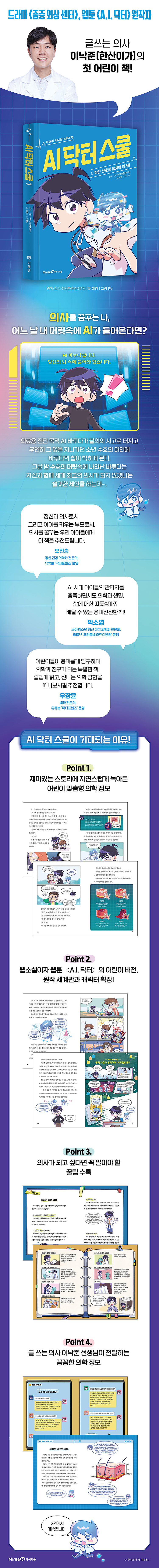 어린이 버전 메디컬 스토리북으로 재탄생! 학교와 병원을 넘나들며 실제 상황처럼 벌어지는, 쉽고 재미있는 의사와 의학 이야기 제10회 SF 어워드 2023 웹소설 부문 대상 수상작이자 인기리에 연재 중인 동명의 웹툰 「A.I. 닥터」를 모티브로 삼은 감동적인 성장 스토리 SF 메디컬 웹소설이자 웹툰인 「A.I. 닥터」는 내과 의사 이수혁의 머리에 불의의 사고로 진단 목적 인공 지능(AI) 바루다가 박히면서 시작됩니다. 딥러닝을 계속해 세계 최고의 진단 인공 지능이 되는 것이 목적인 바루다와 어려운 환경에서도 악착같이 노력해 온 수혁, 그들은 의기투합해 환자를 치료해 나가며 세계 최고의 내과 의사를 꿈꾸지요. 「AI 닥터 스쿨」은 「A.I. 닥터」를 어린이 버전으로 재구성한 것으로, 외톨이 주인공이 AI 바루다를 탑재하며 자신감을 찾고, 주변 사람과 관계를 맺고 성장해 나가는 기본적인 스토리를 유지합니다. 하지만 어린이 독자들이 더 공감할 수 있도록, 어린이가 취약한 병이나 증상(수족구, 가와사키 병, 백일해, ADHD, 틱, 소아 우울증, 사춘기 등)을 다루고 있으며, 어린이들의 일상생활과 더 밀접한 학교나 보건 교실, 소아과를 무대로 이야기가 진행됩니다. 원작과 달리 「AI 닥터 스쿨」의 주인공은 아직 어린아이일 뿐이지만, AI에게 배운 지식을 토대로 환자를 발견 혹은 진단하고, 가끔 실수도 하고 고민도 하는 성장형 캐릭터로, 어린이 독자들에게 동질감과 자신감을 심어 줄 것입니다. 글 쓰는 의사이자, 유튜브 크리에이터 이낙준이 만드는 첫 번째 어린이 도서 「AI 닥터 스쿨」의 전반적인 뿌리가 되는 「A.I. 닥터」의 저자 이낙준은 이비인후과 의사이자, 구독자 133만 명의 의학 채널 ‘닥터프렌즈’의 크리에이터, 웹소설 작가로 활발하게 활동 중입니다. 「AI 닥터 스쿨」에서는 전반적인 기획 및 감수를 맡아, 현직 의사만이 할 수 있는 생생한 직업적 경험과 정확한 의학 지식, 의사로서의 고뇌를 전달합니다. 특히 닥터프렌즈가 유익한 의학 정보들을 친구와 이야기하듯 흥미롭고 알기 쉽게 전달하는 것을 목표로 하는 유튜브 콘텐츠인 만큼 「AI 닥터 스쿨」에서도 어린이들에게 유익하고도 흥미로운 의학 정보들이 많이 수록될 예정입니다. 실제 의료 현장 못지않은 생활 밀착형 어린이 맞춤 의료 현장을 담은 생생하고 흥미진진한 스토리 초등학생인 나에게 어느 날 머릿속에서 의학 지식을 속삭여 주는 존재가 생긴다면? 이라는 상상에서 출발한 이 책은 사람의 생명과 몸에 관심 있는 어린이들을 위한 책입니다. 인체의 신비나 병에 대해 다룬 기존 책들은 많지만, 이 책의 차이점은 의사라는 직업에 대해 생각해 보고 그들의 활동 무대에 직접 뛰어들어 보다 생생하게 체험할 수 있다는 점입니다. 주인공이 어린이인 만큼 성인 의사처럼 전문 지식을 발휘해 진단 및 치료를 할 순 없지만 인공 지능의 힘을 빌려 일상생활 속에서 자연스럽게 환자들을 발견하고, 진찰, 진단하고 나중에는 치료까지 하며 실제 병원 현장 못지않은 현장감을 느낄 수 있을 것입니다. 또한 흥미진진한 스토리와 세계관이 의학 정보와 적절히 균형을 이루고 있어, 어린이 독자들이 자연스럽게 의학 지식을 쌓고 의사의 생활을 간접적으로나마 체험할 수 있게 하는 것도 이 책의 특장점입니다. 본문에서 미처 다루지 못한 부가적인 의학 정보는 챕터 마지막에 정보 페이지의 형식으로 다룹니다. 초·중학교 희망 직업 5위 안에 항상 랭크되는 직업 ‘의사’ 의사란 어떤 직업이며 구체적으로 어떤 일들을 하는 걸까? 라는 질문에 답하다. 미래는 과학과 의학이 중요한 시대이기에 의대 진학이나 의사라는 직업에 관심이 집중되고 있습니다. 이 책은 의사가 되고 싶거나 의대 진학을 목표하는 어린이들에게 의학의 기본 지식과 의사의 세계를 보여줍니다. 우리의 일상과 밀접하지만 언제든지 위기로 변할 수 있는 현장에서의 경험을 통해 의사의 일과 생활을 체험할 수 있기에 새로운 직업에 대한 호기심도 키우고, 실제 직업을 갖게 된다면 어떨지 상상해 볼 수 있을 것입니다. 마치 예비 의사가 된 것처럼 환자를 진단하고, 나아가 치료까지 하면서 환자들과 신뢰를 쌓고, 동료들과 소통하고 유대를 형성하는 모습은 막연하게 의사를 꿈꾸던 어린이들에게 동기 부여가 될 것입니다. 의사란 어떤 직업이며 구체적으로 어떤 일을 하고, 어떻게 하면 의사가 될 수 있는지 등 의사가 되고 싶은 어린이들에게 주는 유용한 팁은 정보 페이지에서 확인할 수 있습니다. |