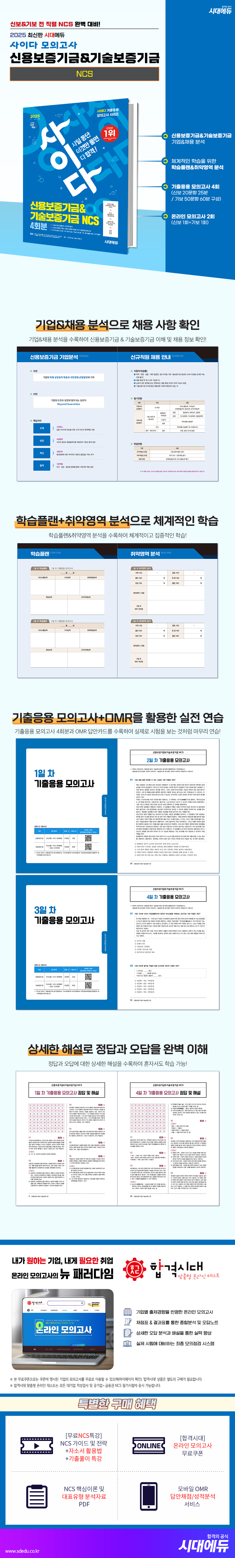 2. 기출응용 모의고사 모의고사 4회분 수록 3. 회당 20문항 25분(신용보증기금) & 50문항 60분(기술보증기금)으로 기금별 맞춤 구성 4. 온라인 모의고사 2회분 무료 제공 [특별혜택] 무료NCS특강, NCS 핵심이론 및 대표유형 분석자료, 온라인 모의고사 무료쿠폰, 모바일 OMR 답안채점/성적분석 서비스 신용보증기금과 기술보증기금은 2025년에 신입직원을 채용할 예정이다. 신용보증기금의 채용절차는 「입사지원서 접수 → 서류전형 → 필기전형 → 온라인 인성검사 → 면접전형 → 신체검사 및 결격사유조회 → 최종합격자 발표」 순서로 이루어진다. 필기전형은 일반전형의 경우 직업기초능력ㆍ직무전공ㆍ논술로 진행하며, 특별전형의 경우 직업기초능력ㆍ논술로 진행한다. 그중 직업기초능력은 의사소통능력ㆍ수리능력ㆍ문제해결능력 총 3개의 영역을 평가하며, 직무전공은 분야별 내용이 다르므로 반드시 확정된 채용공고를 확인해야 한다. 또한 논술은 직무분야 전공 및 직무 수행과 연관하여 평가한다. 기술보증기금의 채용절차는 「입사지원서 접수 → 서류전형 → 필기전형 → 1차 면접 → 2차 면접 → 신체검사 및 신원조회 → 최종 합격자 발표」 순서로 이루어진다. 필기전형은 직업기초능력평가와 직무수행능력평가로 진행한다. 그중 직업기초능력평가는 의사소통능력ㆍ수리능력ㆍ문제해결능력ㆍ정보능력ㆍ조직이해능력 등 총 5개의 영역을 평가한다. 또한 직무수행능력평가는 부문별 내용이 다르므로 반드시 확정된 채용공고를 확인해야 한다. |
