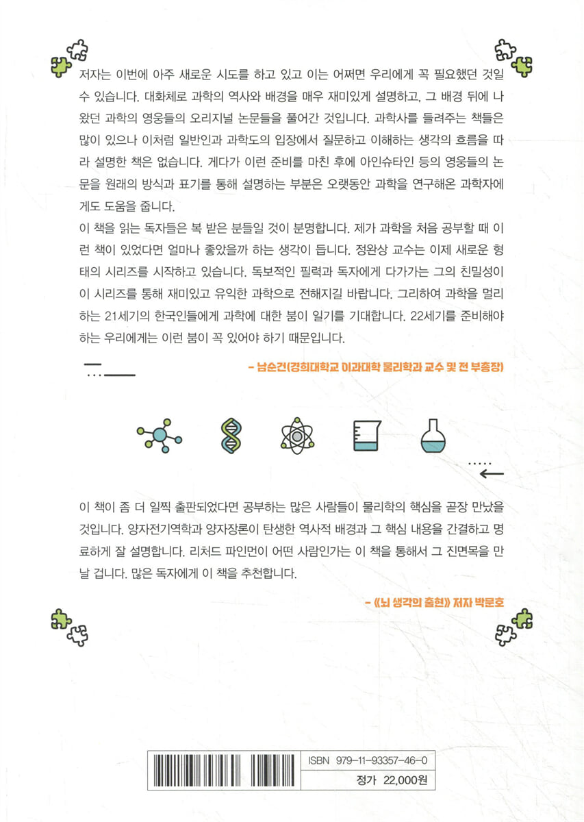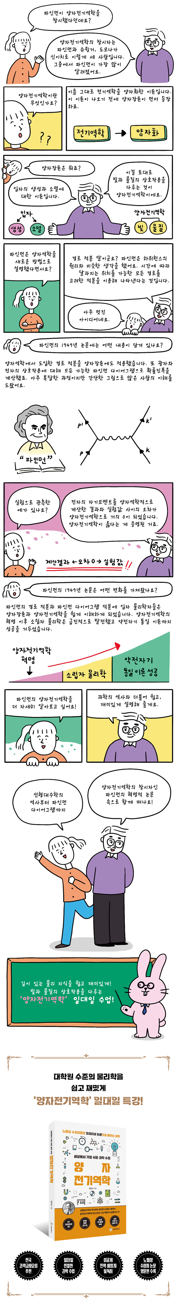이 책이 좀 더 일찍 출판되었다면 공부하는 많은 사람들이 물리학의 핵심을 곧장 만났을 것입니다. 양자전기역학과 양자장론이 탄생한 역사적 배경과 그 핵심 내용을 간결하고 명료하게 잘 설명합니다. 리처드 파인먼이 어떤 사람인가는 이 책을 통해서 그 진면목을 만날 겁니다. 많은 독자에게 이 책을 추천합니다. - 박문호 (《뇌 생각의 출현》 저자)
