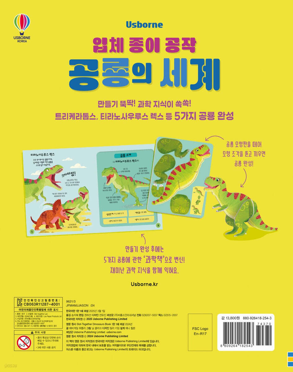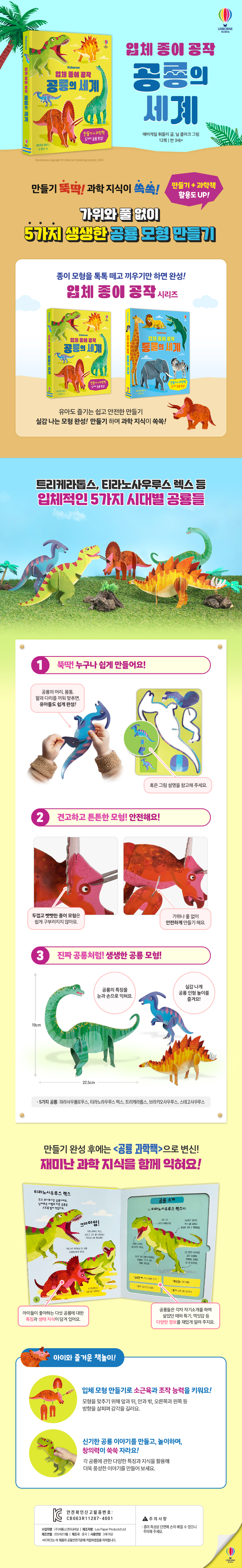 재미난 과학 지식을 함께 익혀요! 모형판을 떼어 내면 흥미진진한 ‘공룡 소개’가 나타나요. 쥐라기부터 백악기까지 각 시기를 대표하는 브라키오사우루스, 스테고사우루스, 파라사우롤로푸스, 트리케라톱스, 티라노사우루스 렉스에 대한 특징과 생태 지식이 담겨 있어요. 공룡들은 각자 자기소개를 하며 살았던 때와 특기, 먹잇감 등 다양한 정보를 알려 주어요. 재미난 만들기를 하는 사이, 공룡들에 관한 지식을 쏙쏙 익힐 수 있답니다. 공룡 모형 만들기는 끼웠다 다시 뺐다가 여러 차례 즐길 수 있고, 만들기 완성 후에는 ‘공룡 과학책’으로 활용할 수 있어요. ◆ 입체 모형 만들기로 소근육과 조작 능력을 키워요! 만들기는 직관적으로 구성되어 있어 머리, 몸통, 팔과 다리를 연결하거나 그림 설명을 참고하면, 유아들도 쉽게 완성할 수 있어요. 모형판을 떼고 모형 조각을 연결하는 과정에서 소근육과 조작 능력이 발달하지요. 모형을 맞추기 위해 앞과 뒤, 안과 밖, 오른쪽과 왼쪽 등 방향을 요리조리 살피며 감각을 기를 수 있어요. 마침내 5가지 모형을 완성한 뒤에는 성취감을 얻게 될 거예요. ◆ 신기한 공룡 이야기를 만들고, 놀이하며, 창의력이 쑥쑥 자라요! 완성된 공룡 모형을 세워서 신기한 공룡 이야기를 만들어 보세요. 먹고 먹히는 관계가 되기도 하고, 서로 도우며 살아가는 관계를 이루기도 하지요. 앞서 익힌 각 공룡에 관한 다양한 특징과 지식을 활용하여, 이를 토대로 더욱 풍성한 이야기를 만들어 나갈 수 있을 거예요. 가족, 친구들과 함께 서로의 역할을 정하고, 재미난 공룡들의 이야기를 만들어 나가는 사이 창의력과 상상력이 쑥쑥 자라난답니다. |
