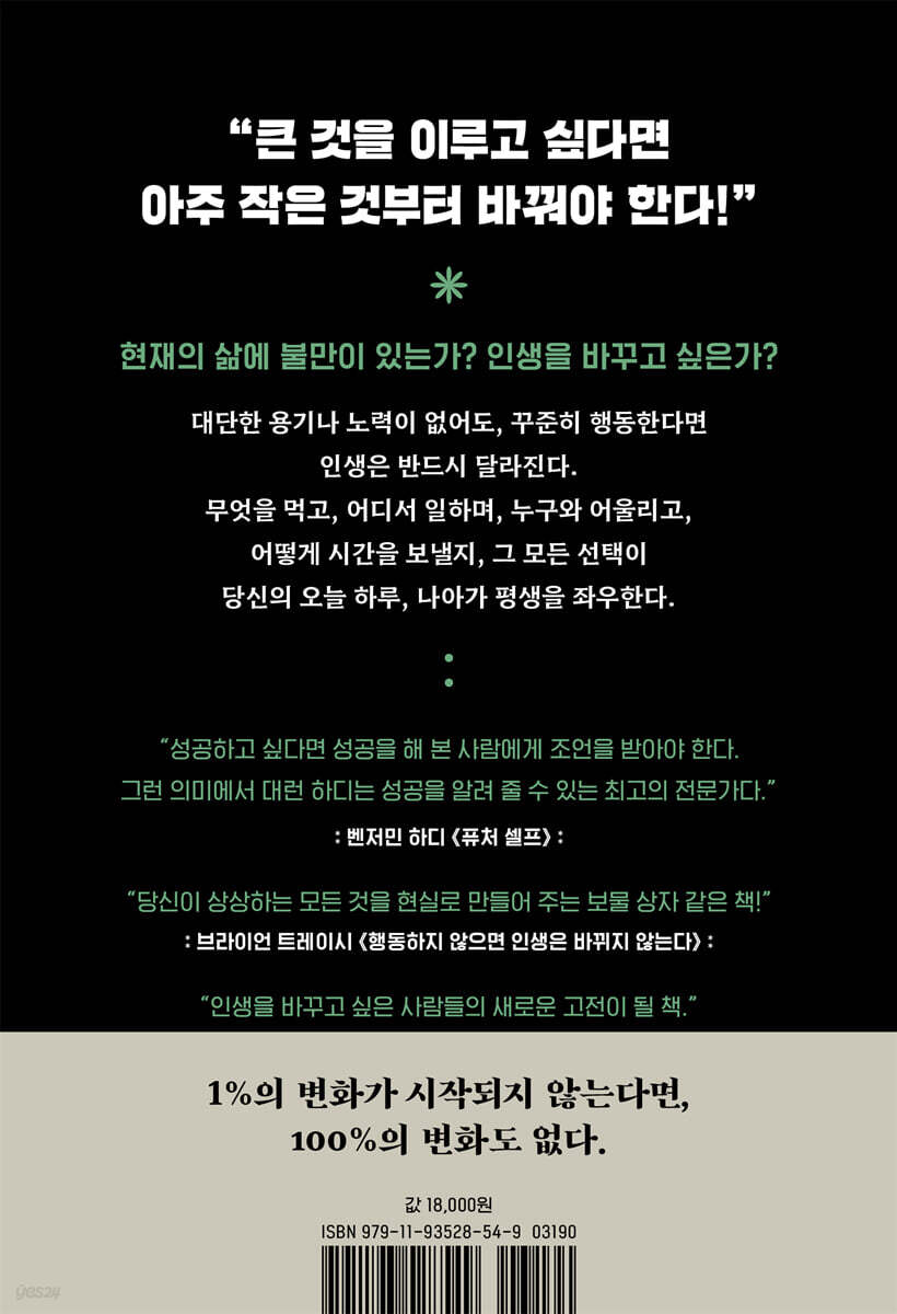 내가 추천하는 역대 최고의 자기계발서 중 하나. 이 책이 알려 주는 컴파운드 이펙트는 사소해 보이는 아주 작은 행동에서 막대한 보상을 얻는 경이로운 전략이다. 당신은 더 많은 것을 배울 필요가 없다. 당신에게 필요한 것은 당신이 가진 정보를 이 책의 원리에 따라 행동으로 옮기고 실현하는 일뿐이다. - 제임스 클리어 (《아주 작은 습관의 힘》 저자)