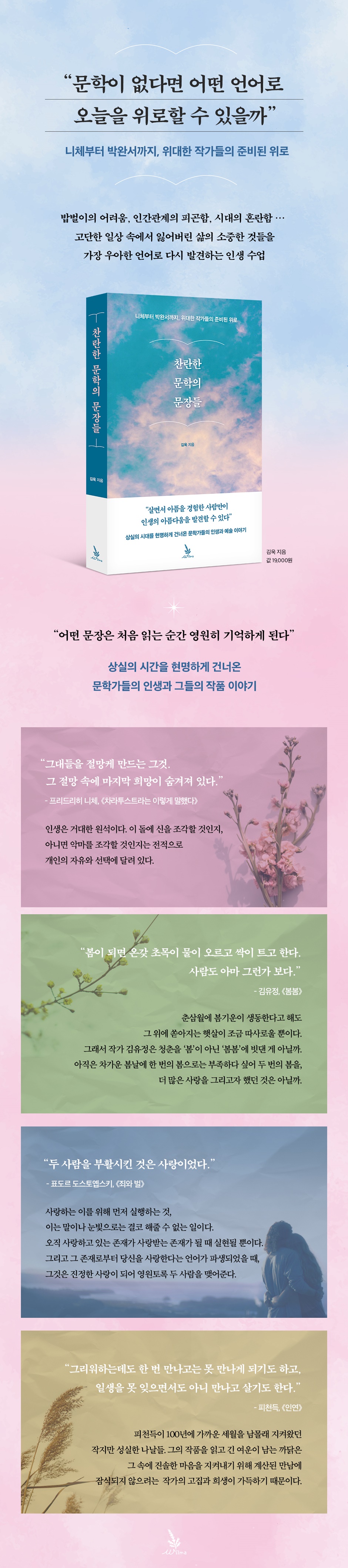 들어가는 말 - 이토록 깊고 찬란한 문학이란 이름의 위로 1장. 살면서 흔들리지 않는 사람은 없다내일은 오늘보다 더 나빠질 수도 있겠지만 - 프리드리히 니체,『차라투스트라는 이렇게 말했다』 분노가 필요한 순간들 - 이육사,『육사시집』엄마와 여자, 사회인의 갈림길에서 - 박완서,『그 많던 싱아는 누가 다 먹었을까』세상이 엉망이어도 나까지 엉망일 순 없다 - 스피노자,『에티카』보상을 바라기 전에 최선의 노력을 다한다 - 최명희,『혼불』 우리를 살아가게 만드는 힘- 천경자,『내 슬픈 전설의 49페이지』2장. 오늘이 고단한 건 다 밥벌이 때문이다직업이라는 빈집을 떠나지 못하는 자들에게 바치는 위로 - 기형도,〈빈집〉유혹에 빠지는 이유 - 서정주,〈자화상〉아직 늦지 않았다는 믿음 - 마쓰모토 세이초,『어느 고쿠라 일기전』떫은 삶 뒤에 가려진 깊은 향내를 기다리며 - 천상병,『새』함께 살아간다는 것이 때로는 ‘뺄셈’일지라도 - 김소월,〈진달래꽃〉실패할 기회조차 가져보지 못한 청춘의 우울 - 전성태,〈태풍이 오는 계절〉3장. 언제나 문제는 사랑과 사람어떤 봄은 차갑다-김유정,〈봄봄〉사랑은 사랑으로 사람은 사람으로 구원받는다 - 표도르 도스토옙스키,『죄와 벌』그럼에도 불구하고 생명은 지속되어야 한다 - 박경리,『토지』이기심의 유혹 속에서 살아가는 고통 - 알베르트 슈바이처,『물과 원시림 사이에서』인간은 서로를 비춘다 - 장 그르니에,『카뮈를 추억하며』인생을 고독하게 만드는 것들 - 백석, 남신의주 유동 박시봉방〉성실함으로 지켜내는 우리의 인연 - 피천득,『인연』더불어 사는 것이 고통으로 변질된 시대를 위로하며 - 양귀자,『원미동 사람들』4장. 암울한 시대를 현명하게 건너는 법나의 삶을 누군가에게 빼앗긴 것은 아닐까 - 프란츠 카프카,『변신』세상에 길들여지거나 세상이 내 앞에 굴복하거나 - 신경림,『농무』누가 진짜 바보인가 - 레프 톨스토이,『바보 이반』사회라는 거대한 시험대 위에 서 있는 이들에게 - 김동리,『무녀도』끝까지 눈감지 않기를, 침묵하지 않기를 - 김정한,〈사하촌〉 연결, 개인을 살아가게 하는 푸른 희망-심훈,『상록수』상처를 웃음으로 넘기는 슬픔- 이문구,『내 몸은 너무 오래 서 있거나 걸어왔다』5장. 찬란하며 자유로운 인생을 위한 태도절망에 익숙해져서는 안 된다 - 가오싱젠,『창작에 대하여』세상을 향해 금지된 여행을 떠나며 - 이사벨라 버드,『한국과 그 이웃 나라들』마음의 힘으로 살아가는 법을 깨닫다 - 소노 아야코, 『나이듦의 지혜』 직선의 삶을 꿈꾸며 곡선의 삶을 받아들이는 용기 - 이윤기,『숨은 그림 찾기』누구를 위하여 성장하는가 - 헤르만 헤세, 『수레바퀴 아래서』본문에서 인용한 글과 책
