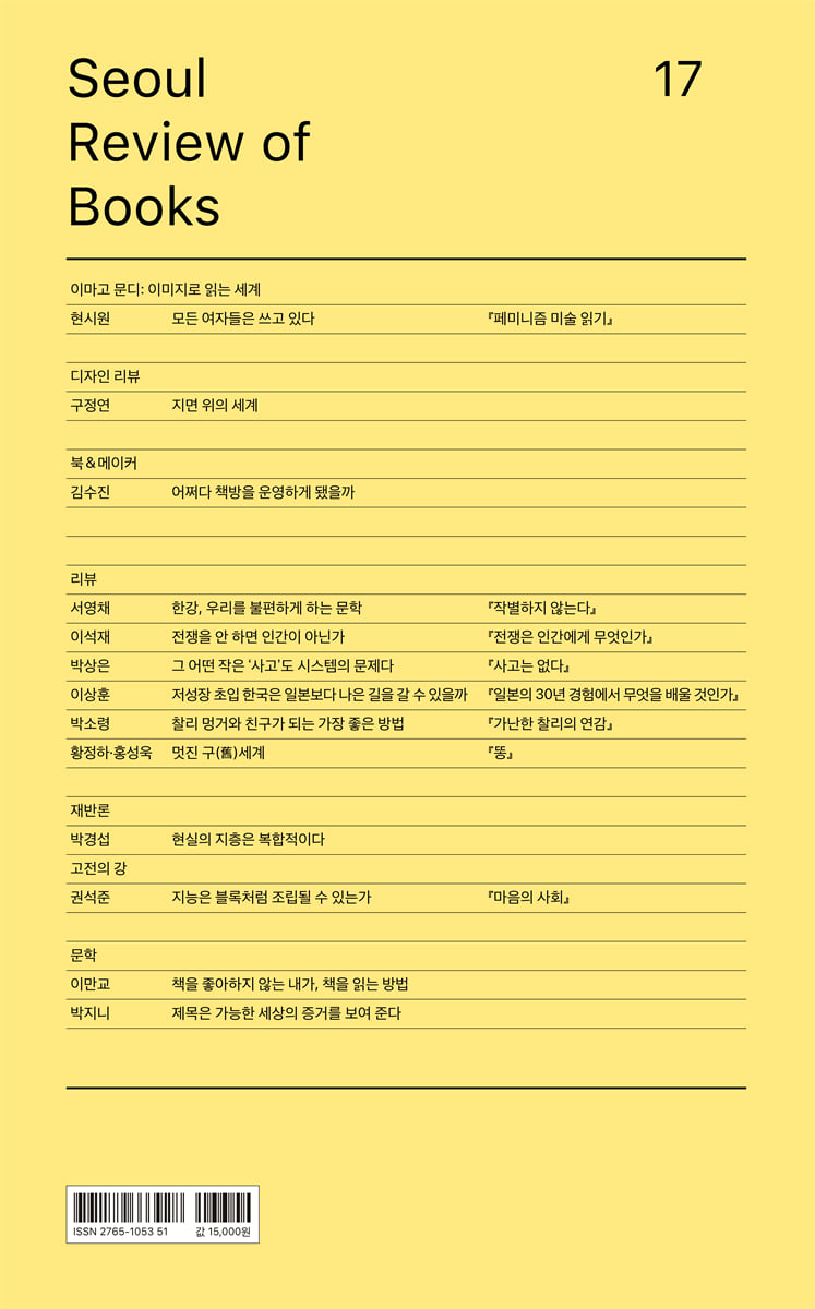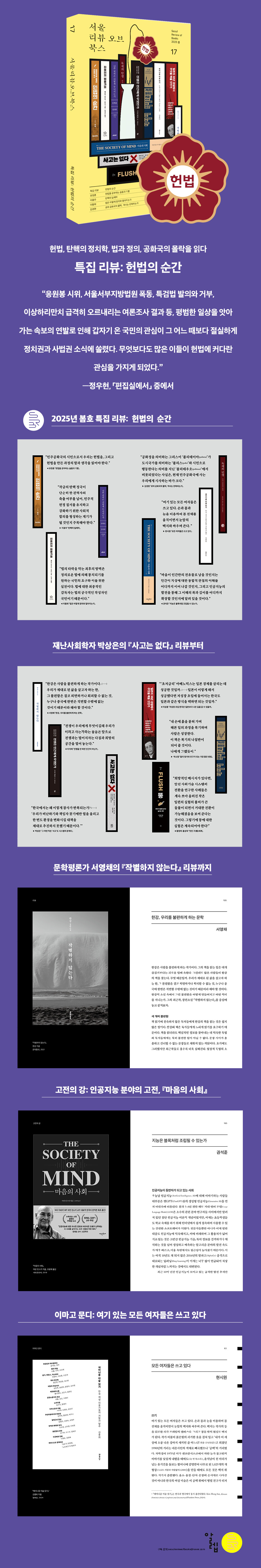 헌법, 탄핵의 정치학, 법과 정의, 공화국의 몰락을 읽다 ‘특집 리뷰: 헌법의 순간’ 한강 작가의 문학 세계, 참사와 재난, 인간과 전쟁의 관계까지 오늘의 이슈를 책으로 읽는 ‘리뷰’ 2021년 3월 창간의 돛을 올린 《서울리뷰오브북스》가 2025년 봄 17호로 창간 4주년을 맞는다. 창간 4주년을 맞아 펴내는 17호의 특집 주제는 ‘헌법의 순간’이다. 2024년 12월 3일 비상계엄 사태로 한국 사회는 다시 한번 ‘헌법의 순간’을 맞이했다. 비상계엄 선포와 해제, 탄핵 소추안 발의와 의결, 초유의 현직 대통령 체포·구속영장 발부와 집행, 내란 혐의 수사와 헌법재판소의 심판, 그리고 극한의 사회적·정치적 갈등과 대립을 마주하며 상당수의 국민이 다시금 헌법을 공부하고, 헌정 질서의 회복을 희망하며, 개헌을 논의하고 있다. 이러한 헌법의 순간 한복판을 지나며, 《서울리뷰오브북스》는 특집 리뷰를 통해 헌법, 탄핵의 정치학, 법과 정의의 관계, 공화국 몰락의 역사를 다루는 네 권의 책을 소개한다. 편집위원 유정훈은 제헌헌법이 만들어지는 20일의 역사에 주목한 박혁의 『헌법의 순간』을, 제21대 국회의원을 지낸 이용우는 비상계엄 선포 한 달 전 출간되어 그 시의성이 더욱 높아진 이철희의 『나쁜 권력은 어떻게 무너지는가』를, 헌법학자 이황희는 바이마르공화국의 법률가들이 나치의 법체제 수립과 폭력적 권력 행사를 정당화한 과정을 추적한 헤린더 파우어-스투더의 『히틀러의 법률가들』을, 역사학자 김경현은 로마 공화정의 몰락으로부터 오늘날 민주주의 위기의 시사점을 찾는 에드워드 와츠의 『독재의 탄생』을 리뷰한다. ‘리뷰’ 코너에서는 지난 한 해 한국 사회를 강타한 이슈들을 다룬 책들을 소개한다. 문학평론가 서영채는 『작별하지 않는다』를 중심으로 한국인 최초, 아시아 여성 최초 노벨 문학상을 수상한 한강 작가의 문학 세계를 논한다. 편집위원 이석재는 러시아-우크라이나 전쟁과 이스라엘-하마스 전쟁 등 전쟁이 지속되는 현실을 마주하며, 역사학자 마거릿 맥밀런의 『전쟁은 인간에게 무엇인가』를 읽었다. 재난사회학자 박상은은 제시 싱어의 『사고는 없다』를 다루며 ‘한국에서는 왜 이렇게 참사가 반복되는가?’라는 질문의 답을 구한다. 이 밖에도 ‘이마고 문디’ 코너에서는 편집위원 현시원이 큐레이터 김홍희의 『페미니즘 미술 읽기』를 통해 동시대 한국 여성 미술의 지형을 조망하고, ‘북&메이커’ 코너에서는 올해로 10년을 맞은 큐레이션 서점 ‘어쩌다 책방’의 김수진 디렉터가 자신과 어쩌다 책방의 지난 시간을 회고한다. 특집 리뷰: 헌법의 순간 “응원봉 시위, 서울서부지방법원 폭동, 특검법 발의와 거부, 이상하리만치 급격히 오르내리는 여론조사 결과 등, 평범한 일상을 앗아 가는 속보의 연발로 인해 갑자기 온 국민의 관심이 그 어느 때보다 절실하게 정치권과 사법권 소식에 쏠렸다. 무엇보다도 많은 이들이 헌법에 커다란 관심을 가지게 되었다.” - 정우현, 「편집실에서」 중에서 12·3 비상계엄 사태 이후, 한국 사회는 어디로 나아가고 있는가? 또, 어디로 나아가야 하는가? 이번 호 특집 리뷰에서는 ‘헌법의 순간’을 지나는 지금, 우리에게 나침반이 되어 줄 네 권의 책을 만나본다. 편집위원 유정훈은 『헌법의 순간』을 통해 77년 전 제헌국회가 대한민국의 헌법을 심의하고 통과시킨 과정을 돌아보며 헌법을 만든 과정의 말과 생각을 읽는다. 제21대 국회의원을 지낸 이용우는 『나쁜 권력은 어떻게 무너지는가』를 읽으며 탄핵 제도의 양면성과 작금의 탄핵 사태에 정치적, 사회적 합의가 필요한 이유를 논의한다. 헌법학자 이황희는 『히틀러의 법률가들』을 통해 법이 어떻게 독재를 옹호하고 정의와 멀어질 수 있는지 살펴본다. 역사학자 김경현은 『독재의 탄생』을 다루며 지금은 로마 공화국의 몰락을 돌아보며 공화국의 실패가 초래할 결과에 대해 유의할 필요가 있는 엄중한 순간임을 이야기한다. “민주공화국의 시민으로서 우리는 헌법을, 그리고 헌법을 만든 과정의 말과 생각을 읽어야 한다.” 유정훈(본지 편집위원, 변호사)은 「헌법을 공부하는 슬픔과 기쁨」에서 박혁의 『헌법의 순간』을 리뷰한다. 유정훈은 77년 전 제헌국회가 대한민국의 헌법을 심의하고 통과시킨 과정을 돌아보며 제헌국회 회의록이 지금의 헌법적 문제를 해결하는 데 필요한 살아 있는 자료라는 점을 재발견한다. 나아가 전 국민이 헌법을 공부하는 초유의 사태 속에서 민주공화국의 시민으로서 헌법과 헌법을 만든 과정의 말과 생각을 읽어야 한다고 주장한다. “현재 진행 중인 탄핵에 왜 정치적, 사회적 합의가 필요한지 이 책은 질문을 던진다.” 이용우(제21대 국회의원, 전 카카오뱅크 공동대표)는 「탄핵의 딜레마: 민주주의를 지키는 도구인가, 정치를 위협하는 제도인가」에서 이철희의 『나쁜 권력은 어떻게 무너지는가』를 다룬다. 이용우는 탄핵 제도가 민주주의를 지키는 도구인지 안정적인 정치를 위협하는 제도인지를 논하며 탄핵 정국의 복잡성을 지적한다. 또한, 탄핵 제도가 내재적으로 지니는 불완전성이 법적 정당성뿐만 아니라 
