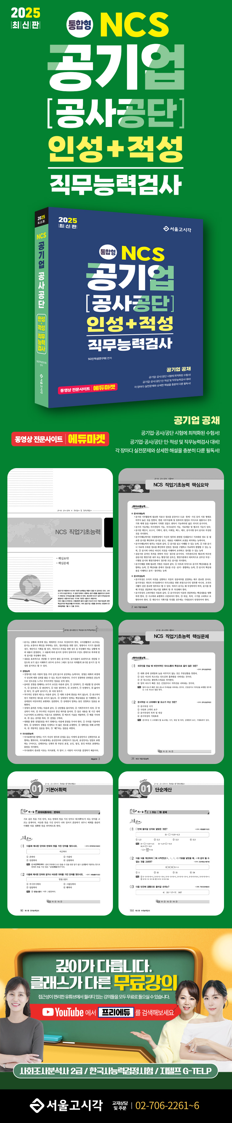 PART 01 언어능력검사 Chapter 01 기본어휘력 Chapter 02 언어 및 글의 이해 Chapter 03 문학의 이해 Chapter 04 한자능력 PART 02 수리능력검사 Chapter 01 단순계산 Chapter 02 응용계산력 Chapter 03 자료해석력 PART 03 추리능력검사 Chapter 01 문자 및 수열추리 Chapter 02 도형추리 Chapter 03 수적추리 Chapter 04 논리추리 Chapter 05 판단추리 PART 04 공간 및 지각능력검사 Chapter 01 사무지각능력 Chapter 02 공간지각능력 PART 05 상황판단능력 및 창의력검사 Chapter 01 상황판단능력검사 Chapter 02 창의력검사 PART 06 일반상식 Chapter 01 시사상식 Chapter 02 일반상식 PART 07 논술 및 자기소개서 Chapter 01 논술 Chapter 02 자기소개서 PART 08 면접 및 인성검사 Chapter 01 면접 Chapter 02 인성검사 |