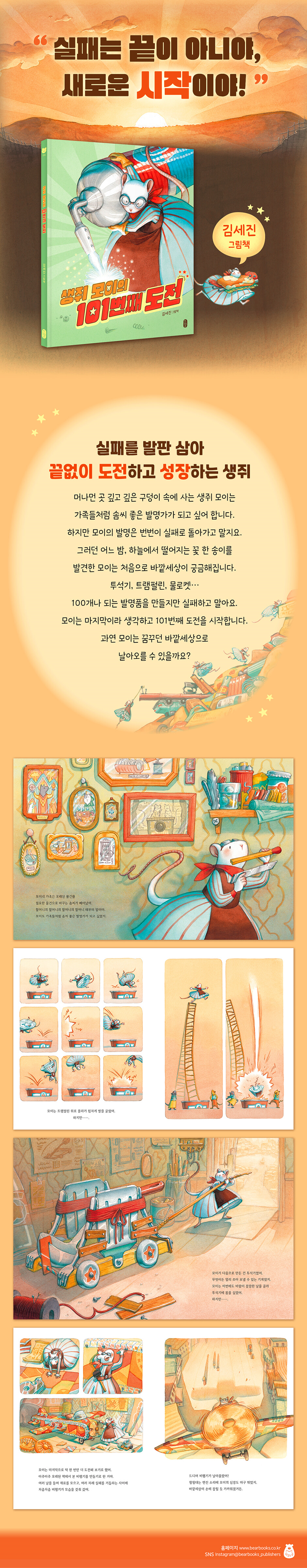 100번의 실패를 발판 삼아 101번째에 도전하는 생쥐 머나먼 곳 깊고 깊은 구덩이 속에 사는 생쥐 모이는 가족들처럼 솜씨 좋은 발명가가 되고 싶어 합니다. 하지만 모이의 발명품은 엉망진창으로 망가져 버리기 일쑤입니다. 그러던 어느 밤, 모이가 울적한 마음을 달래려 하늘을 올려다보고 있는데, 꽃 한 송이가 살포시 내려오는 게 아니겠어요! 꽃을 본 모이는 처음으로 바깥세상이 궁금해집니다. 가족과 친구들은 할머니의 할머니의 할머니 때부터 전해 오는 무시무시한 이야기들을 들려주며 말리지만 모이는 아랑곳하지 않습니다. 투석기, 트램펄린, 물로켓… 깊고 깊은 구덩이를 빠져나갈 갖가지 발명이 번번이 실패로 돌아가도 말이에요. 하지만 모이라고 지치지 않을 리는 없지요. 모이는 마지막으로 오래된 책에서 본 비행기를 만들기로 합니다. 마지막 도전마저 실패로 돌아가면 더는 바깥세상을 넘보지 않을 각오로요. 과연 모이는 101번째 도전으로 꿈꾸던 바깥세상으로 날아오를 수 있을까요? “실패해도 괜찮아! 세상에 의미 없는 도전은 없어.” 생쥐들은 버려진 물건을 재활용해 집을 짓고, 도구를 만듭니다. 유리병으로 만든 집, 알람 시계로 만든 식당, 알루미늄 캔으로 만든 자동차까지?누군가에게는 쓸모없어진 물건이지만, 생쥐들의 기발한 아이디어는 이를 새로운 가능성으로 바꿉니다. 모이 역시 버려진 물건들을 활용해 자신을 구덩이 밖으로 데려다줄 발명품을 만듭니다. 낡은 천과 통조림 깡통으로 트램펄린을 만들고, 스테인리스 뒤집개와 포크, 국자를 조합해 투석기를 만들어 보지만 실패는 계속됩니다. 1번째, 2번째, 3번째… 자그마치 100번째까지요. 하지만 모이는 포기하지 않고 101번째 도전을 준비합니다. 실패는 끝이 아니라 새로운 출발점이자 성공의 디딤돌이니까요. 넘어져도 다시 일어나고, 방법을 바꿔가며 도전을 멈추지 않는 모이의 모습은 결코 포기하지 않는 용기와 끝없는 호기심이 얼마나 멋진 결과를 불러오는지 보여 주지요. 이 책을 읽는 여러분도 모이와 함께 도전하는 즐거움을 느끼고, 실패를 두려움이 아닌 새로운 시작으로 받아들일 수 있으면 좋겠습니다. 어둠을 넘어 희망으로, 빛을 향해 날아오를 당신에게 김세진 작가는 따뜻한 색감과 섬세한 그림으로 모이의 도전을 생동감 있게 담아냈습니다. 사실 이 그림책을 만드는 동안 김세진 작가 역시 모이였습니다. 《생쥐 모이의 101번째 도전》을 출간하기까지, 2년이 넘는 작업 기간 동안 수많은 도전과 실패를 거듭해 왔거든요. 실패를 거듭해도 결코 좌절하지 않고 또 다른 방법을 찾아내며 앞으로 나아가는 모이처럼, 김세진 작가도 끊임없이 도전한 끝에 마침내 첫 그림책을 세상에 선보이게 되었습니다. 이 책의 주조색으로 쓰인 주황과 청록은 거듭되는 도전에 따른 모이의 감정 변화를 더욱 선명하게 보여 줍니다. 주황빛은 모이의 열정과 희망을 상징하며, 실패를 딛고 다시 도전할 때마다 더욱 빛을 발합니다. 반면 청록빛은 깊고 어두운 구덩이 속 마을을 감싸며, 모이가 넘어서야 할 한계와 두려움을 나타내지요. 모이의 도전이 이어질수록 주황빛은 점점 더 넓게 퍼지고, 드디어 바깥세상으로 나서나 싶은 순간 구덩이를 가득 채웁니다. 모이의 열정과 희망을 담은 이 주황빛은 마침내 노란 꽃과 황금빛 햇살이 가득한 세상으로 이어지지요. 모이의 끝없는 도전은 희망의 빛을 따라가는 과정이며, 도전의 가치를 아름답게 보여 줍니다. 모이의 도전이나 다를 바 없는 작가의 도전이 없었다면 이 책도 세상에 나올 수 없었을 것입니다. 그렇게, 101번째 도전 끝에 마침내 모이는 날아올랐고, 작가의 그림책도 세상에 나와 여러분을 만나게 되었습니다. 자, 이제 모이와 함께 날아오를 준비가 되었나요? 모이의 끝없는 도전을 따라가며, 여러분도 꿈을 향한 첫걸음을 내디뎌 보세요! |