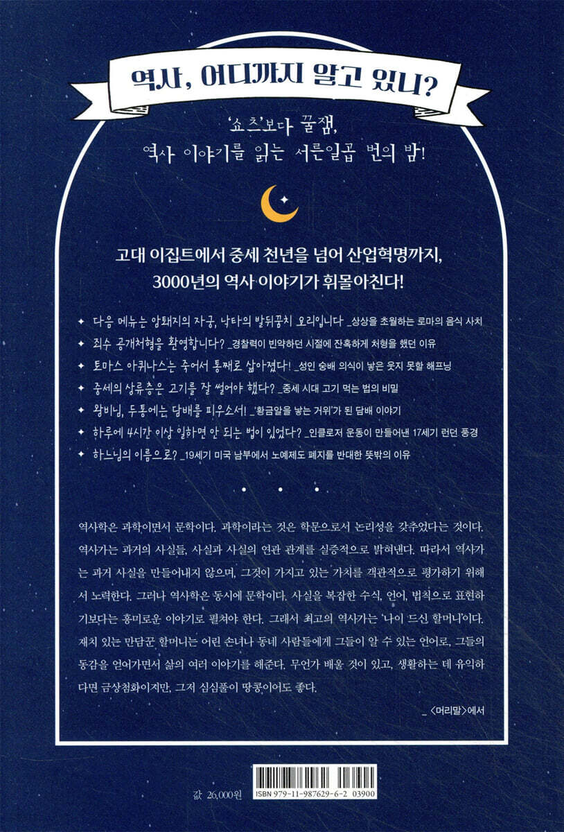 Ⅰ. 첫 번째 밤 : 고대 왕국과 제국, 그리고 민주주의 여자는 시장에서 장사하고 남자는 집에서 옷감 짜고 - 다른 나라와 풍습과 관습이 반대였던 고대 이집트의 이모저모 사자의 집, 사자의 몸 - 영원히 신비, 피라미드와 미라 이야기 크산티페는 남편의 죽음을 슬퍼했다? - 악처의 아이콘으로 오해받는 소크라테스의 아내를 위한 변명 저 젊은 처녀, 눈부신 넓적다리를 맨살로 드러내네 - 잘 먹고 일하지 않고 운동을 많이 했던 스파르타의 여성들 스파르타 병사들이 전투 전에 머리를 손질한 이유는? - 긴 머리를 초능력의 원천이라고 생각했던 고대인의 마인드 Ⅱ. 두 번째 밤 : 로마 제국 흥망사 자식을 팔거나 죽이는 것은 아버지의 권리였다 - 고대 세계의 아버지들은 왜 그토록 강력한 권한을 가졌을까? 배우가 된 그 황제는 정말로 폭군이었을까 - 로마에서 가장 미천한 직업이었던 배우로 무대에 선 네로의 기행에 대한 극과 극의 평가 양털은 깎아도 가죽은 벗기지 말라 - 피정복민을 관대하게 통치한 로마 제국의 정책 다음 메뉴는 암퇘지의 자궁, 낙타의 발뒤꿈치 요리입니다 - 먹기 위해 토하고, 토하기 위해 먹었던 로마의 음식 사치 검투 경기는 원래 장례식 이벤트였다? - ‘빵과 서커스’라는 말에 숨어 있는 로마의 검투 경기에 대한 오해와 진실 검투 경기 전에 동물을 죽이는 행위에는 의미가 있다? - 로마의 대규모 동물 도살에 숨어 있는 로마인의 진심 죄수 공개처형을 환영합니다? - 고대에서 전근대까지, 경찰력이 빈약하던 시절에 잔혹하게 처형을 했던 이유 Ⅲ. 세 번째 밤 : 중세 기독교의 이중생활 예수는 왜 십자가형을 받았을까 - 명예형인 참수형과 불명예형인 십자가형 이야기 발가벗은 예수에서 옷 입은 예수로 - 십자가형을 받은 예수의 마지막 모습은 왜 바뀌었을까 나는 기독교인이니 나를 죽여주시오 - 기독교인들의 자발적인 순교 열풍은 왜 일어났을까? 토마스 아퀴나스는 죽어서 통째로 삶아졌다? - 성인숭배 의식이 낳은, 웃지 못할 해프닝 교황의 아들은 ‘호부호형’ 못하는 홍길동? - 중세 성직자의 부정부패와 성적 타락의 면면 Ⅳ. 네 번째 밤 : 천년의 암흑, 그래도 중세의 삶은 계속되었다 귀족들의 세 끼 식사, 누가 누가 많이 먹나 - 중세 시대에 부와 권력의 상징이었던 ‘과식’과 ‘과음’ 중세의 상류층은 왜 고기를 잘 썰어야 했나? - 중세 시대 고기 먹는 법에 숨어 있는 비밀 하얀 밀빵을 먹는 사람들, 순무를 먹는 놈들 - 음식과 의복으로 구별되었던 중세의 신분 회충이 눈으로 기어 나올 때 - 중세의 화장실과 위생 관념 위대한 카롤루스 대제는 까막눈이었다? - 100명 중 99명이 문맹이었던 중세 시대 책과 인쇄의 역사 ‘하루’는 쟁기질할 수 있는 토지의 양이었다? - 옛날 사람들은 어떻게 약속 시간을 정했을까 따뜻한 돼지를 끌어안고 꿈나라로 가자! - 인간과 가축이 옹기종기 한 공간에 살았던 중세의 농가 이야기 우신예찬과 유토피아, 두 남자 이야기 - 개혁론자 에라스무스와 혁명론자 토머스 모어의 세대를 초월한 우정 Ⅴ. 다섯 번째 밤 : 천년의 밤이 지나고 새벽이 밝아오다 귀부인의 하얀 얼굴, 수은과 납으로 완성되다 - 아름다움을 추구하는 화장이 낳은 중금속의 비극 하루에 4시간 이상 일하면 안 된다는 법이 있었다? - 인클로저 운동으로 인구는 폭증하고 일자리는 없었던 17세기 런던의 풍경 왕비님, 두통에는 담배를 피우소서! - 미국을 건설한 약탈자와 그들에게 ‘황금알을 낳는 거위’가 된 담배 이야기 총의 탄생이 절도 있는 동작을 만들었다? - 좌향좌 우향우의 기원 ‘태양왕’은 ‘악취왕’이었다! - 루이 14세가 회의 중에 설사하고 포도주를 코로 내뿜은 이유 마리 앙투아네트, 품위에 살고 품위에 죽다 · 245 - 루이 16세 일가의 파리 탈출은 왜 실패했나 언어를 보라, 평등이 보일 것이다? - ‘분리 창조론’에 맞서 인간의 평등함을 증명하려 언어를 연구한 토머스 제퍼슨 Ⅵ. 여섯 번째 밤 : 빵과 잠, 유토피아와 디스토피아의 갈림길에서 우리 마누라, 헤어지지 못하니 팝니다 - 근대 영국의 불합리한 이혼 제도 이야기 제발, 10분 더 잠을 자고 싶다! - 산업혁명기, 하루 18시간 이상 일을 해야 했던 잔혹한 ‘그때 그 시절’ 결혼식장에서 신랑은 왜 신부의 오른쪽에 설까? - 결혼식과 웨딩드레스, 결혼제도를 둘러싼 이야기 눈물 젖은 감자, 그리고 대기근의 트라우마 - 19세기 아일랜드 대기근이 낳은 아메리카 이민 이야기 하느님의 이름으로, 노예제는 정당하다? - 19세기 미국 남부에서 노예제도 폐지를 반대한 뜻밖의 이유 미주 그림 출처 |
