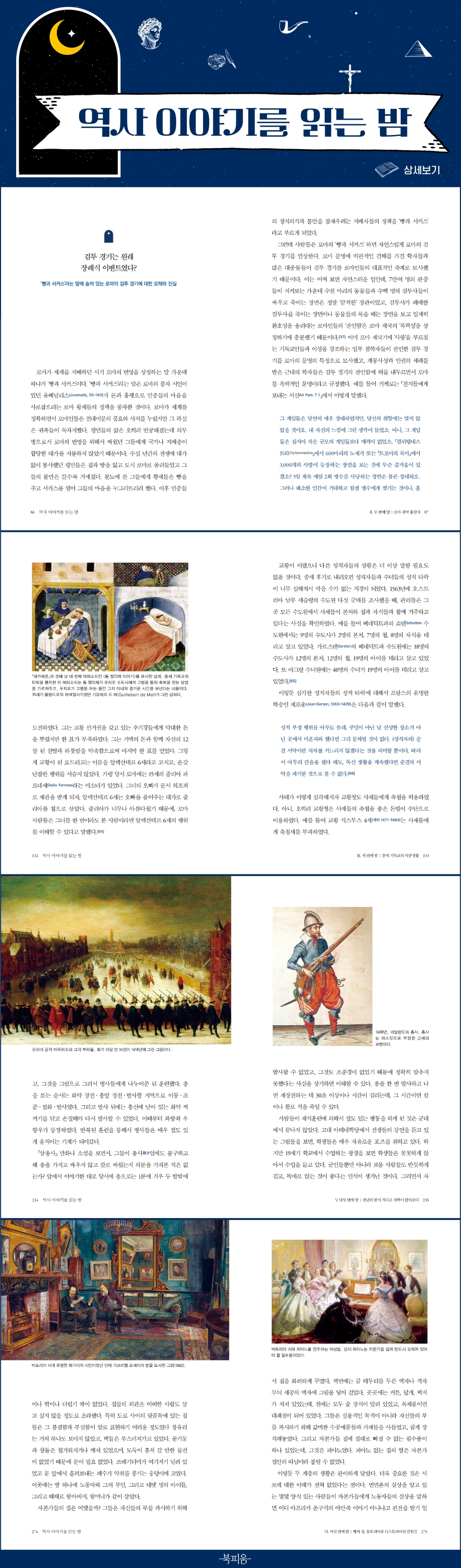 『역사 이야기를 읽는 밤』은 여섯 번의 흥미진진한 밤으로 이루어져 있다. 각각의 밤은 연대기적으로 구성되었다. 첫 번째 밤에는 고대 이집트에서 그리스와 스파르타 이야기를 들려준다. 여자들이 시장에서 장사하고 남자는 집에서 옷감을 짜는 등, 이웃 나라들과는 풍습과 관습이 반대였던 고대 이집트의 특이한 이모저모를 살피고, 스파르타 병사들이 전투 전에 머리를 손질했던 이유를 통해 긴 머리를 초능력의 원천이라고 생각했던 고대인의 마인드를 읽는다. 두 번째 밤에는 ‘로마 제국 흥망’ 뒷이야기를 들려준다. 자식의 생사여탈권까지 쥐고 있을 정도로 가부장의 권한이 막강했던 이유, 폭군의 대명사인 네로가 사실은 서민들을 위한 정책을 편 황제였을 가능성과 그 근거를 탐색한다. 그리고 로마가 거대한 제국이 된 밑바탕에는 피정복민을 관대하게 통치한 정책이 뒷받침되었음도 살핀다. 그러나 제국이 된 로마는 점점 타락해갔고, 흥청망청 연회로 세월을 보냈다. 암퇘지의 자궁, 낙타의 발뒤꿈치 요리가 식탁에 올랐던 최강 제국 로마의 어마어마한 음식 사치를 들여다보고, 고대 로마인의 잔인성을 드러내는 것으로 오해받곤 하는 검투 경기와 동물 도살에 대한 오해도 풀어준다. 검투 경기는 원래 로마의 풍습도 아니었고, 어느 귀족의 장례 이벤트에서 시작했다가 엄청난 인기를 얻자 로마 황제들이 강탈해서(?) 국가 행사로 격상시킨 행사였다. 대규모 동물 도살 또한 피에 굶주린 로마 시민들의 잔인성 때문이 아니라 무시무시한 자연과 맹수에 대한 공포가 컸던 고대인들을 안심시키기 위한 공개 이벤트였다는 점이 신선하다. 세 번째 밤에는 예수와 기독교에 대한 잘 알려지지 않았던 이야기를 들려준다. 예수가 받은 십자가형은 불명예형이었으며, 당시에는 참수형이 명예형이었다. 예수의 마지막 모습이 벌거벗은 모습에서 옷을 입은 모습으로 바뀐 이유, 성인 토마스 아퀴나스가 죽어서 통째로 삶아진 이유 등 중세의 성인 숭배 의식이 낳은 해프닝을 통해, 알고 보면 웃픈(?) 중세 기독교의 근엄한 뒷모습을 볼 수 있다. 네 번째 밤에는 중세 사람들의 의식주 이야기를 들려준다. 중세시대에 ‘과식’과 ‘과음’은 부와 권력의 상징이었으며, 중세의 상류층은 고기를 잘 썰어야 했던 깊은 뜻이(?) 있었다. 고기를 통째로 요리해서 먹었던 중세 시대에 고기를 자르는 일은 ‘명예로운 일’이었던 것이다. ‘하얀 밀빵을 먹는 사람들’과 ‘순무를 먹는 놈들’로 구분되었던 중세의 식탁도 엿보고, 인간과 가축이 옹기종기 한 공간에 살고, 돼지를 끌어안고 꿈나라로 가던 중세의 농가 이야기도 펼쳐진다. 다섯 번째 밤에는 중세를 넘어 근세의 새벽에 일어난 일들을 들려준다. 인클로저 운동으로 인구는 폭증하고 일자리는 없었던 17세기 런던에서는 ‘하루에 4시간 이상 일하면 안 된다’는 황당한(?) 법이 있었고, 왕비 카트린 드 메디시스에게 바친 약의 정체는 신대륙에서 가져온 담배였다 등의 이야기가 펼쳐진다. 마지막 밤인 여섯 번째 밤에는 자본주의와 산업혁명 시대이기도 한 근대의 빛과 그림자를 보여준다. ‘10분만 더 잠을 자는’ 것이 소원이었던 산업혁명기 노동자들의 이룰 수 없었던 처절한 소망, 19세기 미국 남부에서 신앙심 깊은 지주들이 노예제도 폐지를 반대한 뜻밖의 이유를 통해 현재로 이어지는 가까운 과거의 풍경과, 현재와 비슷한 듯하지만 전혀 다른 사고방식을 알 수 있다. 격동하는 역사 속, 나는 어떻게 살 것인가 지은이가 [머리말]에서 밝혔듯이, “역사학은 과학이면서 문학”이다. “사실을 복잡한 수식, 언어, 법칙으로 표현하기보다는 흥미로운 이야기로 펼쳐야 한다.” 그래서 지은이는 “최고의 역사가는 나이 드신 할머니”라고 말한다. 무엇을 먹고 무엇을 입고, 어떤 생각을 하든, 결국 인간의 삶의 양식은 비슷하다. 생로병사의 당연한 궤적을 따라가면서, 개인의 삶을 뒤흔드는 거대한 사건에 휘둘리면서 휘청휘청 살아가는 것이 대부분인간들의 삶이다. 그런 삶들을 모아보면 그 모든 것이 역사가 된다. 과거를 살아간 사람들의 소소하고 평범한 삶이 현재의 사람들에게는 “흥미로운 이야기”가 된다. 그런 이야기로서의 역사책이 주는 즐거움은 옛이야기처럼 즐겁게 읽다보면 ‘역사’라는 인류의 사고와 행동양식의 거대한 변화를 파악하는 동안에 저절로 인식의 지평이 확장된다는 점이다. 격동하는 역사 속에서 흔들리지 않는 나를 지키려면 역사를 돌아보는 것이 좋다. ‘나는 어떻게 살 것인가’에 대한 최고의 해답은 언제나 역사에 있기 때문이다. 『역사 이야기를 읽는 밤』은 특정한 나라나 특정 시대, 특정 주제에 국한되지 않고 다양한 나라와 시대, 주제를 자유롭게 넘나들면서 서양 사회가 바뀌어가는 풍경과 문화적 변천을 종횡무진 누빔으로써 좀 더 열린 시각으로 세상을 바라볼 수 있게 해준다. 이야기를 읽는 즐거움은 덤이다. |