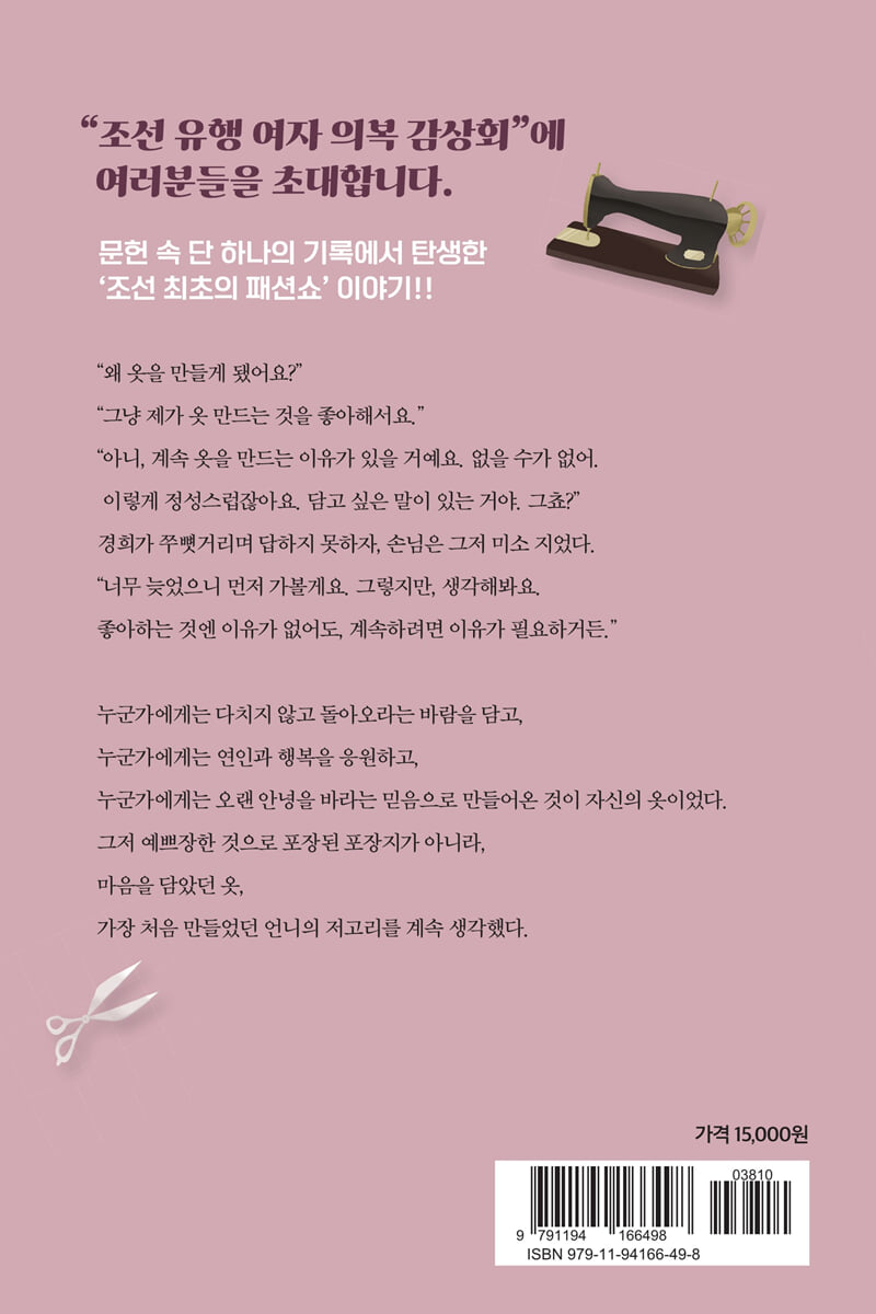 “그냥 제가 옷 만드는 것을 좋아해서요.” “아니, 계속 옷을 만드는 이유가 있을 거예요. 없을 수가 없어. 이렇게 정성스럽잖아요. 담고 싶은 말이 있는 거야. 그쵸?” 경희가 쭈뼛거리며 답하지 못하자, 손님은 그저 미소 지었다. “너무 늦었으니 먼저 가 볼게요. 그렇지만, 생각해봐요. 좋아하는 것엔 이유가 없어도, 계속하려면 이유가 필요하거든.” --- pp.136-137 승효가 말하는 돈벌이라는 말이 유독 오늘의 경희에게는 크게 와닿아서 마음이 저릿했다. “그래도 옷이라는 게 그리 단순하지 않습니다. 누군가에는 축복이고, 누군가에게는 살아남는 방법이고, 누군가에게는 전투복이고, 누군가에게는 자유입니다. 그리고 맞아요. 누군가에게는 돈벌이죠.” --- p.156 “…… 그리 쉬운 것이 아니에요. 전 가진 것도 없고, 명성도 돈도 제가 노력해온 것들 중에서 남은 게 없다고요.” “무언가를 이루는데 내 위치가, 내가 있는 곳이 그리 중요합니까? 당신이 있는 곳을, 당신이 무언가가 될 수 있는 곳으로 만들어요. 막연한 것을 바라는 것, 그것은 나와 같네요. 난 독립을 될 수 있는 일로 만들 거거든요.” --- p.159 “누가 그러던데요. 멈춰야 할 것 알면서도 멈추지 못하는 일이 있다고. 그 일이 내가 쌓아온 걸 모조리 망치더라도 하게 된다고.” …… 중략…… “계속하게 되는 건 이유가 있을 거라고, 생각해보라고 하셨거든요. 제가 재봉틀을 돌리지 못하는 동안 계속 생각했어요. 나는 왜 계속 옷을 만들고 싶지, 뭘 하고 싶어서 그러나 싶었는데, 막연한 기대라는 게 있나봐요. 언젠가 제 옷이 인정받을 수 있다는 기대 같은 거죠. 관성이라고 하지만, 믿고 있잖아요. 조국에 독립이 반드시 올 거라고.” --- pp.172-173 “누구도 이 시대에는 이렇게 살아야 한다고 말할 수 없을 겁니다. 그리고 제가 원하던 건 늘 조국의 독립이지 누군가의 희생이나 인내가 아니에요. 그러니 당신의 삶에 있는 거사를 놓치진 마세요.” --- p.184 “뭔가 활주로 같지 않아? 여기서부터 저기까지 걷고 나면 모델이 입고 나갔던 옷은 저 길의 끝에서 훨훨 날아갈 거야. 더 멀리, 더 밖으로, 더 자유롭게.” 순이의 말을 들은 채령이 다시 무대를 바라봤다. 활주로라. 적확한 표현이었다. “좋네, 활주로. 런-웨이.” --- pp.248-249 |