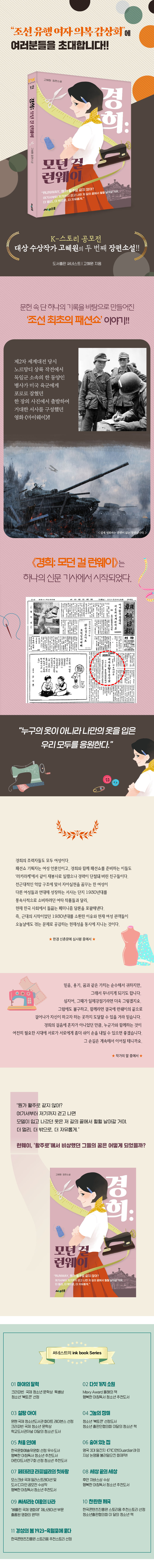 K-스토리 공모전 대상 수상작인 《래빗》의 작가 고혜원의 두 번째 장편소설이다. 작가의 첫 번째 작품인 《래빗》이 6.25 전쟁이라는 아픈 역사 속에서 희생당했지만, 우리에게 잊혀졌던 소녀 첩보원들의 이야기를 그리고 있다면, 이번에 출간하는 《경희: 모던 걸 런웨이》는 대다수 여성이 한복을 입던 시대에 ‘모던 걸’이나 ‘모던 보이’들의 양장을 만드는 명동의 양장점에서 재봉사로 일하던 주인공 경희가 자신의 재능을 훔쳐 성공 가도를 달리던 남성 디자이너에게서 벗어나 조선 최초의 패션쇼를 열기 위해 고군분투하며 디자이너로 성장하는 과정을 담은 성장 스토리이다. 《경희: 모던 걸 런웨이》는 1934년 6월16일 서울 종로 기독청년회관에서 ‘조선 유행 여자 의복 감상회’가 열렸다는 하나의 ‘사료(신문 기사)’에서 시작된 소설이다. 우리에게 잘 알려지지 않았던 “조선 최초의 패션쇼”를 작가가 소설로 되살려낸 것이다. 아주 작은 하나의 ‘사료’에서 출발했는 점에서 제2차 세계대전 당시 노르망디 상륙 작전에서 독일군 소속의 한 동양인 병사가 미국 육군에게 포로로 잡혔던 한 장의 사진에서 출발하여 거대한 서사를 구현했던 영화 《마이웨이》와도 비슷하다. ※ ‘조선 유행 여자 의복 감상회’ 《조선일보 | 1934.06.16. 기사》 참고 ‘조선 유행 여자 의복 감상회’는 1934년 6월16일 서울 종로 기독청년회관에서 진행되었다. 그 당시에는 사람들은 ‘모던 걸’을 ‘못된 걸’이라고 불렀으며, 신문 등에서도 모던 걸처럼 꾸미는 여성들에 대한 부정적인 인식을 전파했다. 이에 ‘조선 직업 부인 협회’에서는 유행을 따르는 것에서 벗어나 유행을 만들어가겠다며 ‘조선 유행 여자 의복 감상회’를 기획했다. 조선옷을 현대적으로 해석하여 나들이 갈 때, 연회에 참석할 때, 운동할 때, 가정 내에서 입을 수 있는 옷 등 여러 가지 옷을 선보였다. 이런 모습은 현대의 패션쇼와 다르지 않기 때문에 조선 최초의 패션쇼라고 부를 수 있을 것이다. 1930년대 ‘직업을 가진 여성’에 대한 서사 《경희: 모던 걸 런웨이》는 지금까지 잘 알려지지 않았던 조선 최초의 패션쇼를 다룬다는 점에서 소재의 신선함이 돋보이는 소설이다. 더불어 지금으로부터 약 100년 전인 1930년대에 직업을 가진 여성들에 대한 서사라는 점에서는 신선함과 흥미로움 이상의 새로움을 찾을 수 있을 것이다. (또 하나 흥미로운 사실은 여성 운동의 선각자로 평가받는 나혜석의 동명 소설 [경희]가 있다는 것이다. 나혜석은 이 소설에서 결혼이라는 제도와 관련해서 전통적인 가치관을 수용할 것인지 새로운 삶을 선택할 것인지를 고민하는 신여성을 그리고 있다. 《경희: 모던 걸 런웨이》는 새로운 삶을 선택한 모던걸(신여성)의 이야기처럼 느껴지기도 한다.) 소설 《경희: 모던 걸 런웨이》는 ‘러키 라케(Lucky Lake)’라는 양장점에서 남성 디자이너의 재봉사로 일하던 주인공 경희가 디자이너로 성장하는 과정을 다루고 있다. 그 과정에서 경희의 조력자들은 모두 여성이다. 이 소설 전체를 관통하고 있는 “조선 유행 여자 의복 감상회”라는 이름의 ‘패션쇼’를 기획한 사람은 여성 기자이고, 함께 패션쇼를 준비하는 친구들은 ‘명동 양장점’에서 재봉사로 일했으나 개인적인 사정으로 경력이 단절된 여성 재봉사들이다. 또한 사람들의 따가운 눈총을 감내하며 패션쇼 무대인 ‘런웨이’에 오르는 인물들 역시 모두 여성이며, 주인공 경희의 ‘이웃’이자 패션쇼의 메인을 장식하게 되는 ‘독립운동가’는 남장 여성이고, 패션쇼 행사를 주관하는 곳 역시 ‘조선 직업 부인 협회’라는 여성 운동 단체이다. 이들 여성들은 여러 가지 갈등 속에서도 서로 ‘연대’하면서 각자의 목표를 향해 나아간다. 애초에 ‘조선 유행 여자 의복 감상회’, 즉 패션쇼는 혼자서 할 수 있는 일이 아니다. 적어도 메시지를 표현할 옷을 제작할 사람과 그 옷들을 입고 무대에 설 사람이 필요하기 때문이다. ‘조선 유행 여자 의복 감상회’를 준비하는 사람들은 모두 그 무대를 통해 자신만의 목소리를 내고자 하는 여성들이라는 공통점을 가지고 있었다. 이를 통해 소설은 우리의 역사에서 가장 어두웠던 식민지 시대라는 소용돌이 속에서도 꿈을 잃지 않은 여성들, 그리고 전근대적이고 폭압적인 사회 분위기에 맞서 자아실현을 꿈꾸는 여성들의 이야기가 된다. 그런 의미의 연장선에서 《경희: 모던 걸 런웨이》는 현재 한국 사회에서 논쟁 중인 페미니즘 담론을 굳이 꺼내지 않더라도 여전히 사라지지 않고 있는 편견과 차별 때문에 자신의 꿈을 향해 나아가는 것이 쉽지만은 않은 우리 시대의 여성들을 응원하는 이야기이기도 하다. “전 제일 잘 알고 있습니다. 이리 하면 제가 가장 아름다울 것을.” “Runway, 뭔가 활주로 같지 않아? 여기서부터 저기까지 걷고 나면 저 길의 끝에서 훨훨 날아갈 거야. 더 멀리, 더 밖으로, 더 자유롭게.” 경희는 조선 최초의 패션쇼를 마치고 자신의 꿈이었던 디자이너가 된다. 경희의 꿈이 이루어지는 공간이 바로 ‘런웨이’이다. ‘런웨이’라는 말의 원래 의미에는 모델들이 걸어가는 무대라는 의미 