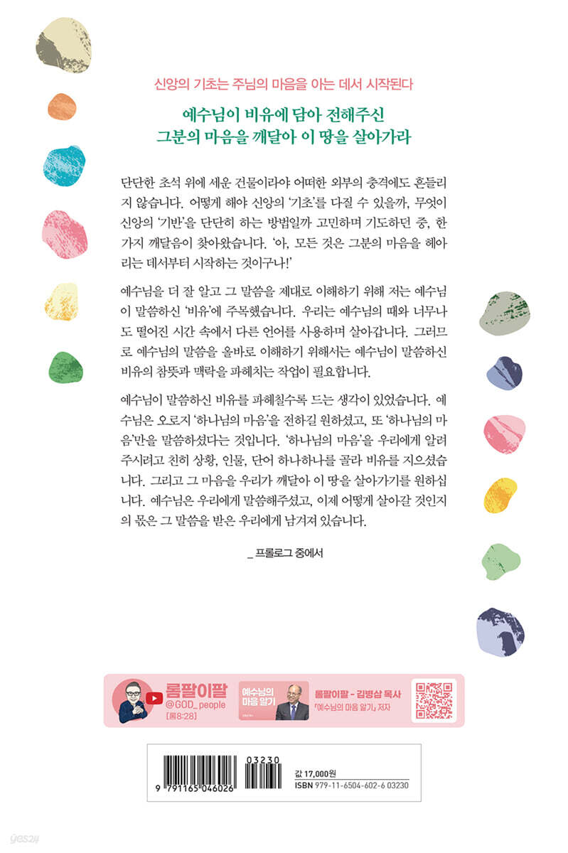 예수님이 비유에 담아 전해주신 그분의 마음을 깨달아 이 땅을 살아가라 단단한 초석 위에 세운 건물이라야 어떠한 외부의 충격에도 흔들리지 않습니다. 어떻게 해야 신앙의 ‘기초’를 다질 수 있을까, 무엇이 신앙의 ‘기반’을 단단히 하는 방법일까 고민하며 기도하던 중, 한 가지 깨달음이 찾아왔습니다. ‘아, 모든 것은 그분의 마음을 헤아리는 데서부터 시작하는 것이구나!’ 예수님을 더 잘 알고 그 말씀을 제대로 이해하기 위해 저는 예수님이 말씀하신 ‘비유’에 주목했습니다. 우리는 예수님의 때와 너무나도 떨어진 시간 속에서 다른 언어를 사용하며 살아갑니다. 그러므로 예수님의 말씀을 올바로 이해하기 위해서는 예수님이 말씀하신 비유의 참뜻과 맥락을 파헤치는 작업이 필요합니다. 예수님이 말씀하신 비유를 파헤칠수록 드는 생각이 있었습니다. 예수님은 오로지 ‘하나님의 마음’을 전하길 원하셨고, 또 ‘하나님의 마음’만을 말씀하셨다는 것입니다. ‘하나님의 마음’을 우리에게 알려주시려고 친히 상황, 인물, 단어 하나하나를 골라 비유를 지으셨습니다. 그리고 그 마음을 우리가 깨달아 이 땅을 살아가기를 원하십니다. 예수님은 우리에게 말씀해주셨고, 이제 어떻게 살아갈 것인지의 몫은 그 말씀을 받은 우리에게 남겨져 있습니다. |