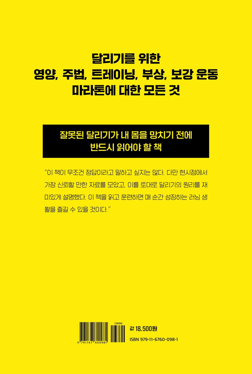 PART 01 달리기 워밍업 달리기를 하기 전에 달리기 주법 1 착지법 달리기 주법 2 케이던스 달리기 주법 3 호흡 PART 02 에너지와 영양 ATP 탄수화물 단백질 지방 PART 03 달리기 트레이닝 심박수와 달리기 ZONE 2 잘 달리는 방법 근력 러닝 이코노미 VO2max 젖산염 인터벌 다양한 강도의 운동이 필요하다 PART 04 부상과 보강 운동 달리기에서 가장 많이 생기는 통증 지연성 근육통 부상을 당했을 때 달리기 안정성을 높이는 보강 운동 테이핑 요법이란 회복과 수면 PART 05 마라톤 실전 마라톤 준비 카보로딩 장거리 훈련 부록 달리기를 위한 팁 달리기 끝나고 맥주 한 잔, 괜찮을까 밥 먹고 바로 달리면 배가 아픈 이유 달리기 많이 하면 빨리 늙는다? 야외 달리기 vs 실내 달리기 체중과 달리기의 관계 달리기를 하면 근 손실이 된다? 근 손실을 최소화하는 세 가지 영양 섭취법 달리기와 웨이트 운동은 같이하면 안 된다? 달리기에 도움이 되는 보조제 달리기 관련 의약품 : 파스 달리기 관련 의약품 : 진통제 마라톤 대회 비매너 모음 알면 도움이 되는 달리기 용어 참고 자료 |