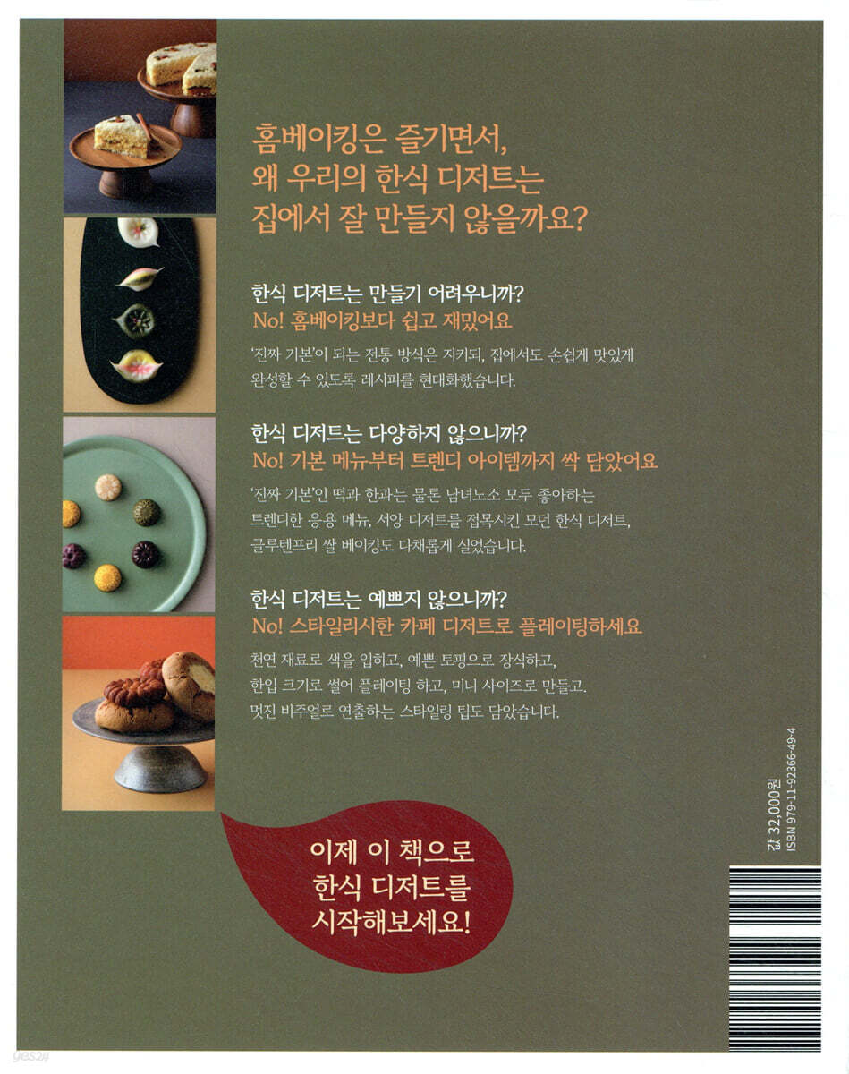 004 세계가 주목하는 전통 & 모던 한식 디저트의 모든 것을 담았습니다 기본 가이드 014 이 책에 소개한 한식 디저트 이해하기 018 쌀가루 준비하기 020 고물과 앙금 만들기 026 부재료 손질하기 034 색과 장식 재료 준비하기 036 기본 도구 구비하기 040 한식 디저트 Q&A 01 떡 044 떡의 기본 요소 4가지 045 떡 만들기 기본 테크닉 9가지 찌는 떡 050 백설기 / 콩설기 / 블루베리설기 / 커피설기 / 사탕설기 / 캐러멜설기 054 쑥버무리 056 각색편 057 단호박편 062 오색편 066 석탄병 067 잡과병 072 팥시루떡 073 상추시루떡 078 무시루떡 080 녹두찰편 084 호박고지 찰시루떡 086 팥구름떡 / 흑임자구름떡 090 콩찰편 092 깨찰편 094 팥앙금떡 098 두텁떡 099 두텁편 빚는 떡 104 오색송편 / 꽃송편 110 밤송편 111 감자송편 116 찹쌀떡 / 과일찹쌀떡 120 경단 121 오메기떡 치는 떡 126 인절미 127 인절미말이 132 삼색단자(쑥구리단자 / 대추단자 / 석이단자) 138 모둠찰떡 / 흑미영양찰떡 142 쑥개떡 144 밥알쑥떡 146 가래떡 / 쑥가래떡 / 현미가래떡 / 도토리가래떡 150 절편 / 꽃절편 / 색동절편 156 개피떡 지지는 떡 160 개성주악 161 계강과 166 삼색주악 170 화전 / 웃지지 / 수수부꾸미 약주를 넣은 떡 176 대추약편 178 방울증편 / 유자증편 약식 182 약식 / 녹차약식 02 한과 유밀과 188 궁중약과 189 만두과 194 개성약과 198 매작과 / 타래과 다식 202 삼색다식(콩가루다식 / 흑임자다식 / 아몬드다식) 206 약선다식 정과 208 사과정과 / 무화과정과 / 금귤정과 214 단호박정과 / 감자정과 / 당근정과 / 연근정과 222 생강정과 / 무정과 / 도라지정과 228 인삼통정과 230 인삼편정과 숙실과 232 생란 / 율란 / 조란 238 호박란 / 유자란 / 귤란 / 당근란 244 밤초 246 대추초 양갱 248 팥양갱 / 유자양갱 / 인삼양갱 / 녹차양갱 / 와인양갱 강정 252 오색 쌀강정 256 깨엿강정 257 잣박산 262 호두강정 03 K-디저트 모던 한식 디저트 266 채소 마요설기 267 토마토 치즈설기 272 오레오쿠키 떡케이크 276 고구마 카스텔라떡케이크 277 쌍화병 케이크 282 찹쌀오븐떡 284 쑥떡와플 286 팥티라미수 290 감태 오란다강정 / 커피 오란다강정 / 크랜베리 오란다강정 292 올리브정과 294 퓨전약과 295 르뱅 약과쿠키 300 단호박 과일양갱 302 커피 마블양갱 304 유자 라이스무스 308 와인밤조림 310 곶감 치즈쌈 311 와인배숙 쌀 베이킹 316 라이스 롤케이크 317 당근 쌀케이크 322 견과류타르트 / 코코넛 에그타르트 326 보리떡머핀 328 옥수수 쌀머핀 330 찹쌀 초콜릿구겔호프 332 쌀카스텔라 334 두부 올리브 찹쌀피낭시에 335 레몬 쌀마들렌 340 무궁화 쌀쿠키 341 떡카롱 INDEX 346 ㄱㄴㄷ순 345 쌀가루별 · 고물과 앙금별 |