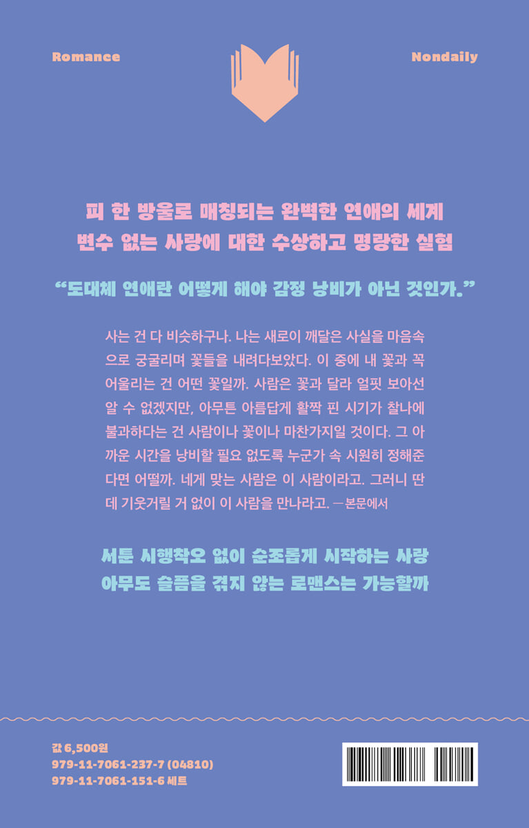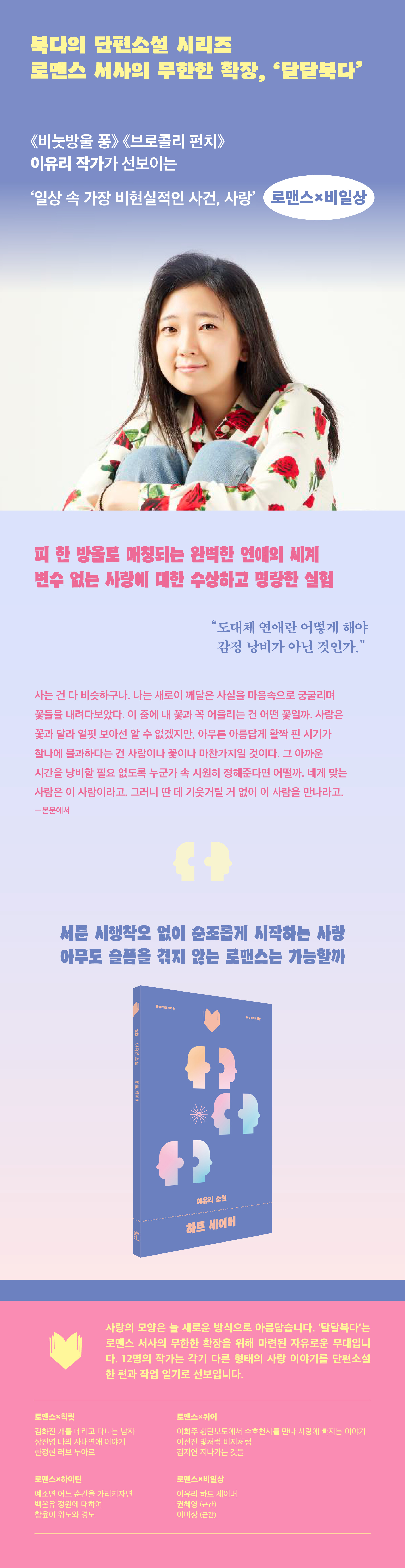 신작 로맨스 단편소설과 작업 일기 ‘달달북다’의 열 번째 작품은 이유리의 『하트 세이버』이다. 이유리는 2020년 경향신문 신춘문예에서 “능청스러우면서도 유쾌하게” “시종일관 사랑에 대해 이야기해왔다”(심사평)는 평가를 받으며 작품 활동을 시작했다. 전작들을 통해 냉혹한 현실과 경쾌한 환상의 경계를 가로지르며 삶과 사랑에 대한 발랄하고 명쾌한 가능성의 세계를 만들어온 작가는 이번 작품 『하트 세이버』에서는 피 한 방울로 매칭되는 완벽한 연애의 세계를 선보이며 사랑이 도달할 수 있는 새로운 영역의 상상력을 펼친다. 피 한 방울로 매칭되는 완벽한 연애의 세계 변수 없는 사랑에 대한 수상하고 명랑한 실험 “도대체 연애란 어떻게 해야 감정 낭비가 아닌 것인가.” 『하트 세이버』에서는 ‘일상에서 가장 비현실적인 사건, 사랑’, 로맨스×비일상을 키워드로 하여 연애 매칭 업체 ‘하트 세이버’라는 특별한 소재로 변수 없는 사랑에 대한 수상하고 명랑한 실험을 펼친다. 꽃집을 운영하는 주인공 ‘혜인’은 주간 행사처럼 매주 다투던 전 남친과 헤어진 날 밤 SNS에서 하트 세이버 광고를 본다. 하트 세이버는 피 한 방울로 성향과 취향이 꼭 맞는 운명의 상대를 찾아주는 연애 매칭 업체로, 혜인은 더 이상의 시간도 감정도 낭비하지 않고 잘 맞는 짝을 만날 수 있을지도 모른다는 가능성에 홀린 듯 주문 버튼을 누른다. 행복한 연애를 꿈꾸시나요? 나에게 꼭 맞는 사람을 찾아 헤매다 지쳤다고요? 더 이상 귀한 시간을 낭비하지 마세요. (……) 하트 세이버는 다년간의 연구 끝에 개발한 특수 검사지를 통해, 피 한 방울에서 약 2500가지의 기질적 특징을 찾아내 분석합니다. 그리고 그 특징이 99퍼센트 이상 일치하는 짝을 찾아 매칭해드립니다. (24~25쪽) 그렇게 반년이라는 시간이 흐른 어느 날 혜인은 하트 세이버 전담 매니저에게 연락을 받는다. 매칭에 성공했다는 매니저의 말에 하트 세이버를 신청했었다는 기억을 떠올린 혜인은 매칭된 예비 연인의 전화번호를 손에 넣는다. 그리고 이루어진 카페에서의 첫 만남에서 혜인은 ‘재민’이 자신과 매칭된 사람임을 한눈에 알아본다. 굵직한 인생관부터 사소한 습관까지 똑 닮은 혜인과 재민, 서툰 시행착오 없이 두 사람은 급속도로 서로에게 빠져들고 자연스럽게 연인 관계로 발전한다. 하지만 정말로 아무도 슬픔을 겪지 않는 로맨스는 가능한 것일까? 서툰 시행착오 없이 순조롭게 시작하는 사랑 아무도 슬픔을 겪지 않는 로맨스는 가능할까 이 사람은 내게 맞는 짝이 아니라는 생각, 분명 어느 다른 곳엔 이 사람보다 훨씬 더 나와 잘 맞는 사람이 있을 것이며 지금 이 연애는 그 사람을 만나기 위한 연습에 불과하다는 감각. 그런 생각을 하고 있으니 연애가 마냥 즐거울 리가 없었다. 수없이 크고 작은 싸움을 반복하다 결국 지쳐 나가떨어지고 나면 남은 건 상처투성이 마음뿐이었다. 그러니까, 어쩌면 이번에는 정말로. (30쪽) 『하트 세이버』에서 중요한 화두는 아무도 상처받지 않는, 시간과 감정의 낭비 없는 로맨스의 가능성이다. 그리고 그러한 로맨스가 정말 행복한 연애로 이어질 수 있을지 묻고 있다. 「작업 일기 : 연애 이야기, 좋아하세요?」에서 작가는 “사랑이란 서로 비슷한 사람들이 만나 더욱 비슷해져가는 과정”(71쪽)이라고 믿었던 시절을 지나 “사랑은 서로 다른 사람들이 만나 각자의 다름을 유지한 채 섞여 새로운 다름을 만들어내는”(72쪽) 것이라고 생각한다고 말한다. 혜인이 자신과 똑같은 사람이라고 생각하여 사랑하게 된 재민에게서 다름을 발견한다면 어떨까. 그 로맨스의 끝은 이별일까? 아니면 다름을 받아들이고 비로소 서로를 진정으로 마주 보는 새로운 로맨스의 시작일까? 어쩌면 그것은 전에 가닿은 적 없는 또 다른 사랑의 영역으로 가는 첫발일지도 모른다고, 『하트 세이버』는 새로운 사랑의 가능성을 제시한다. ‘달달북다’는 12명의 젊은 작가가 로맨스×칙릿(김화진, 장진영, 한정현), 로맨스×퀴어(이희주, 이선진, 김지연), 로맨스×하이틴(예소연, 백온유, 함윤이), 로맨스×비일상(이유리, 권혜영, 이미상)의 테마를 경유해 각별한 로맨스 서사를 선사한다. 독자들은 오늘날 각기 다른 형태로 발생하는 사랑 이야기를 만날 수 있다. 작가의 말 이 소설의 아이디어가 퍼뜩 떠오른 건 그때였다. 개인의 모든 성향과 취향을 한꺼번에 자동으로 파악해, 완전히 일치하는 사람들끼리 만남을 주선하는 업체가 있다면 어떨까. 그러면 쓰레기는 꼭 쓰레기통에 제대로 분리수거 해야 직성이 풀리는 사람과 고작 일회용 컵 하나 갖고 깐깐하게 구는 걸 이해할 수 없는 사람이 만나는 일은 없을 것이다. 서로의 귀한 시간과 그보다 더 귀한 감정을 낭비하는 일도 없을 거고 결국 아무도 슬프지 않을 수 있을지도 모른다. |