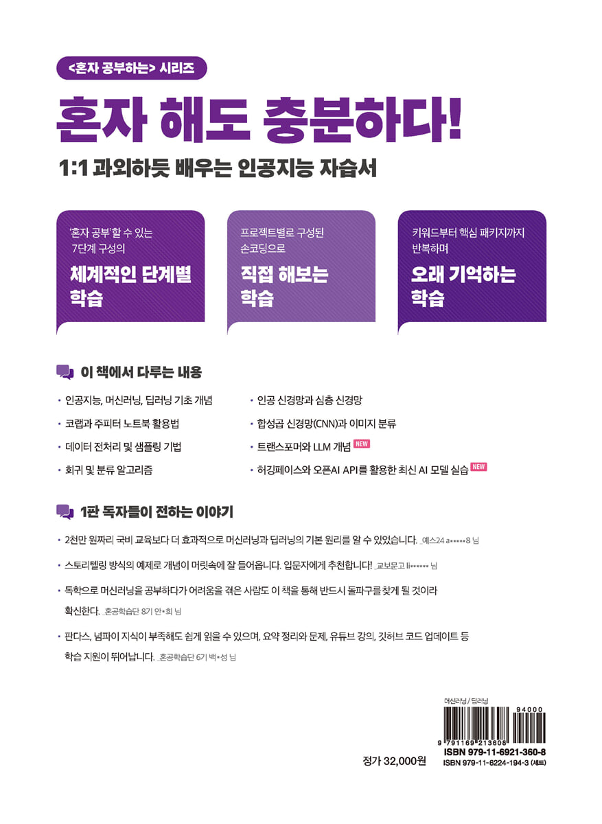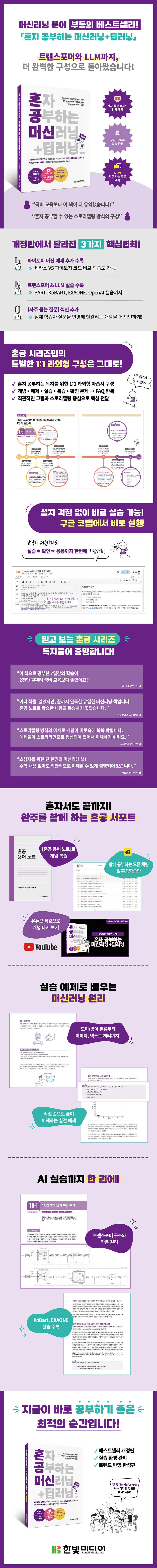 수식 없이 직관적으로 개념을 익히고 싶을 때 혼자서도 실습하며 AI 모델을 구현해 보고 싶을 때 》 하나, ‘입문자 맞춤형 학습 설계’로 개념과 실습을 함께 익힌다! 이 책은 머신러닝과 딥러닝을 처음 배우는 학습자를 위한 맞춤형 학습 설계로 구성되었다. 개념을 쉽게 이해할 수 있도록 스토리텔링 방식의 설명과 직관적인 비유를 활용하며, 모든 실습은 구글 코랩(Colab) 환경에서 바로 실행할 수 있도록 제공한다. 또한, 개정판에서는 각 장마다 ‘자주 하는 질문(FAQ)’ 코너를 추가하여 학습자의 궁금증을 바로 해결할 수 있도록 했다. 》 둘, 최신 AI 기술까지 다루는 확장된 실습 범위! 기존의 머신러닝 및 딥러닝 개념을 탄탄히 다지는 것은 물론, 개정판에서는 트랜스포머와 대규모 언어 모델(LLM) 실습을 새롭게 추가했다. 또한, 독자 요청이 많았던 파이토치 예제 코드를 보강해, 케라스뿐만 아니라 파이토치까지 함께 익힐 수 있도록 구성했다. 》 셋, 혼자서도 끝까지 학습할 수 있도록 [용어 노트], [유튜브 강의] 등 다양한 학습 지원 제공! 책을 읽으며 학습을 이어갈 수 있도록 혼공 용어 노트, 저자 유튜브 강의, Q&A 커뮤니티, 독자 전용 오픈 채팅 등을 지원한다. 어려운 개념이 나오더라도 언제든 참고할 수 있도록 복습 자료를 제공하며, 궁금한 점은 온라인 커뮤니티에서 해결할 수 있도록 했다. ▶ 학습 사이트: https://hongong.hanbit.co.kr 》 넷, 실습과 개념을 균형 있게 익히고 싶은 모든 학습자를 위한 책! 이 책은 머신러닝과 딥러닝을 처음 배우려는 입문자, AI 실습을 통해 직접 모델을 구현해 보고 싶은 개발자, 최신 AI 기술을 익히고 싶은 실무자까지 모두에게 적합한 학습서다. 머신러닝과 딥러닝을 체계적으로 익히고 싶다면, 지금 이 책을 만나보자. |