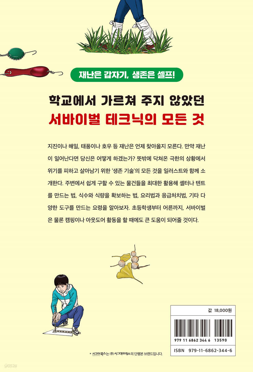 이 책의 사용법 제1장. 생존 기술 〈1〉 생명을 지키는 셸터를 만들자 01 골판지를 이용하여 셸터 만들기 02 방수포와 빨래 건조대로 간이 셸터 만들기 03 방수포와 원예용 지지대로 만드는 삼각형 셸터 04 A형 프레임 2개로 구축하는 야외용 셸터 05 다이소 제품으로 만드는 서바이벌 텐트 06 방수포 1장으로 어드벤처 타프 만들기 〈2〉 생명을 연장해 주는 식수를 만들자 07 식수 만들기에 중요한 여과와 끓이기 08 욕조 물과 빗물로 식수 만들기 09 이슬을 모아 식수 만들기 10 나뭇잎이나 풀에서 식수 만들기 11 바닷물을 증류해서 식수 만들기 12 강이나 호수의 물로 식수 만들기 13 태양열과 대지에서 식수 만들기 14 페트병 태양열 증류 장치로 식수 만들기 〈3〉 생존을 위해 불을 피우자 15 태양광으로 불 피우기 16 활을 이용한 원시 불 피우기 17 손으로 원시 불 피우기 18 부시와 부싯돌로 불 피우기 19 껌 포장지로 불 피우기 20 모닥불 피우는 기술 익히기 〈4〉 생존을 위한 식량을 확보하자 21 먹을 수 있는 야생식물 채집하기 22 먹을 수 있는 나무열매 채집하기 23 야생식물과 일반 식재료를 이용해 장기간 생존하기 24 낚시 도구를 만들어 식량 확보하기 25 보존식 만들기 〈5〉 생명을 지키는 응급처치를 익히자 26 베인 상처 및 긁힌 상처의 응급처치 27 베인 상처에 출혈이 있는 경우의 지혈법 28 염좌 및 골절의 응급처치 29 생명을 구하는 심폐소생술 익히기 30 나의 위치를 알려서 구조 요청하기 31 위험한 생물에 노출되었을 때의 응급처치 제2장. 생존 후 기술 〈6〉 직접 만든 도구로 요리를 하자 32 고체 연료용 스토브를 만들어 밥 짓기 33 접이식 태양열 조리기로 요리하기 34 모닥불로 꼬치 요리와 디저트 만들기 35 삼각형 고정 장치로 고기 굽기 36 화분 요리와 비어 치킨 만들기 37 훈제용 스모커로 어묵, 치즈, 삶은 계란 훈제하기 38 비닐봉지로 중탕 조리법 도전하기 〈7〉 도구를 직접 만들자 39 자르는 도구 만들기 40 이동 도구 만들기 41 신발이 망가졌을 때의 대처법 42 비상용 화장실 만들기 43 천 짜기 44 조명 만들기 45 구명 용품 만들기 〈8〉 날씨와 방위를 읽자 46 하늘과 구름으로 날씨 읽기 47 생물의 행동으로 날씨 읽기 48 나침반 없이 북쪽 찾기 TIP 일상용품으로 서바이벌 도구를 만들자 제3장. 매일 연습하는 기본 기술 〈9〉 로프 다루는 법을 익히자 49 로프 끝단이 풀리지 않도록 처리하기 50 옭매듭 / 8자 매듭 51 맞매듭 52 접친매듭 53 피셔맨 매듭 54 보라인 매듭 55 투 하프 히치 56 토트라인 히치 57 클로브 히치 58 푸르직 매듭 59 맨 하네스 매듭 60 풀매듭 61 나란히 얽기 62 네모 얽기 63 맞모금 얽기 64 발판 얽기 65 의자 만들기 66 화덕 만들기 67 삼각 벤치 해먹 만들기 68 다양한 장소에 해먹 설치하기 69 침상 만들기 70 로프를 설치하여 이동하기 71 로프를 이용하여 나무 오르기 72 트리하우스 짓기 〈10〉 칼에 익숙해지자 73 섬세하게 깎기 74 크게 깎거나 자르기 75 구멍 내기 76 나무나 대나무 쪼개기 77 직선이나 곡선을 정확하게 자르기 TIP 막대기로 나무젓가락 만들기 TIP 부메랑 만들기 〈평소의 준비〉 ○ 다이소에서 생존 및 재난 용품을 준비하자 ○ 대지진이 일어났을 때 몸을 지키는 333 서바이벌 매뉴얼 |