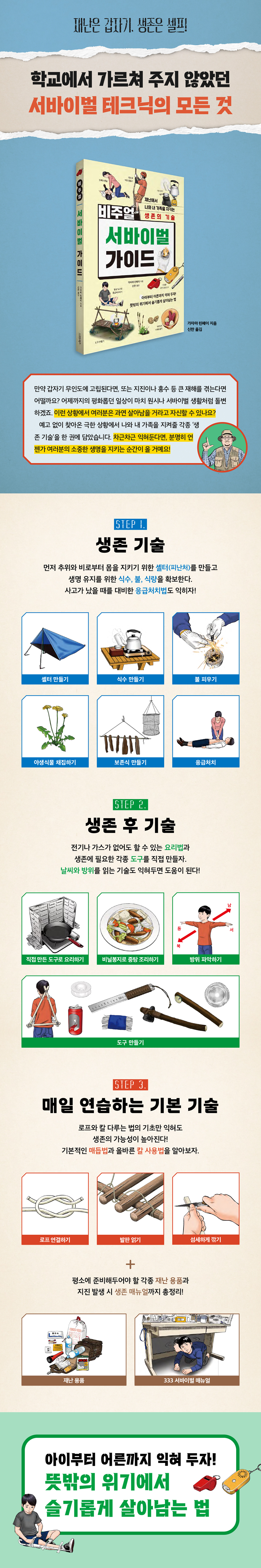예고도 예외도 없는 재난, 준비하는 자만이 생존한다! 생존 기술을 담은 이 책에 혹자는 ‘굳이?’라며 의문을 표할 것이다. 매일같이 학교나 직장에 가고, 물과 전기가 나오는 따뜻한 집으로 돌아오는 평화로운 일상에서 ‘생존 기술’이란 나와 상관없는 이야기처럼 느껴지기 때문이다. 하지만 우리가 몸담고 있는 사회를 돌아보자. 우크라이나, 이스라엘 등 세계 곳곳에서 일어나고 있는 분쟁, 해마다 나타나는 이상 기후, 하루가 멀다 하고 들려오는 각종 사건사고 소식, 불과 얼마 전까지 세계인의 일상을 송두리째 바꿨던 바이러스 사태…. 이렇듯 재난은 더 이상 허구가 아니라 현실이다. 단지 지금까지는 운이 좋았을 뿐이다. 『비주얼 서바이벌 가이드』는 이처럼 평소에는 체감하지 못하지만 언제든 예고나 예외 없이 찾아올 수 있는 재난에 대비하기 위한 생존 기술 가이드북이다. 어느 날 갑자기 지진이나 홍수 등 큰 재해를 당해 혼자가 된다면, 또는 사고를 당해 무인도에 고립된다면 여러분은 어떻게 할 것인가? 과연 ‘괜찮아! 어떤 상황에서도 살아갈 수 있어!’라고 자신할 수 있는가? 갑작스러운 천재지변 시 도움이 될 ‘생존 기술’을 익힐 기회가 마땅히 없다. 학교나 학원에서도, 주위 어른들도 가르쳐주지 않는다. 그렇다면 답은 결국 스스로 찾고 익히는 것 아닐까? 언제 어떤 형태로 찾아올지 모르는 재난 앞에서 한없이 나약한 우리가 할 수 있는 건 그저 철저히 대비하고, 지혜롭게 헤쳐나가는 것일 뿐이다. 아이부터 어른까지 익혀 두자! 뜻밖의 위기에서 슬기롭게 살아남는 법 이 책은 크게 세 개의 장으로 구성되어 있다. 만약 무인도나 정글·산에서 조난되거나 지진·홍수 등의 자연재해가 일어난다면 무엇보다도 목숨을 잃지 않는 것이 최우선이다. 이때 필요한 다섯 가지 요소, 바로 ‘셸터, 식수, 불, 식량, 응급처치법’에 대해 제1장 ‘생존 기술’에서 소개했다. 제2장 ‘생존 후 기술’에서는 생존할 수 있는 환경을 마련한 뒤 구조될 때까지 안전하게 버티는 방법에 대해 알려주고 있다. 전기도 가스도 없는 상황에서 직접 도구를 만들고 요리하는 방법, 날씨와 방위를 파악하는 방법을 자세한 일러스트로 담았다. 한편 1~2장에서 소개한 기술을 수월하게 적용하려면 무엇보다도 로프나 칼을 다루는 법이 중요하다. 그래서 제3장 ‘매일 연습하는 기본 기술’에서 각종 매듭법과 올바른 칼 사용법을 소개했다. 책의 말미에는 다이소 등 주변에서 쉽게 구할 수 있는 생존 및 재난 용품 리스트와, 대지진이 일어났을 때 안전하게 대응할 수 있는 ‘333 서바이벌 매뉴얼’을 수록했다. 만약의 사태를 대비해 숙지해둔다면 재난 시 나와 내 가족을 지키는 귀중한 자원이 될 것이다. 이 책의 취지는 독자들에게 막연한 불안감을 심어주기 위함도, 미래에 대한 비관론을 무작정 부추기기 위함도 아니다. 재난이 불가해한 것임을 늘 인식하고, 극한의 상황이 닥치더라도 나 자신의 생명을 슬기롭게 지킬 줄 아는 힘을 기르는 것에 목적이 있다. 이 책이 뜻밖의 위기 상황에서 여러분과 여러분의 소중한 사람들을 지켜줄 든든한 길잡이가 되길 바란다. |