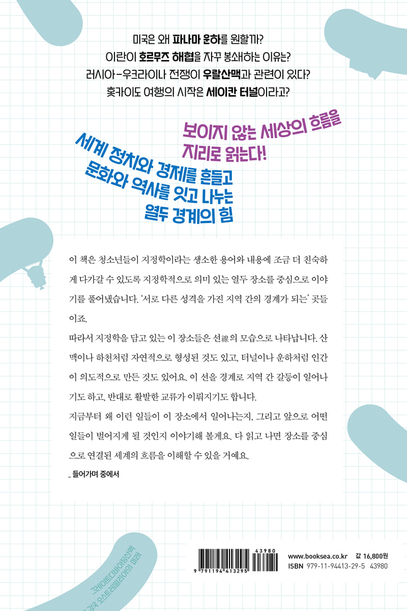 1부. 해협 믈라카 해협 - 세계 무역을 둘러싼 줄다리기 인도양과 태평양을 연결하는 가장 빠른 길 국제 해협이라는 카드 중국의 ‘믈라카 딜레마’ 크라 운하가 가져올 미래 *선을 넘은 이야기 _동서 교역의 역사를 간직한 도시 믈라카 베링 해협 - 빙하가 열어 준 길 호모 사피엔스, 선을 넘다 미국과 러시아, 선을 긋다 *선을 넘은 이야기 _역적에서 영웅이 된 수어드 다시 선을 잇다: 런던부터 뉴욕까지 북극 항로의 주요 경로 호르무즈 해협 - 축복과 분쟁의 씨앗이 흐르는 곳 대한민국 유조선, 나포되다 호르무즈 해협의 정치적 갈등 문제는 석유 가격이 아니다 왜 이곳은 지나가기 어려울까? *선을 넘은 이야기 _영해와 무해통항권 새로운 선택, 홍해 지브롤터 해협 - 세상의 끝을 사수하라 헤라클레스의 기둥, 대항해 시대를 열다 유럽 진출의 전진 기지 *선을 넘은 이야기 _지중해는 사막이었다 브렉시트 이후: 영국과 에스파냐 사이에서 지브롤터 해협의 경제적 가치 2부. 운하와 터널 수에즈 운하 - 고갈되지 않는 자원 배 한 척이 전 세계 물류의 흐름을 막다 바다와 바다의 연결 고리 이집트의 품으로 돌아오기까지 *선을 넘은 이야기 _500년간의 도전, 굴포 운하와 안면 운하 수에즈 운하는 스마트폰 파나마 운하 - 태평양과 대서양을 오가는 자유 운하 때문에 만들어진 나라가 있다? 끈질긴 야심은 막을 내리고 *선을 넘은 이야기 _파나마 vs 니카라과 파나마 경제의 중심이 되다 기후 변화가 일으킨 위기들 세이칸 터널 - 일본의 자부심, 대륙 진출의 꿈 참담한 침몰이 남긴 과제 균형 발전의 땅, 홋카이도를 향해 *선을 넘은 이야기 _아이누족의 수난 문화와 경제 그리고 마음의 경계를 허물다 러시아에서 유럽까지, 부산에서 인도까지? 고트하르트 베이스 터널 - 지구를 생각하는 선 긋기 한니발과 나폴레옹의 공통점 동서로 뻗은 벽, 알프스산맥 장벽을 뚫다: 북해와 지중해 잇기 *선을 넘은 이야기 _공간적 상호 작용 발생의 세 가지 원칙 효율보다 안전, 돈보다 환경 3부. 산맥 히말라야산맥 - 남아시아 패권 전쟁 인도와 중국을 가른 세계의 지붕 자연 국경도 지키지 못한 평화 14억 중국과 14억 인도 사이, 80만 부탄 네팔, 히말라야 너머를 보다 *선을 넘은 이야기 _인도와 파키스탄의 자존심을 건 발차기 우랄산맥 - 유라시아를 흔드는 러시아의 힘 러시아가 세계 영토 크기 1위인 이유 유럽과 아시아의 경계 자원과 사람을 이어 주는 열차의 탄생 우크라이나 전쟁이 의미하는 것 *선을 넘은 이야기 _시베리아 횡단 철도 여행 그레이트디바이딩산맥 - 자원 강국 오스트레일리아의 미래 기후를 나누는 거대한 선 호주 청정우는 어디에서 왔을까? 금을 찾아 산을 넘어 서쪽으로 광물 무역의 열쇠: 경제는 아시아, 역사는 유럽 *선을 넘은 이야기 _첫 번째 오스트레일리아인, 애버리지니 피레네산맥 - 유럽 연합 철도 사업 핵심 네트워크 프랑스-에스파냐 전쟁에 마침표를 찍다 카탈루냐와 바스크 독립 시위의 기원 드디어 이룬 염원, 유럽 본토 육상 교통 *선을 넘은 이야기 _피레네산맥 위에 있는 나라, 안도라 참고 자료 |