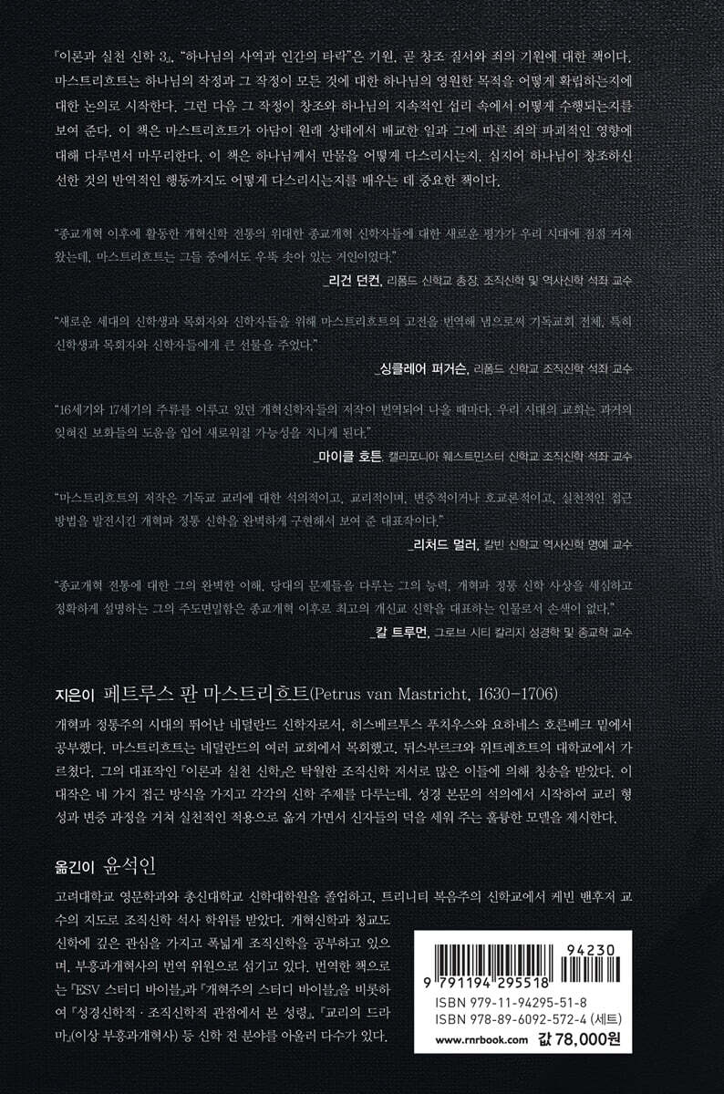 17세기 말에 라틴어로 쓰인 마스트르흐트의 『이론과 실천 신학』은 최초로 18세기 중엽에 네덜란드어로 번역되었고, 두 번째로 2018년부터 영어판으로 발간되는 중이고, 세 번째로 한국어판으로 발간되는 중이다. 한글판은 라틴어에서 직접 번역한 것이 아니라, 원본과 네덜란드 번역판을 참고하고 비평적 연구 결과를 반영한 장점을 가진 영어판에서 번역한 것이다. 특히 한글 번역본을 한국 신학계와 교계에 번역을 통해 큰 공헌을 하고 있는 박문재 목사의 탁월한 번역으로 읽게 된 것은 독자들의 기쁨을 배가시켜 준다.