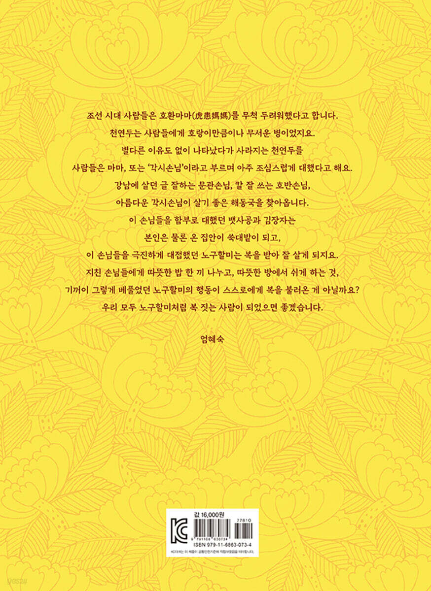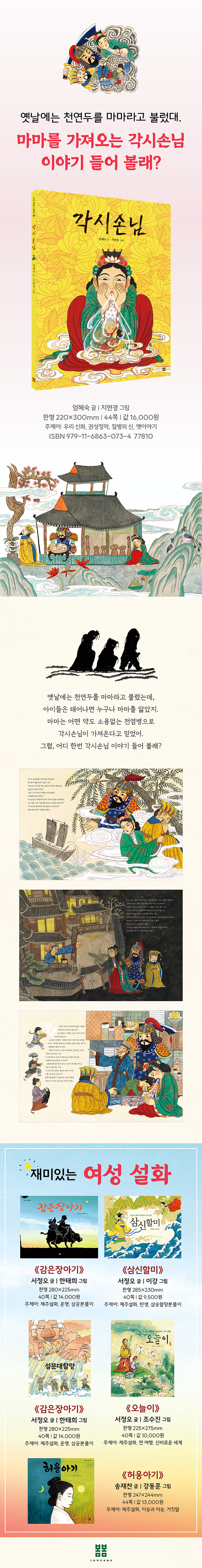 사람들은 마마, 또는 ‘각시손님’이라고 불렀습니다. 조선 시대 사람들은 천연두를 호랑이의 습격만큼 무서운 병이라고 생각했습니다. 천연두는 ‘마마’라고 부르기도 했고, 호랑이의 무서움에 빗대어 ‘호환마마’라고 부르기도 했습니다. 또한 천연두를 타자의 소행으로 생각해 낯설고 먼 곳에서 온 손님, ‘나쁜 것은 외부에 있다’라는 사고방식이 반영되어 ‘각시손님’ 신화가 전해 내려왔습니다. 각시손님은 손님마마, 별상애기, 강남별상 등으로 불리고 가장 무서운 질병의 신으로 여겨졌습니다. 권선징악이라는 옛이야기의 주제를 확실하게 보여 주는 각시손님 이야기에서 질병을 주는 행위는 단순히 징벌을 상징하기보다 전염병이라고 하는 공동체의 재난 속에서 개인의 선택이 악이 아닌 선을 향하도록 하는 것입니다. 지친 손님들에게 따뜻한 밥 한 끼를 나누고, 따뜻한 방에서 쉬게 하는 것, 기꺼이 그렇게 베풀었던 노구할미의 행동이 스스로에게 복을 불러온 것입니다. 어려운 상황에서도 선을 지킨다면 노구할미처럼 복 짓는 사람이 될 것입니다. 옥 같이 흰 얼굴에 분세수 곱게 하고, 삼단 같은 머리 틀어 올리고, 무지개 색 노리개로 치장한 옷차림에 가죽 꽃신을 신은, 곱디고운 각시손님. 그런데 신 중에서도 가장 무서운 신인 각시손님의 이야기를 들어 보세요. |