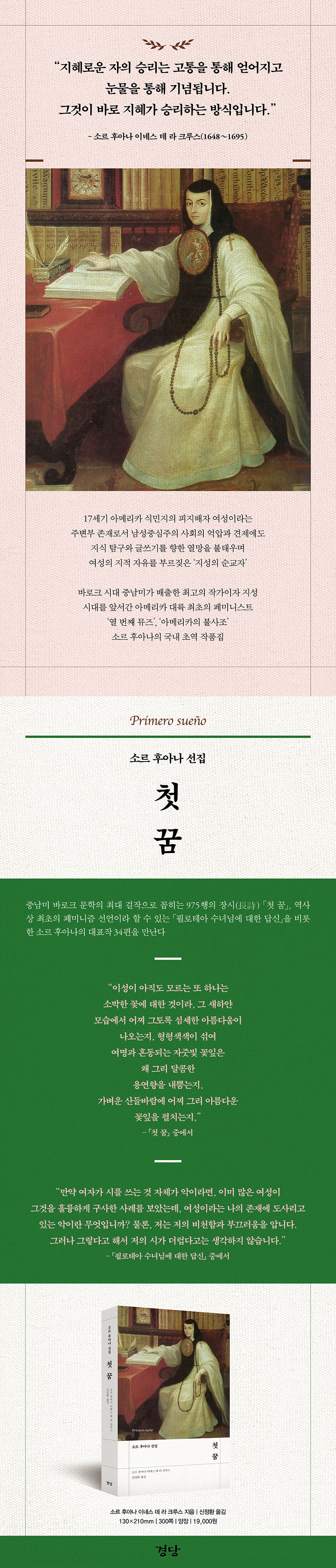 --- p.75 「사랑의 비논리적 현상을 논리적으로 설명함」 중에서 “그 여자가 누구든 상관없어, / 아무리 조신한 여인이라도, / 당신들 거부하면 배은망덕, / 받아들이면 경박하다 하니.” --- p.81 「자기들이 유발한 것을 여성들에게 뒤집어씌우는 남자들의 위선적인 비난과 취향을 통박함」 중에서 “네가 보는 이것, 색깔의 속임수, / 가식적인 색깔의 조합을 통해 / 예술적 아름다움을 뽐내며 / 교묘하게 감각을 속이네. // 이것은 달콤한 말로 세월의 / 공포를 벗어나려 하고, / 시간의 횡포를 무찌르며 / 노화와 망각에 맞서 싸우네. // 하지만 모든 공이 헛되나니, / 바람 앞의 연약한 꽃 한 송이, / 운명 앞의 부질없는 피난처. // 그것은 빗나가 버린 우둔한 노력, / 허망한 헛수고, 설사 좋게 보더라도 / 시체, 먼지, 그림자, 그리고 무(無).” --- p.103 「초상화에게」 중에서 “이성이 아직도 모르는 또 하나는 / 소박한 꽃에 대한 것이라, 그 새하얀 / 모습에서 어찌 그토록 섬세한 아름다움이 / 나오는지, 형형색색이 섞여 / 여명과 혼동되는 자줏빛 꽃잎은 / 왜 그리 달콤한 / 용연향을 내뿜는지, / 가벼운 산들바람에 어찌 그리 아름다운 / 꽃잎을 펼치는지,” --- p.159 「첫 꿈」 중에서 “만약 여자가 시를 쓰는 것 자체가 악이라면, 이미 많은 여성이 그것을 훌륭하게 구사한 사례를 보았는데, 여성이라는 나의 존재에 도사리고 있는 악이란 무엇입니까? 물론, 저는 저의 비천함과 부끄러움을 압니다. 그러나 그렇다고 해서 저의 시가 더럽다고는 생각하지 않습니다.” --- p.283 「필로테아 수녀님에 대한 답신」 중에서 |
