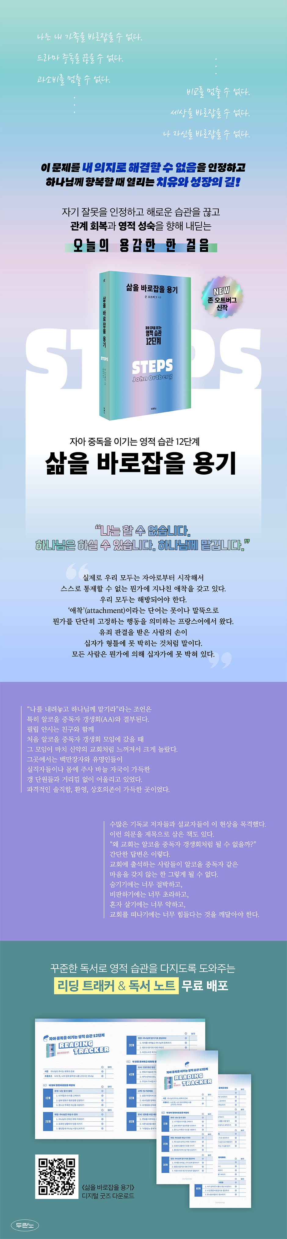 “이건 내가 원했던 삶이 아니야. 더 이상 이렇게 살 수는 없어.”내 성격적 결함 때문에 친구나 가족과 멀어질 때,불안과 분노로 사람들을 힘들게 할 때,나쁜 습관이나 중독에서 벗어날 수 없을 때, “나는 할 수 없습니다. 하나님은 하실 수 있습니다. 하나님께 맡깁니다.”이 문제를 내 의지로 해결할 수 없음을 인정하고 하나님께 항복할 때 열리는 치유와 성장의 길원망과 후회를 해결하고 내적 상처가 회복될 때, 자기 삶을 통제할 수 있다는 자만심을 버릴 때, 우리는 영적으로 성장하며 복된 인생을 살 수 있다. 존 오트버그는 이를 위한 삶의 방식을 모색하다가 알코올 중독자 갱생회(A.A.) 회복 프로그램인 12단계에 주목했다. 사람들은 스스로가 깨닫든 깨닫지 못하든 모두 무언가에 중독되어 있고, 그 중독이 많은 문제의 뿌리이기 때문이다. 사람들은 더 열심히 노력하기만 하면 무엇이든 해낼 수 있다고 자신을 속여 보지만, 결국 탈진한 채 삶을 포기해 버릴 뿐이다. 이 책은 올바른 방향으로 삶을 틀어야 한다는 것은 알지만 자기 의지만으로는 이를 감당할 수 없는 이들을 위한 가이드다. 망가진 삶에 절망한 사람들에게 손 내밀어, 서로 격려하고 힘을 북돋아 주며 이 힘들지만 소망 가득한 길을 차근차근 가 보자고 권면한다. 용기 있게 잘못을 인정하고 해로운 습관을 끊고 관계 회복과 영적 성숙을 향해 내딛게 하는12단계 인생 회복 가이드 이 책이 다루는 주제는 다음과 같다. 첫째, 자신의 삶을 자기 힘으로 고치고 관리하고 통제할 수 있다는 생각은 교만일 뿐이다. 둘째, 삶을 바로잡기 위해 자기 의지가 반드시 필요한 경우와 무의미한 경우가 있으며 이를 구별할 수 있는 지혜가 필요하다. 셋째, 내 힘으로는 할 수 없지만 하나님은 내 유익을 위해 일하실 수 있다. 하나님께서 그렇게 하시도록 내 삶의 주도권을 내드리는 방법은 무엇인가? 넷째, 순전한 마음과 기쁨으로 하나님과 교제하고 다른 사람들과 더불어 살아가는 방법은 무엇인가? 이 책은 우리가 영적으로 무엇에 애착을 갖고 있는지 분별하게 한다. 또한 기도와 묵상 같은 영적 습관을 어떻게 실천할지, 우리의 부족함을 채우시는 하나님의 부요하심을 어떻게 누릴 수 있을지도 알려 준다. 삶을 망치는 습관과 사고방식을 버리고 하나님 사랑과 계획 안에서 새로운 자유와 참된 행복을 찾는 과정을 안내한다.