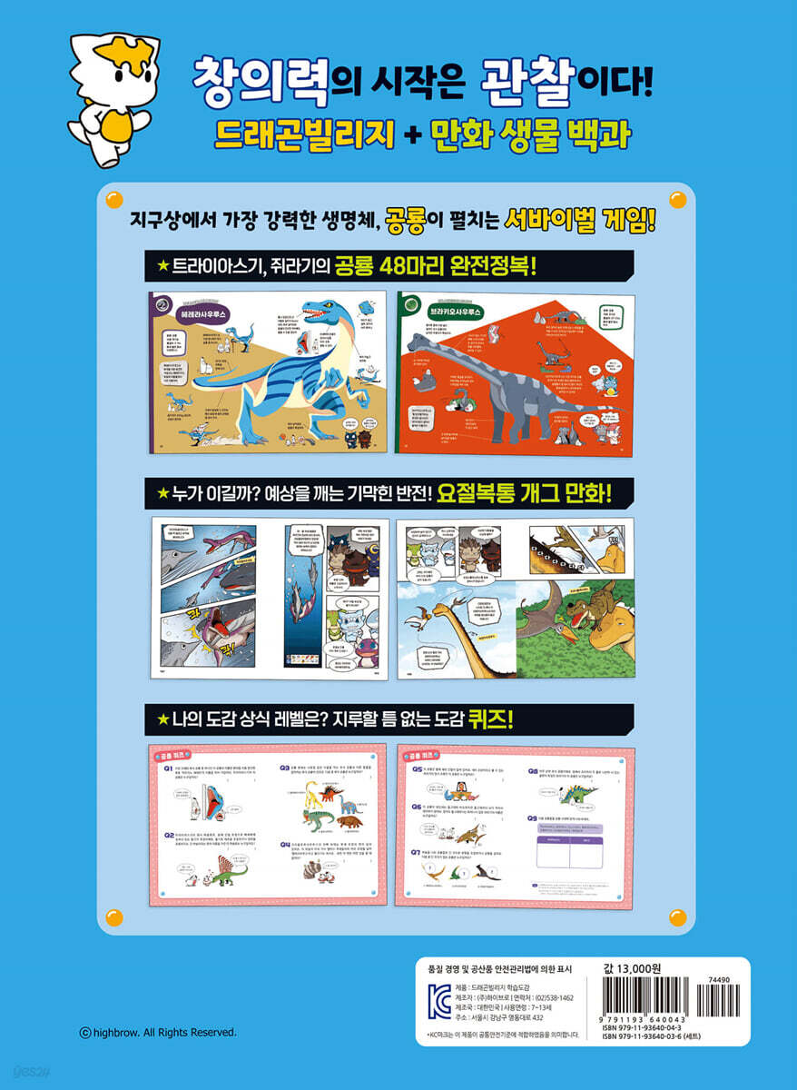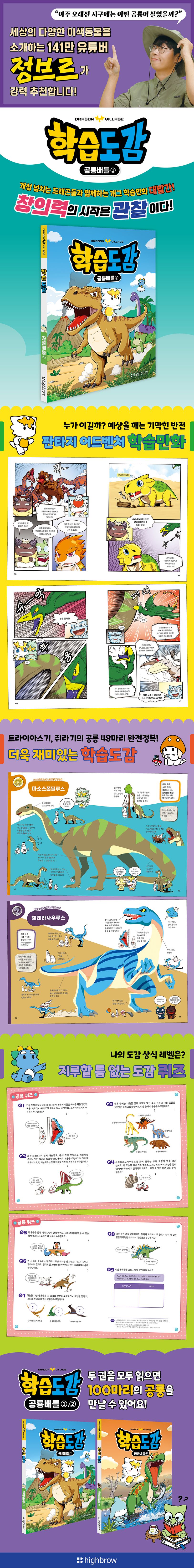한치의 양보도 없는 중생대 공룡들과 개성 넘치는 드래곤 캐릭터가 보여 주는 개그 학습만화. 과연 어느 팀이 우승을 거머쥐게 될까? ● 트라이아스기, 쥐라기의 공룡 48마리를 한눈에! ● 누가 이길까? 예상을 깨는 기막힌 반전, 요절복통 개그 만화! ● 6개 팀으로 등장하는 개성 만점 사고뭉치 드래곤 캐릭터들! ● 위트 넘치는 그림으로 재미있게 배우는 공룡 깨알 상식! 재미있는 학습만화와 시각을 사로잡는 유익한 도감의 콜라보! 트라이아스기, 쥐라기의 공룡 정보는 '도감'으로 한 눈에 파악하고, 각 시대별 공룡 도감이 끝날 때마다 코믹한 만화가 상상력에 날개를 달아 준다. 고정 관념을 깬 개그 만화는 기상천외한 에피소드로 전개되어 평소 책에 관심이 없거나 다소 산만한 아이들까지 사로잡으며 집중력을 높인다. 폭소를 터트리다가, 깜짝 놀랐다가, 다음 상황을 궁금해 하면서 아이들은 자신도 모르게 학습을 하고, 어느새 공룡 48마리의 정보를 술술 외우게 된다. '드래곤빌리지 학습도감' 시리즈는 초등학교 교육 과정에서 필수적으로 다루는 다양한 주제들을 다룬다. '공룡배틀'에서는 초등 저학년들에게 높은 관심을 받고 있는 '공룡'을 주제로 했다. |