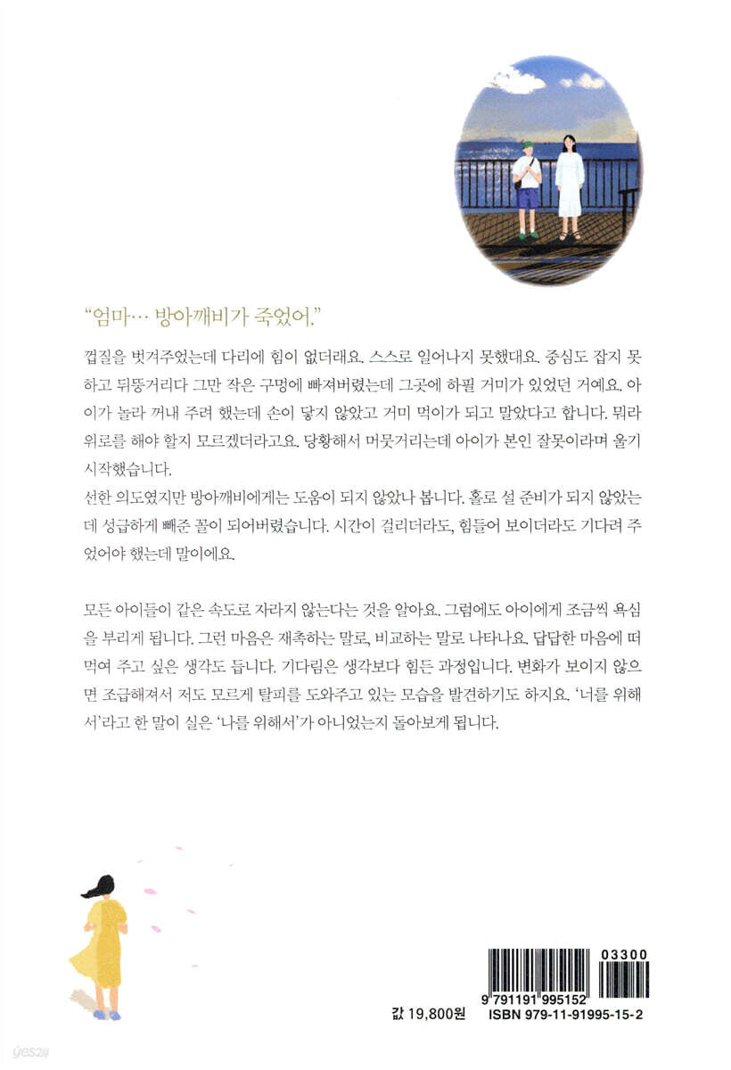 --- p.27 혼자 힘으로 탈피한 아이는 건강합니다. 스스로 해낸 경험은 큰 자산이 될 거예요. 마음을 들여다보고 알아차리는 과정을 겪으며 내가 주인인 삶을 살아갈 수 있으니까요. --- p.63 아이에 대한 크고 작은 정보들과 경험은 너무나 소중한 자료입니다. 어디에서도 구할 수 없는 귀한 자원이죠. 그 어느 때보다도 개별화, 맞춤형 교육이 중요해진 요즘, 아이의 정보가 가득한 저는 세상에서 하나뿐인 우리 아이의 데이터 센터입니다. --- p.94 말이 생각을 단단하게 만들어 주는 것 같아요. “엄마는 널 믿어”라는 말을 하다 보니 정말로 가슴 깊이 믿게 되고요, 진심 가득 담긴 저의 눈빛에 아이는 더 힘을 냅니다. --- p.132 벚꽃을 닮은 아이가 무지개 일곱 빛깔이 아니라는 이유로 빨강인 척, 보라인 척하는 일은 없어야겠습니다. 고유의 매력을 빛내줄 수 있는 건, 특성을 알아차리고 소중히 가꾸어 주는 관심과 정성일 거예요. --- p.141 엉뚱한 짓도 환영합니다. 아이에게는 시도해 보고 깨닫는 소중한 경험이 될 테니까요. 아이들이 아직은 더 자연에서 뛰어놀기를, 때론 별난 짓도 마음껏 꾸며보기를 바랍니다. --- p.152 완벽할 수도, 그럴 필요도 없습니다. 존재만으로도 힘이 되어주고 함께 걸어가는 것으로 충분합니다. 아이의 여정을 완벽히 책임져야만 하는 훈련사가 아니라 길을 잃어도 방향을 찾을 수 있고 담대하게 나갈 수 있는 안내자이면 되는 거지요. --- p.196 오늘도 아이는 품은 보석을 갈고 닦습니다. 당장 쓸데없는 행동처럼 보일지라도 진심인 걸 알기에, 성장하고 있다는 걸 알기에, 함께 즐겨봅니다. 누가 뭐래도 아이의 빛나는 부분을 엄마인 저는 알고 있으니까요. --- p.205 아이는 무한한 가능성을 지닌 존재입니다. 이 대전제를 잊지 말아야겠습니다. --- p.225 |