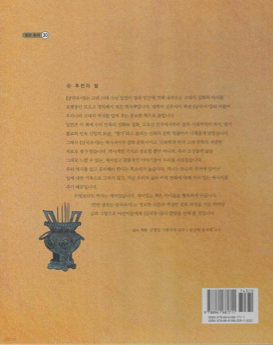 그래서 「삼국유산」는 역사서이자 설화 문학서이고, 민속학과 한국 고대 문학의 귀중한 자료로 평가 받습니다. 역사적인 가치로 중요할 뿐만 아니라, 우리 조상들의 삶을 그대로 느낄 수 있는, 재미있고 감동적인 이야기들이 우리를 사로잡습니다. 우리 역사를 알고 공부해야 한다는 목소리가 높습니다. 역사는 단순히 과거에 일어난 일에 대한 기록으로 그치지 않고, 지금 우리의 삶과 미래 변화에 대해 의미 있는 메시지를 주기 때문입니다. 무엇보다도 역사는 재미있습니다. 재미있는 책은 아이들을 행복하게 만듭니다. 「탄탄 샘솟는 삼국유사」는 정교한 고증과 세심한 검토 과정을 거친 뛰어난 글과 그림으로 어린이들에게 「삼국유사」의 참맛을 전해 줄 것입니다. 감수 위원 김영식 가톨릭대 교수 | 윤선태 동국대 교수 |