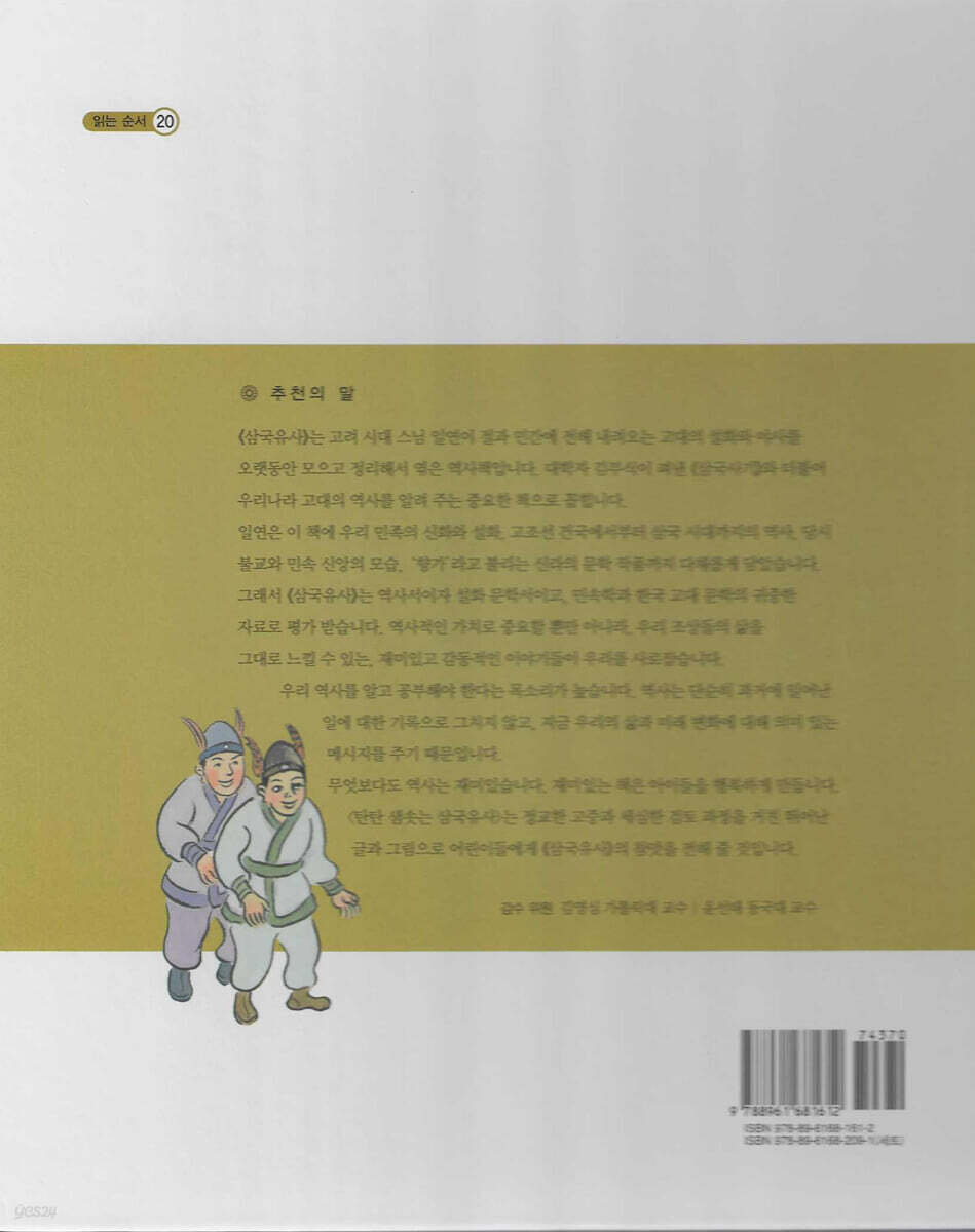 그래서 「삼국유산」는 역사서이자 설화 문학서이고, 민속학과 한국 고대 문학의 귀중한 자료로 평가 받습니다. 역사적인 가치로 중요할 뿐만 아니라, 우리 조상들의 삶을 그대로 느낄 수 있는, 재미있고 감동적인 이야기들이 우리를 사로잡습니다. 우리 역사를 알고 공부해야 한다는 목소리가 높습니다. 역사는 단순히 과거에 일어난 일에 대한 기록으로 그치지 않고, 지금 우리의 삶과 미래 변화에 대해 의미 있는 메시지를 주기 때문입니다. 무엇보다도 역사는 재미있습니다. 재미있는 책은 아이들을 행복하게 만듭니다. 「탄탄 샘솟는 삼국유사」는 정교한 고증과 세심한 검토 과정을 거친 뛰어난 글과 그림으로 어린이들에게 「삼국유사」의 참맛을 전해 줄 것입니다. 감수 위원 김영식 가톨릭대 교수 | 윤선태 동국대 교수 |