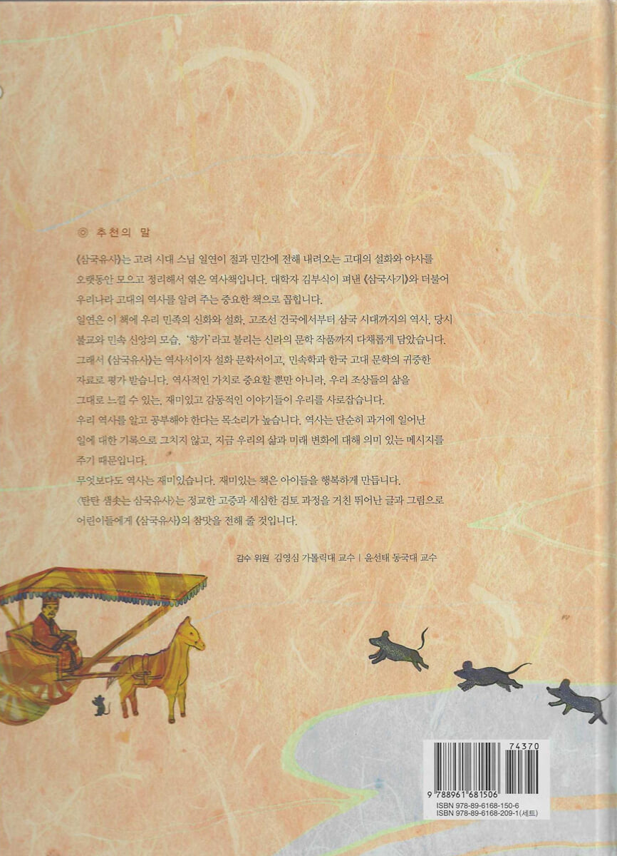 그래서 「삼국유산」는 역사서이자 설화 문학서이고, 민속학과 한국 고대 문학의 귀중한 자료로 평가 받습니다. 역사적인 가치로 중요할 뿐만 아니라, 우리 조상들의 삶을 그대로 느낄 수 있는, 재미있고 감동적인 이야기들이 우리를 사로잡습니다. 우리 역사를 알고 공부해야 한다는 목소리가 높습니다. 역사는 단순히 과거에 일어난 일에 대한 기록으로 그치지 않고, 지금 우리의 삶과 미래 변화에 대해 의미 있는 메시지를 주기 때문입니다. 무엇보다도 역사는 재미있습니다. 재미있는 책은 아이들을 행복하게 만듭니다. 「탄탄 샘솟는 삼국유사」는 정교한 고증과 세심한 검토 과정을 거친 뛰어난 글과 그림으로 어린이들에게 「삼국유사」의 참맛을 전해 줄 것입니다. 감수 위원 김영식 가톨릭대 교수 | 윤선태 동국대 교수 |