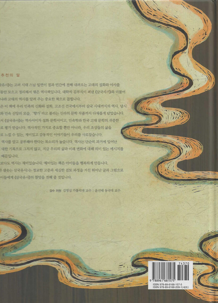그래서 「삼국유산」는 역사서이자 설화 문학서이고, 민속학과 한국 고대 문학의 귀중한 자료로 평가 받습니다. 역사적인 가치로 중요할 뿐만 아니라, 우리 조상들의 삶을 그대로 느낄 수 있는, 재미있고 감동적인 이야기들이 우리를 사로잡습니다. 우리 역사를 알고 공부해야 한다는 목소리가 높습니다. 역사는 단순히 과거에 일어난 일에 대한 기록으로 그치지 않고, 지금 우리의 삶과 미래 변화에 대해 의미 있는 메시지를 주기 때문입니다. 무엇보다도 역사는 재미있습니다. 재미있는 책은 아이들을 행복하게 만듭니다. 「탄탄 샘솟는 삼국유사」는 정교한 고증과 세심한 검토 과정을 거친 뛰어난 글과 그림으로 어린이들에게 「삼국유사」의 참맛을 전해 줄 것입니다. 감수 위원 김영식 가톨릭대 교수 | 윤선태 동국대 교수 |