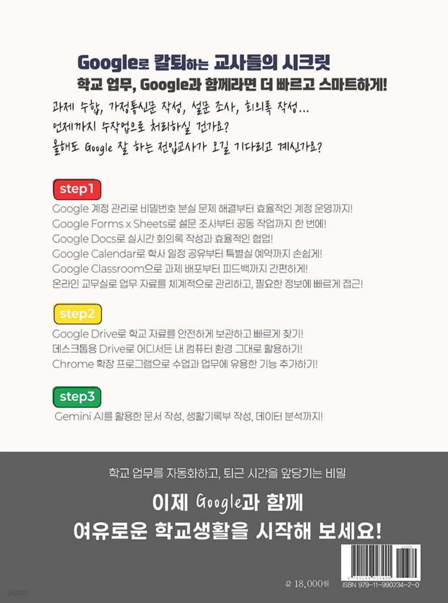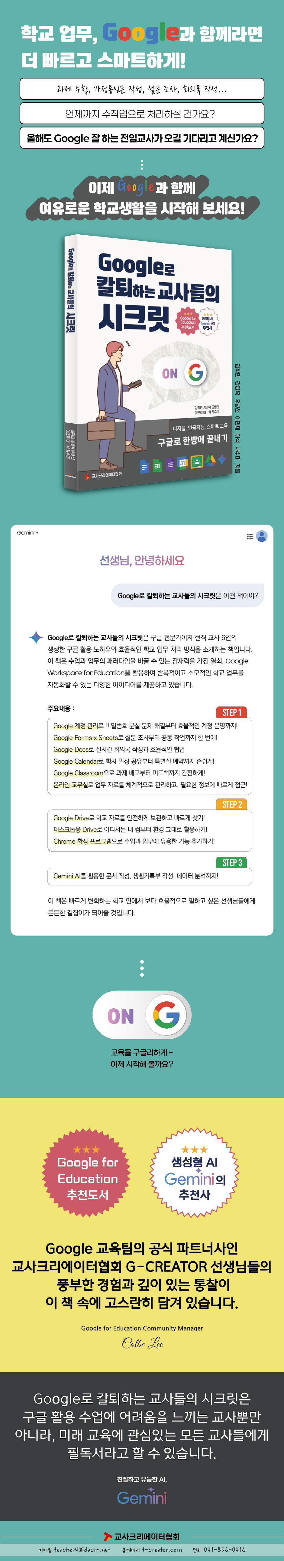 빠르게 급변하는 사회, 더 나아가 학교 현장의 교실도 빠르게 변화하고 있습니다. 그 중심에 학생들이 잘 적응할 수 있도록 도와주고 미래인재 양성에 항상 힘써주시는 선생님들이 있습니다. 많은 업무와 수업으로 바쁘신 선생님들, 교육의 위상을 높이기 위해서라도 선생님들의 업무 경감은 필수적인 일입니다. Google도구와 생성형 AI인 Gemini를 교육에서도 활용한다면 선생님들의 업무 경감에 조금이나마 보탬이 되지 않을까 생각합니다. 아직도 Google도구가 익숙하지 않은 선생님들에게는 ‘Google로 칼퇴하는 교사들의 시크릿’이라는 책이 그 해결책이 되어 줄 것입니다. Google 교육팀의 공식 파트너사인 교사크리에이터협회 G-CREATOR 선생님들의 풍부한 경험과 깊이 있는 통찰이 이 책 속에 고스란히 담겨있기 때문입니다. 협업과 소통 도구의 대명사인 Google Workspace, Google의 생성형 AI Gemini를 완벽하게 이해하고 활용하고 싶다면, 더 나아가 학교 현장에서 업무 경감이 필요하다면 반드시 읽어야 할 필독서입니다. 이 책을 완독한 선생님들은 Google 도구의 전문가가 될 것입니다. - Colbe Lee (Google for Education, Community Manager)
