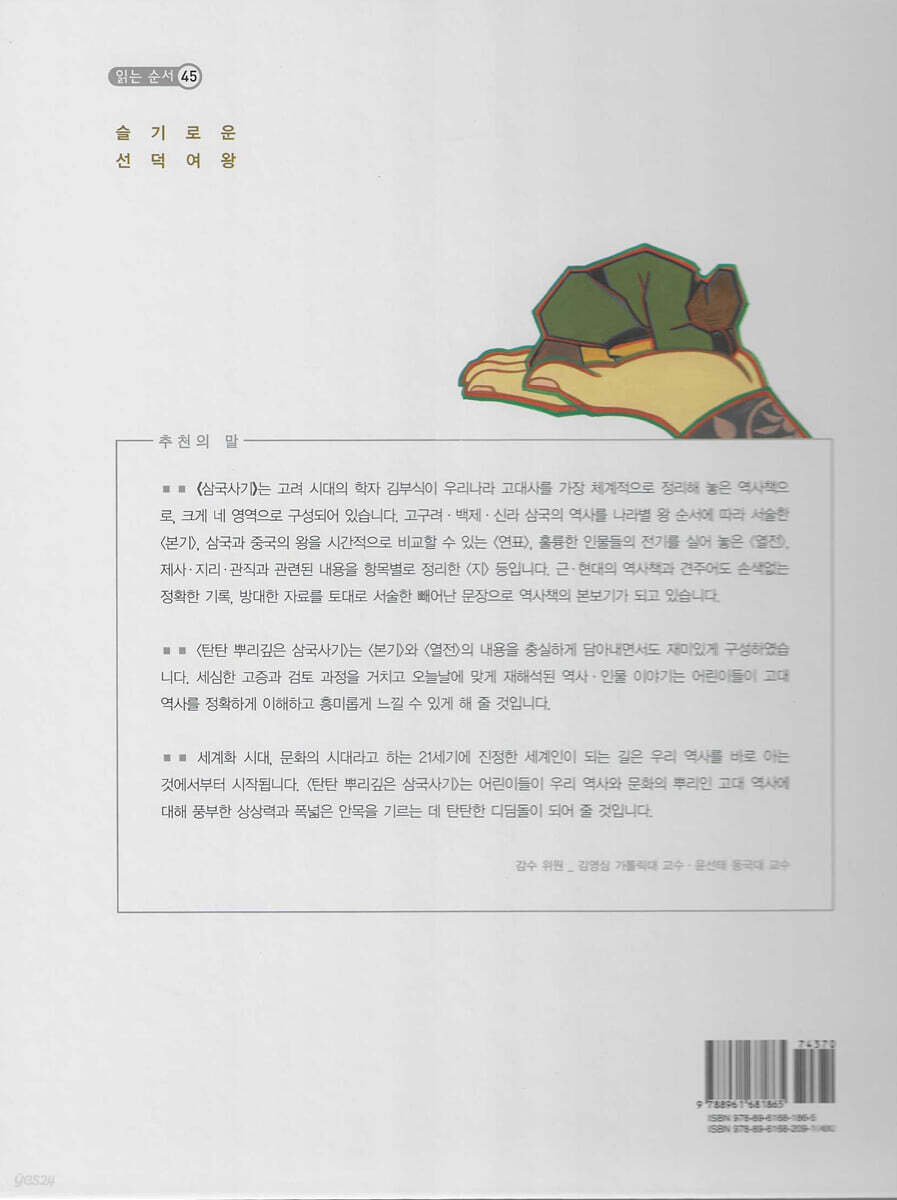 일연은 이 책에서 우리 민족의 신화와 설화, 고조선 건국에서부터 삼국 시대까지의 역사, 당시 불교와 민속 신앙의 모습, ‘향가’라고 불리는 신라의 문학 작품까지 다채롭게 담았습니다. 그래서 「삼국유산」는 역사서이자 설화 문학서이고, 민속학과 한국 고대 문학의 귀중한 자료로 평가 받습니다. 역사적인 가치로 중요할 뿐만 아니라, 우리 조상들의 삶을 그대로 느낄 수 있는, 재미있고 감동적인 이야기들이 우리를 사로잡습니다. 우리 역사를 알고 공부해야 한다는 목소리가 높습니다. 역사는 단순히 과거에 일어난 일에 대한 기록으로 그치지 않고, 지금 우리의 삶과 미래 변화에 대해 의미 있는 메시지를 주기 때문입니다. 무엇보다도 역사는 재미있습니다. 재미있는 책은 아이들을 행복하게 만듭니다. 「탄탄 샘솟는 삼국유사」는 정교한 고증과 세심한 검토 과정을 거친 뛰어난 글과 그림으로 어린이들에게 「삼국유사」의 참맛을 전해 줄 것입니다. 감수 위원 김영식 가톨릭대 교수 | 윤선태 동국대 교수 |