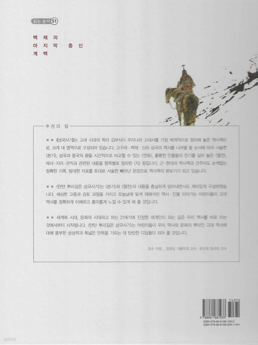 일연은 이 책에서 우리 민족의 신화와 설화, 고조선 건국에서부터 삼국 시대까지의 역사, 당시 불교와 민속 신앙의 모습, ‘향가’라고 불리는 신라의 문학 작품까지 다채롭게 담았습니다. 그래서 「삼국유산」는 역사서이자 설화 문학서이고, 민속학과 한국 고대 문학의 귀중한 자료로 평가 받습니다. 역사적인 가치로 중요할 뿐만 아니라, 우리 조상들의 삶을 그대로 느낄 수 있는, 재미있고 감동적인 이야기들이 우리를 사로잡습니다. 우리 역사를 알고 공부해야 한다는 목소리가 높습니다. 역사는 단순히 과거에 일어난 일에 대한 기록으로 그치지 않고, 지금 우리의 삶과 미래 변화에 대해 의미 있는 메시지를 주기 때문입니다. 무엇보다도 역사는 재미있습니다. 재미있는 책은 아이들을 행복하게 만듭니다. 「탄탄 샘솟는 삼국유사」는 정교한 고증과 세심한 검토 과정을 거친 뛰어난 글과 그림으로 어린이들에게 「삼국유사」의 참맛을 전해 줄 것입니다. 감수 위원 김영식 가톨릭대 교수 | 윤선태 동국대 교수 |