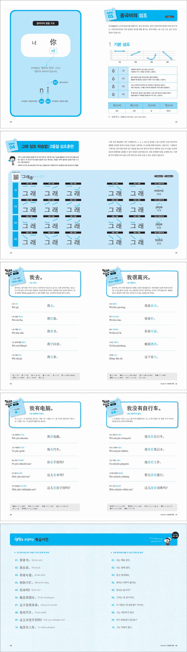 01 중국어의 성조 02 중국어의 병음 03 중국어의 한자 04 그래 성조 학습법: 2음절 성조훈련 05 성조훈련 40일 체크리스트 Part1 중국어로 말문을 틔워주는 중국어 기초패턴 (볼드 처리) Chapter 01 기본문형 패턴 001 나는 간다. | ~가 ~하다 주어+동사 002 나는 즐겁다. | ~가 ~하다 주어+형용사 003 나는 안 간다. | ~하지 않다 不… 004 당신은 옵니까? | ~입니까? …?? 005 나는 학생이다. | ~이다 是… 006 나는 중국인이 아니다. | ~가 아니다 不是… 007 나는 컴퓨터가 있다. | ~가 있다 有… 008 나는 자전거가 없다. | ~가 없다 ?有… 001~008 대박을 보장하는 복습시간 Chapter 02 기본동사 패턴 009 나는 시장에 간다. | ~에 가다 去… 010 그가 한국에 온다. | ~에 오다 ?… 011 엄마는 부엌에 계세요. | ~에 있다 在… 012 아이가 숙제를 한다. | ~를 하다 做… 013 나는 영화를 본다. | ~를 보다 看… 014 또 만나요!, 안녕! | ~를 만나다 ?… 015 그가 밥을 먹는다. | ~를 먹다 吃… 016 나는 물을 마신다. | ~를 마시다 喝… 017 선생님이 말씀을 하신다. | ~를 말하다 ?… 018 나는 음악을 듣는다. | ~를 듣다 ?… 019 나는 글자를 쓴다. | ~를 쓰다 ?… 020 앉으세요! | ~에 앉다 坐… 021 나는 당신을 사랑해요. | ~를 사랑하다 ?… 022 그녀는 전화를 건다. | ~를 때리다, 전화 걸다 打… 023 너 뭐 배워? | ~를 배우다 ?… 024 나는 옷을 산다. | ~를 사다 ?… 025 문 열어! | ~를 열다 ?… 026 나는 옷을 입는다. | ~를 입다 穿… 009~026 대박을 보장하는 복습시간 Chapter 03 형용사 패턴 027 방이 크다. | 크다 大 028 거실이 작다. | 작다 小 029 사람이 너무 많다. | 많다 多 030 인구가 너무 적다. | 적다 少 031 그는 잘 지내. | 좋다 好 032 그는 나쁜 사람이다. | 나쁘다 ? 033 하늘이 높다. | 높다 高 034 그녀는 키가 작다. | 작다 矮 035 머리카락이 길다. | 길다 ? 036 목이 짧다. | 짧다 短 037 속도가 빠르다. | 빠르다 快 038 속도가 느리다. | 느리다 慢 039 문제가 어렵다. | 어렵다 ? 040 내용이 쉽다. | 쉽다 容易 041 날씨가 춥다. | 춥다 冷 042 홍콩은 덥다. | 덥다 ? 043 당신은 예뻐요. | 예쁘다 漂亮 044 당신은 똑똑하군요. | 똑똑하다 ?明 045 과일이 비싸다. | 비싸다 ? 046 바나나는 싸다. | 싸다 便宜 027~046 대박을 보장하는 복습시간 Chapter 04 의문사 패턴 047 누구세요? | 누구 ? 048 당신은 어느 나라 사람입니까? | 어느 ? 049 너 어디 가? | 어디 ?? 050 이것은 무엇입니까? | 무엇 什? 051 나 어떻게 하지? | 어떻게 ?? 052 당신 건강은 어때요? | 어떠하다 ??? 053 당신은 왜 웃어요? | 왜 ?什? 054 너는 언제 와? | 언제 什??候 055 이거 얼마예요? | 얼마 多少 056 당신 몇 개 갖고 있어요? | 몇 ? 057 당신이 갈래요, 아니면 제가 갈까요? | 또는 ?是 058 당신은 갈 거예요, 안 갈 거예요? | ~입니까, 아닙니까? …不…? 059 그 사람은 학생 아닙니까? | ~아닙니까? 不是…?? 047~059 대박을 보장하는 복습시간 Chapter 05 了·着·? 패턴 060 나는 밥을 먹었다. | ~했다(완료) 문장 끝의 了 061 저 취직했어요. | 변화와 어감조절 문장 끝의 了 062 나는 오늘 딱 한 끼 먹었어요. | ~했다(완료) …了 063 나는 오늘 밥 안 먹었어요. | ~하지 않았다 ?… 064 그는 양말을 신고 있다. | ~하고 있다 着… 065 그는 양말을 신고 있지 않다. | ~하고 있지 않다 ?…着 066 나는 중국에 가 본 적이 있다. | ~한 적이 있다 ?… 067 나는 일본에 가 본 적이 없다. | ~한 적이 없다 ?…? 060~067 대박을 보장하는 복습시간 Chapter 06 조동사 패턴 068 이 일 네가 할 수 있겠어? | ~할 수 있다 能… 069 나 들어가도 돼요? | ~해도 된다 可以… 070 나는 운전을 할 수 있다. | ~할 수 있다 ?… 071 나는 운전을 할 줄 모른다. | ~할 줄 모른다 不?… 072 그가 올까요? | ~할 것이다 ?… 073 나는 베이징에 가려고 한다. | ~하려고 하다 要… 074 나는 빵이 먹고 싶다. | ~하고 싶다 想… 075 나는 초밥이 먹고 싶지 않다. | ~하고 싶지 않다 不想… 076 부모님은 마땅히 아이를 돌봐야 한다. | 마땅히 ~해야 한다 ??… 077 부모는 아이를 때려서는 안 된다. | ~하면 안 된다 不??… 068~077 대박을 보장하는 복습시간 Chapter 07 일반부사 패턴 078 나는 잘 지내, 너는 어때? | 매우 ? 079 저도 한국사람입니다. | ~도 …也 080 우리는 모두 중국어를 공부한다. | 모두, 벌써 都 081 제가 지금 바로 갈게요! | 곧 就 082 나는 또 아이스크림이 먹고 싶다. | 또, 아직, 그런대로 ? 083 또 만나요!, 안녕히 가세요! | 또, 다시 再 084 아빠는 또 감기에 걸리셨다. | 또, 다시 又 085 아빠는 이제야 출근을 한다. | 이제야 才 086 그 사람은 벌써 갔다. | 이미, 벌써 已? 087 말하지 마! | ~하지 마라 ?… 088 나는 책을 보고 있다. | ~하고 있는 중이다 正在…? 089 당신은 내일 꼭 와야 해요. | 꼭, 반드시 一定 090 그는 늘 지각을 한다. | 늘, 항상 常常 091 나는 어렸을 때 개구쟁이였다. | ~할 때 …的?候 078~091 대박을 보장하는 복습시간 Chapter 08 전치사구 패턴 092 나는 교실에서 수업을 한다. | ~에서 在… 093 제가 당신에게 음악을 들려 드릴게요. | ~에게 ?… 094 우리 여기에서 출발하자! | ~부터 ?… 095 그 사람 어디에 갔어요? | ~에, ~까지 到… 096 나는 당신과 함께 가겠다. | ~와 ?… 097 그 사람 당신에게 잘해 줘요? | ~에게 ?… 098 문을 여세요! | ~를 ~하다 把+목적어+동사 099 나 그 사람한테 차였어. | ~