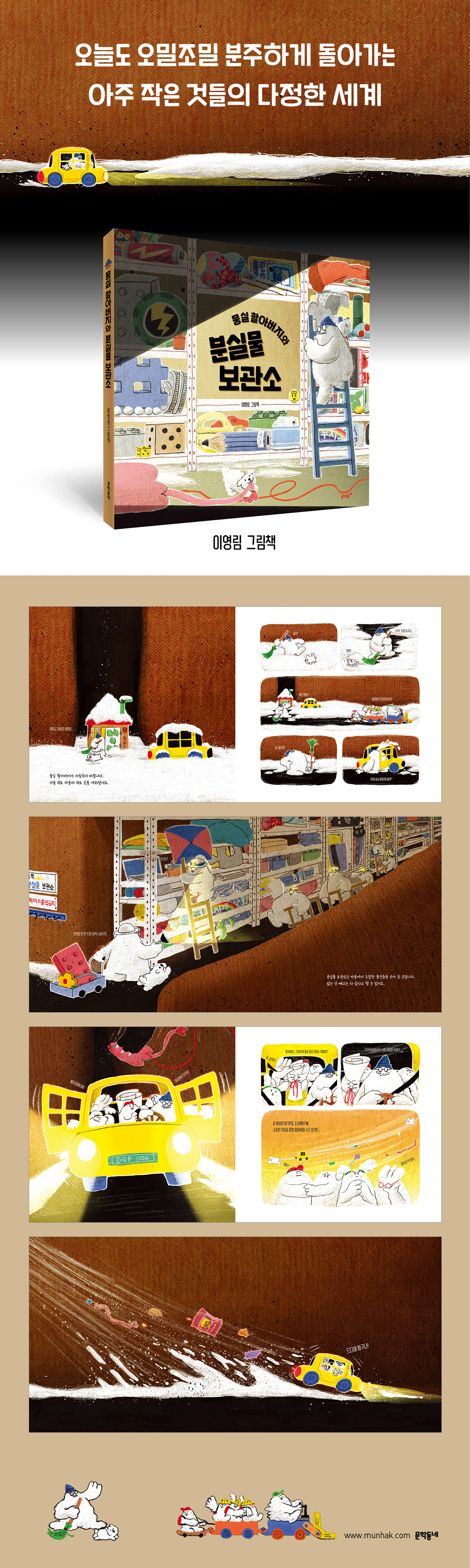 아주 작은 것들의 다정한 세계 놀이터에서 신나게 놀고 있는 아이들 위로 따닥 따닥, 어두운 그림자가 드리웁니다. 한시가 다급한 순간, 할아버지와 멍뭉이는 기지를 발휘해 ‘낚시 작전’을 펼칩니다. 우는 아이에게는 누구라도 뚝 그칠 비장의 무기를 내밀지요. 할아버지의 노란 자동차는 스릴 넘치는 골목골목을 누빕니다. 뭉실 할아버지가 오늘 더 특별하게 대비하고 있는 것은 바로 바람입니다. 그 시기에는 긴장을 놓을 수 없거든요. 바람이 뭐냐고 묻는 아이들에게 할아버지는 말합니다. "조심해야 해. 소중한 것들을 몽땅 잃어버릴 수도 있거든." 거센 바람 앞에 선 아이들과 할아버지. 드디어 준비했던 특별 작전을 완수해 낼 때입니다. 늘 평화롭고 안전했던 일상이 누군가의 다정한 수고로움 덕분이었음을 알게 된 아이들이 돌아온 세계는 그 전과는 완전히 달라진 세상입니다. 일기에 꼭 적고 싶을 만큼 말이지요. 소파 틈새에서 몽실몽실 피어오른 유쾌하고 사랑스러운 이영림 작가 표 판타지 할아버지와 아이들은 왜 이토록 몽실몽실 보드랍고 새하얀 모습을 하고 있을까요? 또 곧게 뻗은 도로는 왜 유난히 좁고 어두울까요? 분실물 보관소에 모인 지우개, 사탕, 레고 블록, 머리끈, 리모컨 따위의 물건들은 어쩐지 무척 낯익습니다. 익숙한 등원 길은 신나는 탐험 길로(『대단한 아침』), 과속 방지턱을 넘는 시내버스는 새로운 세계로의 점프대로(『달그락 탕』) 만들고, 메고 있는 가방 속에는 저마다의 꿈을 담아 온(『가방을 열면』) 이영림 작가가 이번에는 우리가 들여다보지 않았던 소파 틈새를 비춥니다. 만화적인 구성, 힘 있는 스펙터클과 반전, 개성적인 캐릭터들은 눈에 보이지 않지만 분명히 존재하는 세계를 돌아보게 합니다. 한집에 살고 있는 가족들을 흐뭇하게 바라보는 뭉실 할아버지는 평범하고도 비범한 우리의 매일을 지탱하고 있는 곳곳의 존재들을 떠올려 보게 합니다. 어느 한구석, 작디작은 존재들이 일상을 지키기 위해 이토록 고군분투하고 있었을 줄 아셨나요? 여러분의 거실 소파 뒤에서도 지금, 오밀조밀 작은 세계가 움직이고 있는지도 모릅니다! |