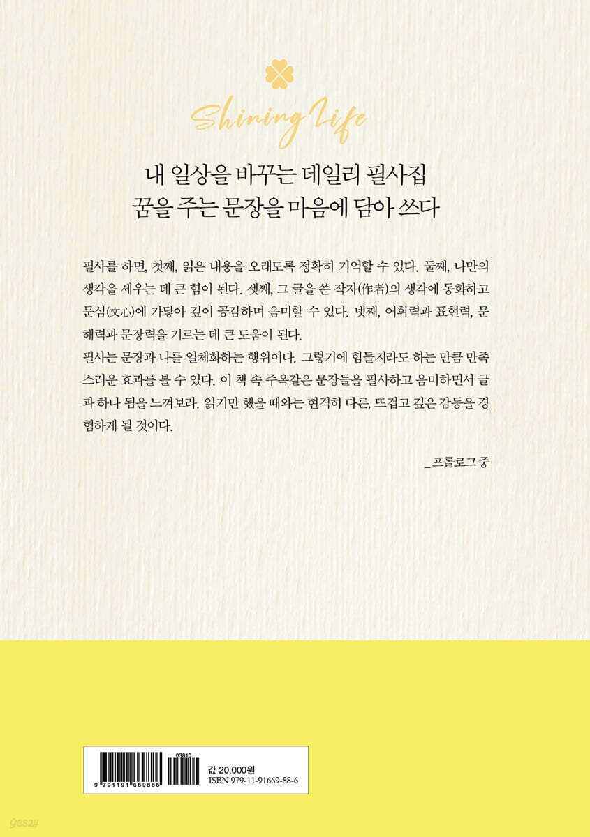 어휘력, 표현력, 문해력, 문장력을 키우는 인생 명문장 필사를 하면, 첫째, 읽은 내용을 오래도록 정확히 기억할 수 있다. 둘째, 나만의 생각을 세우는 데 큰 힘이 된다. 셋째, 그 글을 쓴 작자(作者)의 생각에 동화하고 문심(文心)에 가닿아 깊이 공감하며 음미할 수 있다. 넷째, 어휘력과 표현력, 문해력과 문장력을 기르는 데 큰 도움이 된다. 필사는 문장과 나를 일체화하는 행위이다. 그렇기에 힘들지라도 하는 만큼 만족스러운 효과를 볼 수 있다. 이 책은 필사가 주는 매력적인 효과를 극대화하기 위해 ‘삶의 지혜를 길러주는 깨달음의 문장들’, ‘신념과 믿음과 마음을 단단하게 해주는 문장들’, ‘이상과 용기를 길러주는 지혜의 문장들’, ‘어휘력과 문해력을 길러주는 사색의 인생 문장들’, ‘나를 깨우고 변화시키는 명시 그리고 명문장들’, ‘사랑과 행복을 전해주는 푸른 서정과 사랑의 문장들’ 등 총 6장으로 구성했다. 날마다 이 책 속 주옥같은 문장들을 필사하고 음미하면서 글과 하나 됨을 느껴보자. 읽기만 했을 때와는 현격히 다른, 뜨겁고 깊은 감동을 경험하며 그렇게 매일 나를 다듬자. |