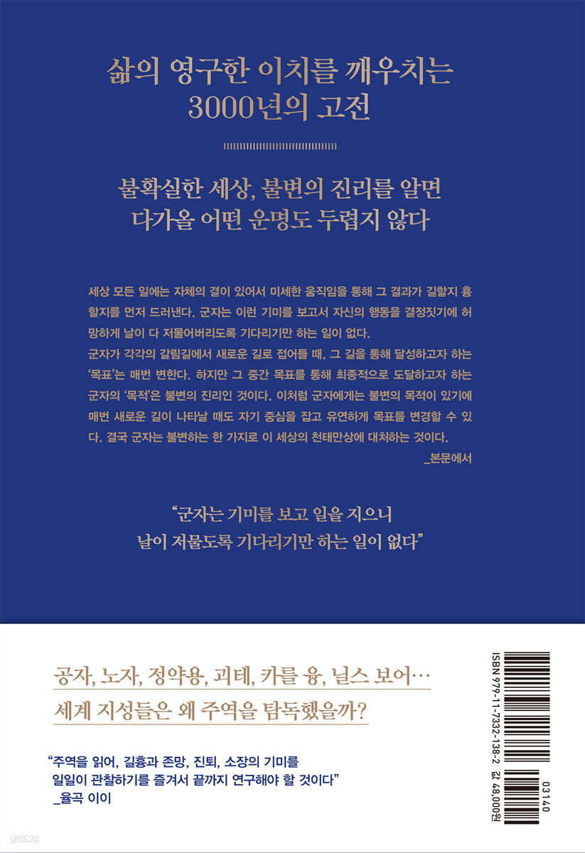 --- 「들어가며」 중에서 원래 세상 모든 일에는 자체의 결이 있어서 미세한 움직임을 통해 그 결과가 길할지 흉할지를 먼저 드러낸다. 군자는 이런 기미를 보고서 자신의 행동을 결정짓기에 허망하게 날이 다 저물어버리도록 기다리기만 하는 일이 없다. 곤의 도를 설명하는 과정에 왕이 등장하는 것은 사실 당연한 것이기도 하다. 누구나 자기 인생의 왕이기 때문이다. 나의 왕국, 나의 우주는 나의 주변 사람들로 구성된다. 나이가 들면 좋든 싫든 누구나 장(長)이 된다. 오십 대를 장년(長年)이라 하는데 ‘장이 되는 나이’라는 뜻이다. 장은 곧 황극의 자리, 소우주의 중심에 선 사람이며, 주변 사람들이 의지할 수 있는 사람을 이르는 말이다. 이러한 장의 자리는 얼마나 막중한 책임인가? 주변의 중심을 잡아주어야 하며, 주변 사람들의 의지처가 되어주어야 한다. ‘장’이라고 해서 꼭 거창하지만은 않다. 부모는 자식의 의지처가 되어주어야 한다. 자기 우주의 왕은 누구도 아닌 나인 것이다. --- 「2. 곤坤」 중에서 가득 찬 것을 미워하고 겸허함을 좋아하는 것이 우리 우주에 새겨진 결이다. 과연 그럴까 싶은데, 이런 현상은 우리 삶에서 직접 관찰할 수 있고 사람들 역시 이 이치를 무의식중에 알고 있다. 그래서 사람들은 싸울 때 모두 내가 약자라고 자처한다. “아이고, 나 죽네. 힘 있는 놈이 힘없는 사람을 팬다”고 호소한다. 그래야 사람들이 자기편을 들어 줄 것임을 알기 때문이다. 또한 영화, 드라마를 보면 주인공이 모두 약자로 설정된다. 주인공보다 훨씬 더 강한 악당이 등장해 주인공을 괴롭힌다. 피디나 감독은 사람들이 무엇을 좋아하는지에 가장 민감한 사람들이다. 이들은 그렇게 설정해야 시청자들이 약자인 주인공에 감정이입 한다는 사실을 잘 알고 있다. 가득 찬 쪽은 우주의 도움을 받을 수 없다는 사실을 잘 알고 있는 것이다. 그러므로 가득 참이 강한 것이 아니라 겸허함이 강하다는 사실을 알아야 한다. 그래서 군자는 겸(謙)의 도로 나아가는 것이다. --- 「15. 겸謙」 중에서 박의 길에서 군자에게 닥친 다섯 번의 시련의 의미는 여기에 있다. 剝(박)은 ‘벗기다’ ‘박탈하다’라는 뜻인데, 그동안은 ‘박탈’에 초점을 맞추어 말해왔다. 하지만 박탈이 곧 벗겨냄이다. 본질이 아닌 겉 포장, 알맹이가 아닌 거품, 진짜가 아닌 가짜, 영원한 것이 아닌 순간의 것들을 군자에게서 모두 벗겨내는 것이 박의 길이며, 이런 과정을 거친 끝에 그만큼 단단해진 석과를 남기는 것이 또한 박의 길이다. --- 「23. 박剝」 중에서 가고자 하는 바의 목적은 군자가 큰 과오[대과大過(28)]를 범한 순간에도 위기를 넘어설 수 있는 원동력으로 작용했으며, 광명의 횃불이 꺼지고 만 절체절명의 순간[리離(30)]에도 국면을 역전하는 동력이 되어주고 있다. 이처럼 군자가 가고자 하는 바의 목적은 괘마다 결정적 순간에 해결의 실마리가 되어준다. 이런 군자의 ‘목적’은 변하는 것이 아니다. 군자가 각각의 갈림길에서 새로운 길로 접어들 때, 그 길을 통해 달성하고자 하는 ‘목표’는 매번 변한다. 하지만 그 중간 ‘목표’를 통해 최종적으로 도달하고자 하는 군자의 ‘목적’은 불변의 진리인 것이다. --- 「함咸·항恒─불변응만변不變應萬變」 중에서 군자가 제 도리를 다할 때 땅 위의 현실이 하늘의 뜻을 따라가게 됨을 알 수 있다. 사람이 하늘과 땅 사이에 선 존재이면서도 하늘에 짝한다는 말을 들을 수 있는 것은 이 때문이다. 하늘의 뜻이 땅에서도 이루어지도록 힘을 보태는 존재가 사람이기 때문이다. 그러므로 사람이 하늘, 땅과 더불어 이 세상을 이루는 세 가지 바탕[三才]이 되는 것이다. --- 「하늘과 땅 사이 사람의 길─천지인天地人 삼재三才」 중에서 자신에게 부여된 천명이 무엇인지를 분명히 정립하고 그에 전념하는 것이 스스로 한계를 둘러치는 것이다. 자신에게 부여된 천명에 집중하는 것으로 한계를 두르고 거기에 머무른다면 가장 편안히 절제에 머무를 수 있다. 또한 그렇게 해야 노력을 집중할 수 있어서 자신에게 부여된 소명을 완수할 수 있는 것이다. --- 「60. 절節」 중에서 |