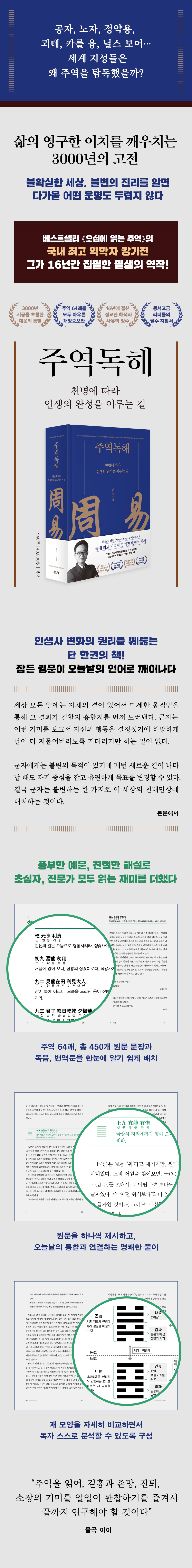 3000년의 고전, 『주역』 변화가 가속화되는 AI시대, 사회와 개인은 심화하는 불확실성에 맞서 미래를 예측하려 부단히 애쓰고 있다. 정치가, 관료, 기업가, 경제학자 등은 예측력을 높이기 위해 심혈을 기울이고 개인은 자기 삶의 앞날을 내다보기 위해 수많은 정보를 섭렵하고 있다. 그러나 인터넷, SNS 등의 발달로 접하는 정보량은 많지만 변화 그 자체의 ‘근본 원리’를 파악하려면 또 다른 노력이 필요하다. 『주역』은 3000년의 세월을 이어온 명실상부 동양 최고(最古)의 고전이다. 동양 문화의 뿌리라고 할 수 있으며, 공자가 『주역』을 즐겨 읽어 책의 가죽끈이 세 번 끊어졌다는 사자성어 ‘위편삼절(韋編三?)’로도 유명하다. 공자뿐 아니라 노자, 정약용, 괴테, 카를 융, 닐스 보어 등 동서양 지성들이 탐독했을 만큼 『주역』은 오랜 시간 인류에 큰 영향을 끼쳐왔다. 무엇보다 『주역』은 변화 그 자체의 원리와 전개를 다루는 책이다. 따라서 사회와 삶의 모습이 급변하는 지금이야말로 필독해야 하는 고전이다. 그러나 현대인에게는 생소한 괘상(괘 모양)이나, 추상화된 원문은 배경지식 없이 읽기에 만만찮다. 국내 최고의 역학자가 오늘날의 언어로 풀어내는 『주역』 해설의 결정판 『주역독해』는 『주역』의 고유한 뜻을 온전히 전하면서도, 오늘날의 언어로 풀어낸 해설서이다. 저자 강기진은 베스트셀러 『오십에 읽는 주역』으로 『주역』 대중화에 앞장선 역학자로서 무려 16년간 『주역독해』의 집필에 전념했다. 이 책은 2017년과 2018년에 ‘상경’과 ‘하경’으로 나뉘어 처음 출간되었는데, 당시 과학적 해석과 예리한 통찰, 친절하고 자세한 설명으로 독자들의 큰 호평을 받았다. 출간 후 8년이 지난 지금까지 재출간 문의가 있을 정도로 독자들의 열렬한 관심이 이어졌다. 김영사에서 새롭게 선보이는 합본 개정증보판 『주역독해』는 초판 출간 이후 저자의 농익은 시각과 연구, 경험을 더해 더욱 정밀히 다듬고 보완했다. 나아가 지금 현실에 맞게 풀어내 인생사에 불안해하는 누구나 그 변화의 이치를 깨닫게 하는 책으로 환골탈태했다. 동서양 고전을 넘나드는 예문과 해설, 풍부한 동양학 지식으로 방대한 『주역』을 더욱 깊이 이해할 수 있도록 안내한다. 『주역』을 처음 접하는 독자도 쉽게 파악할 수 있도록 설명하면서도, 해석의 깊이도 함께 잡고 있어서 초심자와 전문가 모두 읽는 재미를 배가한다. 앞날을 예측할 지혜를 전하는 『주역독해』 64가지 인생 지도로 깨치는 운명의 무늬 ‘주역(周易)’은 ‘주(周)나라의 역(易)’이라는 뜻으로, 은(殷)나라의 점인(占人)들이 정립했고, 은나라를 멸하고 들어선 주나라가 자신들의 이름을 붙여 명명했다. 은나라는 국가의 대소사를 모두 점을 쳐서 묻고 결정했는데, 이를 주관하는 ‘점인 집단’이 있었고 왕이 이들의 우두머리였다. 점인들은 점의 예측력을 높이기 위해 애썼는데, 대를 이어 점친 결과를 체계적이고 엄정히 관리해 틀린 것은 버리고 들어맞는 것은 보관했다. 이런 노력은 무려 수천 년간 지속되었고, 이 과정에서 점인들은 점친 내용이 몇 가지 범주로 수렴된다는 사실을 발견했다. 이를 ‘64괘’라 부르며, 『주역』에서는 우리가 인생을 살아갈 때 마주칠 수 있는 64가지 상황으로 제시한다. 즉 사람이 인생길을 걸어갈 때 64가지 길의 종류가 있다는 것이다. 이처럼 『주역』은 수천 년간 지속한 인류 집단 지성의 결과물로, 64가지 길에 각각 여섯 단계가 있으며, 그 굽이굽이마다 펼쳐지는 변화의 구조를 알려준다. 각 인생길이 여섯 단계로 나아가는 과정과 패턴을 하나하나 풀어내는 것이다. 이른바 ‘인생의 지도’라 할 수 있다. 『주역독해』는 고전의 메시지를 오늘날 삶에 적용하면서, 단계마다 무엇을 하거나 하지 말아야 하는지, 가장 염두에 두어야 할 요점이 무엇인지 구체적으로 짚어준다. 특히 저자는 ‘시중(時中)의 도(道)’, 즉 ‘때에 맞는 적중한 도’를 중시하면서, 경우마다 달리 행동하는 지혜를 『주역』에서 길어 올린다. 세상 모든 것에는 자체의 결이 있어 미세한 움직임을 통해 각각의 ‘기미’를 드러내기에, 이를 보고 자신의 행보를 결정하는 일의 중요성을 강조한다. “군자는 기미를 보고 일을 지으니 날이 저물도록 기다리기만 하는 일이 없다”라는 『주역』 주석서 〈계사전〉의 구절처럼, 독자는 기미를 알아차리고 자신이 처한 상황에 맞게 대처해나갈 수 있다. 저자를 따라 64가지 인생길을 꼼꼼히 걷다 보면, 세상사에 새겨진 무늬와 그 의미를 파악하며 다가올 운명에 대응할 힘을 얻을 수 있다. 3000년의 고전에서 세상 만물의 존재법칙을 깨닫고 싶은 독자, 변화의 이치를 파악해 앞날을 내다보고 싶은 독자, 인생을 자신 있게 이끌고 싶은 독자 모두에게 이 책을 권한다. 천명으로 내 한계를 둘러치고 삶의 완성을 이뤄내는 법에 대하여 『주역』 원문에는 “믿음이 있어야 한다[有孚]”라는 표현이 자주 등장한다. 강기진 저자는 이에 대해 “자신의 천명(天命)을 믿는 것”이라 설명한다. 즉 “이 세상에 하늘의 뜻이 살아 있음을 믿는 것”이며 “하늘이 내게 바라는 뜻이 있음을 믿는