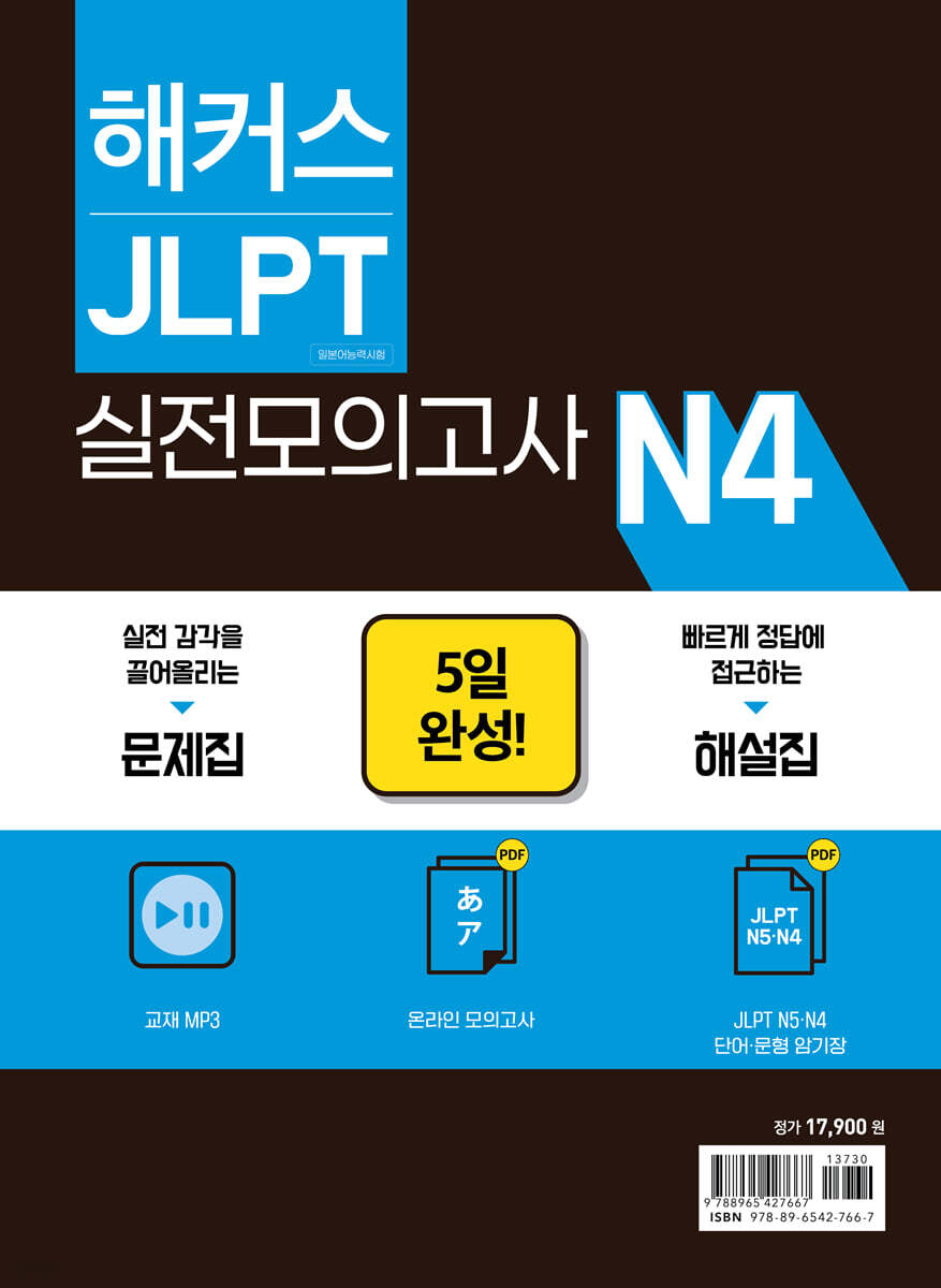 * [일본어 교육 1위] 한경비즈니스 선정 2020 한국브랜드선호도 교육(온·오프라인 일본어) 부문 1위 JLPT N4 합격을 위한 막판 5일! 최신 출제경향을 반영한 실전모의고사 4회분으로 완벽 대비! [이런 분들에게 추천합니다] 1. 실제 JLPT N4 시험과 동일한 유형의 모의고사로 최종 마무리하고 싶은 분들 2. 시험 직전 5일 만에 실전 감각을 키워 빠르게 합격하고 싶은 분들 3. 상세한 해설을 통해 부족한 부분을 보완해서 실전에 철저히 대비하고 싶은 분들 [해커스 교재만의 특장점] 1. 최신 출제경향(2024년 시험)과 난이도를 그대로 반영한 [실전모의고사 4회분]으로 실전 감각 Up! 1) 실제 시험과 동일한 구성의 실전모의고사 4회분(온라인 1회 포함)을 통해 풍부한 문제를 풀어보며 실전에 대비할 수 있습니다. 2) 중/중상/상의 다양한 난이도와 최신 출제경향이 반영된 ‘실전모의고사 4회분’으로 시험 직전 실전 감각을 극대화할 수 있습니다. 2. [상세하고 친절한 해석/해설]과 [사전이 필요 없는 자세한 어휘 정리]로 JLPT N4 완벽 준비! 1) 모든 문제에 대한 전략적인 해설을 제공하여, 쉽게 정답을 찾을 수 있는 문제풀이 전략을 확실하게 몸에 익힐 수 있습니다. 2) ‘TIP’을 통해서 문제 풀이에 반드시 필요한 포인트를 확인할 수 있습니다. 3) 직역에 가까운 해석을 제공하여, 문장 구조를 한눈에 파악하고 정답의 단서를 빠르게 찾는 연습을 할 수 있습니다. 4) 어휘가 상세하게 정리되어 있어, 문제를 풀다가 모르는 어휘가 나와도 사전을 찾아볼 필요 없이 바로 해석하고 정답을 선택할 수 있습니다. 3. [일본어 기초 문법]으로 헷갈리는 일본어 문법 확실하게 점검! 모의고사를 풀기 전 ‘일본어 기초 문법’ 코너를 통해 중요하지만 헷갈리기 쉬운 내용인 일본어 품사와 품사별 활용법을 다시 한 번 정리할 수 있습니다. 4. [5일/7일 학습 플랜]으로 단기간에 합격 달성! 합격 달성을 위한 ‘5일/7일 학습 플랜’으로 시험 직전 시간을 효율적으로 사용하여 사전에 실력을 점검하는 것은 물론, 단기간에 JLPT N4에 합격할 수 있는 실력을 기를 수 있습니다. 5. 부록 [회차별 단어·문형]과 [JLPT 빈출 단어·문형]으로 단어와 문형까지 집중 학습! 1) 해설집 뒤에 수록된 ‘회차별 단어·문형’으로 시험 직전까지 JLPT N4 기출 단어와 문형을 집중 학습할 수 있습니다. 2) ‘JLPT 빈출 단어·문형’으로 JLPT N4는 물론 JLPT N5의 빈출 단어와 문형도 학습할 수 있어, JLPT를 N4부터 준비하는 학습자라도 탄탄하게 실력을 쌓을 수 있습니다. 3) ‘회차별 단어·문형’과 ‘JLPT 빈출 단어·문형’을 통해 단어와 문형을 미리 예습함으로써, 정답을 더 쉽게 찾을 수 있어 자신감을 키울 수 있습니다. 6. 언제 어디서나 간편하게 학습이 가능한 입체적인 MP3 제공! 1) 교재의 QR코드를 스캔하면 음원을 별도로 다운로드하지 않고도 언제 어디서나 간편하게 들으며 학습할 수 있습니다. 2) 모의고사용, 고사장 소음 버전, 복습용 분할 3종으로 다양하게 제공되는 MP3를 활용하여 단기간에 청해 실력을 극대화할 수 있습니다. [JLPT N4 단기 합격을 위한 해커스만의 추가 학습 콘텐츠 - 해커스일본어(japan.Hackers.com)] 1. 일본어 인강(할인쿠폰 수록) 2. 교재 MP3 1) 모의고사용 MP3 2) 고사장 소음 버전 MP3 3) 복습용 분할 MP3 3. JLPT N4 온라인 모의고사(PDF+MP3) 4. JLPT N5·N4 단어·문형 암기장(PDF) |
