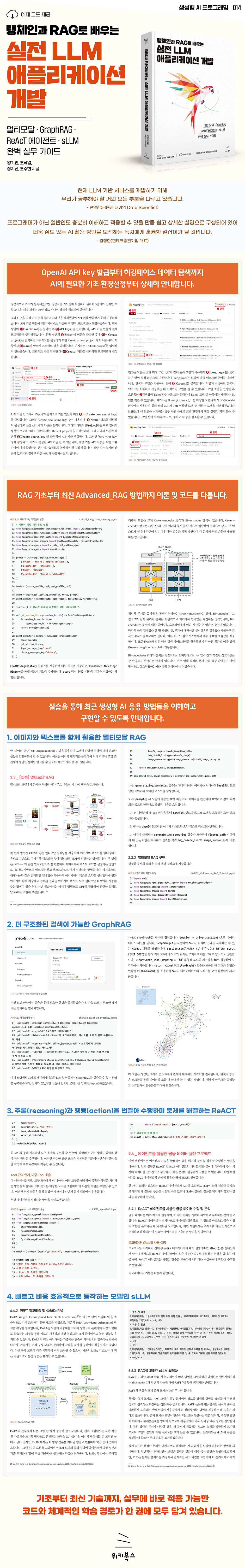 1.1 랭체인을 위한 준비사항 ___1.1.1 체인을 사용하는 이유 1.2 코랩(Google Colaboratory) 환경 ___1.2.1 코랩 실행 환경 설정 1.3 LLM API 키 ___1.3.1 GPT API 키 ___1.3.2 제미나이 API 키 1.4 허깅페이스 ___1.4.1 허깅페이스의 모델 찾기 1.5 랭체인 구성요소 ___1.5.1 체인 ___1.5.2 프롬프트 ___1.5.3 메모리 ___1.5.4 인덱스 ___1.5.5 콜백 및 평가 ▣ 02장: RAG(Retrieval-Augmented Generation) 2.1 RAG의 배경 및 중요성 2.2 랭체인을 이용한 RAG ___2.2.1 환경 설정 ___2.2.2 데이터 로드 ___2.2.3 데이터 청킹 ___2.2.4 벡터 스토어 ___2.2.5 리트리버 및 프롬프트 2.3 Advanced RAG ___2.3.1 문서의 순서를 조절하여 성능을 올리는 리랭커 기술 ___2.3.2 가상 문서를 통해 높은 질의 응답 성능을 달성하는 HyDE 기술 ___2.3.3 쿼리를 보다 구체적이고 풍부하게 만드는 쿼리 확장 기술 ___2.3.4 다양한 관점을 반영할 수 있는 멀티 쿼리 기술 ▣ 03장: 멀티모달 RAG 3.1 _멀티모달 RAG 소개 ___3.1.1 멀티모달 RAG 개념 ___3.1.2 활용 사례 ___3.1.3 중요성 3.2 멀티모달 RAG의 중요한 모델 및 기술 ___3.2.1 멀티모달 인코더 ___3.2.2 멀티모달 생성을 위한 디코더 ___3.2.3 지식 검색 및 증강 ___3.2.4 융합 기술 ___3.2.5 모델 학습과 파인튜닝 3.3 [실습] 멀티모달 RAG ___3.3.1 멀티모달 정보 추출 ___3.3.2 멀티모달 RAG 구현 ▣ 04장: GraphRAG 4.1 GraphRAG란? 4.2 기존 RAG와 차이점 4.3 GraphRAG를 위한 환경 설정 ___4.3.1 Neo4j 4.4 [실습] GraphRAG ___4.4.1 [실습] 자연어 쿼리를 통한 그래프 데이터 조회 및 조작 ___4.4.2 [실습] LLM 기반 지식그래프 구축 및 RAG 실습 ▣ 05장: ReAct 에이전트 5.1 ReAct 에이전트란? ___5.1.1 ReAct 에이전트의 개념 ___5.1.2 기본 원리 설명 ___5.1.3 ReAct와 기존 방식의 차이점 ___5.1.4 ReAct 에이전트의 주요 기능 및 활용 사례 5.2 검색 API 연동 ___5.2.1 외부 데이터 기반 답변 생성 ___5.2.2 검색 API 호출 ___5.2.3 [실습] ReAct 에이전트와 검색 API 통합 5.3 [실습] 에이전트 기반 도구 호출 ___5.3.1 기본 에이전트에서의 도구 호출 ___5.3.2 ReAct를 활용한 고급 도구 호출 5.4 에이전트를 활용한 금융 데이터 실전 프로젝트 ___5.4.1 ReAct 에이전트를 사용한 금융 데이터 수집 및 분석 ___5.4.2 검색 API를 통한 실시간 금융 시장 분석 ___5.4.3 ReAct 에이전트를 통한 통합 분석 ▣ 06장: sLLM 6.1 sLLM을 학습하는 이유 6.2 sLLM 실행 ___6.2.1 허깅페이스의 sLLM 모델 실행해 보기 6.3 FFT 학습 방법과 코드 ___6.3.1 학습 데이터 만들기 ___6.3.2 sLLM 학습을 위한 병렬 처리 방법 ___6.3.3 sLLM 학습 Full Fine-tuning하기 6.4 PEFT 학습 방법과 코드 ___6.4.1 PEFT 알고리즘 및 실습(QLoRA) ___6.4.2 PEFT 알고리즘 및 실습(DoRA) 6.5 RAG 기반의 LLM 최적화 학습 ___6.5.1 RAG를 고려한 QA 데이터 생성 ___6.5.2 RAG를 고려한 sLLM 학습 ___6.5.3 RAG를 고려한 sLLM 최적화 6.6 LLM 서빙 ___6.6.1 스트림릿을 활용한 서비스 환경 구성하기 ___6.6.2 스트림릿을 활용한 sLLM 배포해 보기 ___6.6.3 vLLM으로 sLLM 서빙 최적화하기 |