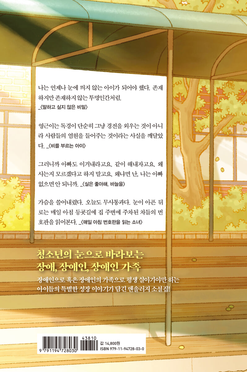 「말하고 싶지 않은 비밀」은 장애를 왜 숨겨야 하는지에 대한 질문을 던지는 작품이다. 수호는 교통사고로 한쪽 시력과 청력을 모두 잃었다. 하지만 엄마는 수호가 장애인이라는 것을 감추기 위해 전학까지 시킨다. 그러나 새로운 학교에 익숙해지려던 그때 전학 온 지체장애아 정우는 수호가 장애가 있다는 걸 알아챈다. 급기야 학급 단톡방에 수호가 장애가 있다는 사실이 알려지고 수호는 정우를 의심하면서 괴로워 하지만 진실을 알게 되고 둘은 친구가 된다. 「비를 부르는 아이」는 조선시대 맹인의 삶을 살펴볼 수 있는 작품이다. 가난한 집 영근이는 어렸을 때부터 눈이 안 좋았다가 결국 시력을 모두 잃고 만다. 이 사실을 알게 된 아버지는 늙고 병들어 혼자 보살필 수 없으니 같이 죽자고 말한다. 그때 같은 마을의 곽 씨 아저씨가 두 사람을 말리며, 한성에는 맹인을 위한 명통시라는 곳이 있다며 그곳에서 점을 치거나 독경을 읽는 일을 배울 수 있다며 같이 가볼 것을 권한다. 아버지를 따라 명통시로 간 영근이는 우여곡절 끝에 점을 치는 홍계관이라는 맹인의 도움으로 기우제를 지낼 때 독경하는 데 참여하면서 자신의 쓸모를 찾게 된다. 「실은 좋아해, 바늘을」은 가정에 장애인이 생기면서 일어나는 변화와 심리를 담은 작품이다. 소나는 바늘이라면 질색하는 중3 아이다. 수행평가로 바느질하는 것도 끔찍하게 싫다. 어느 날 소나의 아빠는 신장투석을 받아야 하는 환자가 되고, 집안 분위기는 가라앉는다. 일주일에 세 번씩 엄마와 소나는 돌아가며 투석하기 위해 병원에 가는 아빠를 돕는다. 소나보다 더 바늘을 싫어하는 아빠는 평생을 이렇게 살아야 한다는 사실에 좌절하고, 우울해한다. 소나는 준우의 도움으로 아빠의 팔에 튀어나온 혈관을 감출 수 있는 팔토시를 바느질로 만들기로 한다. 완성된 팔토시를 아빠에게 선물하며, 소나의 가족은 힘들지만 함께 이겨내 보기로 마음먹는다. 마지막 작품인 「매일 아침 번호판을 읽는 소녀」는 겉보기에는 멀쩡해 보이는 장애를 가진 이들의 고충을 다룬 작품이다. 서안이는 어렸을 때부터 원인불명의 안질환을 가지고 있다. 에어컨 바람에 눈이 따끔거려 학교에서도 유난스러운 아이로 인식되어 있다. 그러다가 비문증과 광시증까지 겹치면서 늘 실명의 불안에 시달리지만 티가 나지 않으니 꾀병으로 바라보는 친구들도 있다. 더 이상 견디지 못하고 자퇴한 서안이는 집안에서 외로운 시간을 보내고, 마침내 선생님과 엄마의 도움으로 다시 학교로 돌아간다. |