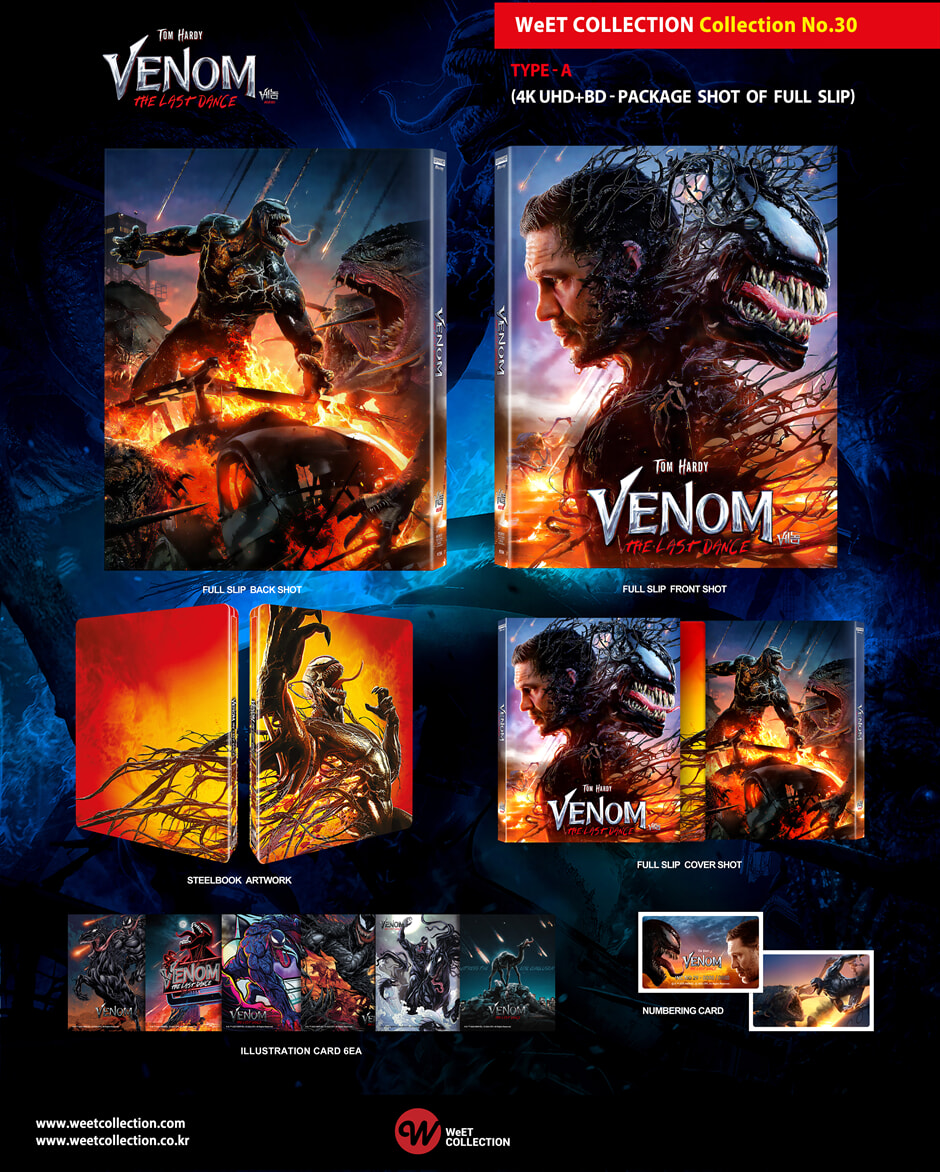- 오디오: 영어 DOLBY ATMOS (DOLBY TRUEHD 7.1 COMPATIBLE), 프랑스어 5.1 DTS-HD MASTER AUDIO, 독일어 5.1 DTS-HD MASTER AUDIO, 이탈리아어 5.1 DTS-HD MASTER AUDIO, 스페인어 5.1 DTS-HD MASTER AUDIO, 태국어 5.1, 터키어 5.1 - 본편 자막: 한국어, 영어, 영어 SDH, 아랍어, 중국어, 덴마크어, 네덜란드어, 에스토니아어, 핀란드어, 프랑스어, 독일어, 이탈리아어, 라트비아어, 리투아니아어, 노르웨이어, 포르투갈어, 스페인어, 스웨덴어, 태국어, 터키어 - 화면비율: WIDESCREEN 2.39:1 - 디스크 타입: UHD-99 DISC 2 블루레이 - 오디오: 영어 5.1 DTS-HD MASTER AUDIO, 프랑스어 5.1 DTS-HD MASTER AUDIO, 스페인어 5.1, 태국어 5.1 - 본편 자막: 한국어, 영어, 영어 SDH, 중국어, 프랑스어, 스페인어, 태국어 - 스페셜 피쳐 자막: 한국어, 영어 SDH, 중국어, 태국어 - 화면비율: Widescreen 2.39:1 - 디스크 타입: BD-50 DUAL LAYER SPECIAL FEATURES DISC 2 - Venomous Laughs: Outtakes & Bloopers - Author of Mayhem: From Writer to Director - Venom Unleashed: The Action and Stunts - Bonded in Chaos: Tom Hardy - Venom’s Inner Circle - Brock Bottom: Mrs. Chen Interview - Savor the Last Bite: The Venom Legacy - Deleted & Extended Scenes - Select Scene PreVis - One Last Dance - Tom Morello x Grandson |