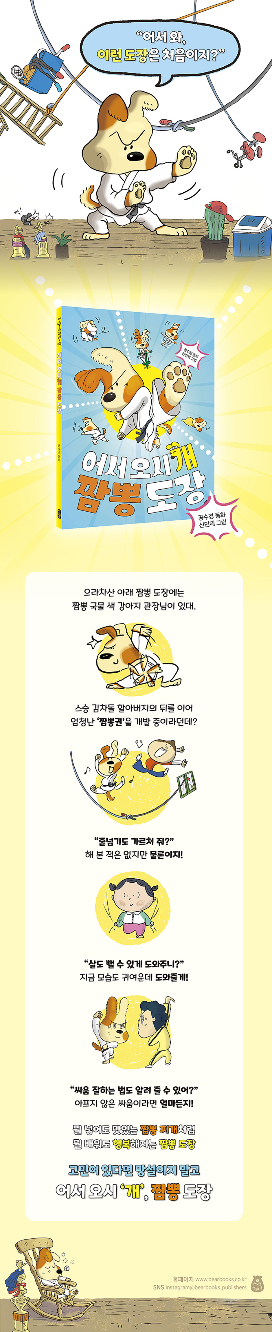 고민이 있다면 망설이지 말고 어서 오시‘개’, 짬뽕 도장 어린이의 마음에 더 가까이, 책읽는곰이 자신 있게 추천하는 어린이 동화 ‘큰곰자리 중학년’ 시리즈 두 번째 책은 공수경 작가가 글을 쓰고 신민재 작가가 그림을 그린 《어서 오시‘개’, 짬뽕 도장》입니다. 표지에서 털이 보송보송한 앙증맞은 발로 멋진 발차기 동작을 뽐내는 녀석이 짬뽕 관장이지요. 으라차산 바위틈에 끼어 있던 녀석을 구해 주고, 이름도 지어 주고, 태권도까지 가르쳐 준 김차돌 할아버지가 짬뽕에게 도장을 물려주고 돌아가셨거든요. 짬뽕은 예전처럼 도장에 아이들이 북적거리게 만들겠다고 결심하고, 간판부터 ‘짬뽕 도장’으로 바꿔 답니다. 그리고 태권도가 아니라 자기만의 ‘짬뽕권’을 개발해 가르치리라 야심 찬 계획을 세우는데요. 과연 짬뽕 관장님의 꿈은 이루어질까요? 뭘 넣어도 맛있는 짬뽕 찌개처럼 뭘 배워도 행복해지는 ‘짬뽕 도장’ 맨 처음 도장을 찾은 ‘도토리’는 대뜸 줄넘기도 가르치냐고 짬뽕에게 묻습니다. 간판에 짬뽕이라고 쓰여 있으니, 아무 재료나 다 넣어서 끓인 짬뽕 찌개처럼 아무거나 다 가르치는 곳이라고 생각했대요. 줄넘기를 한 번도 해 본 적 없는 짬뽕은 잠깐 고민하는 듯하더니 덜컥 도토리를 1호 수련생으로 받아들입니다. 할아버지가 늘 짬뽕에게 “네 도움이 필요한 사람이나 동물을 외면하지 말거라.”라고 했거든요. 물론 줄넘기를 가르쳐 주는 척하면서 ‘짬뽕권’을 슬쩍 가르쳐서 퍼뜨리겠다는 흑심(?)도 있었고요. 대책 없이 자신만만한 짬뽕 관장은 사방팔방에 거미줄 치듯 줄넘기 줄을 묶고는 도토리가 생각한 것과는 조금, 아니 사실은 아주 많이 다른 줄넘기 수련을 시작합니다. 할아버지의 낡은 카세트로 음악을 틀고 마당에 있던 트램펄린까지 가져와서 제대로 한판 놀고 났더니, 이게 무슨 일일까요? 줄넘기할 때마다 도토리를 멈칫하게 만든 ‘줄 공포증’이 말끔하게 사라진 게 아니겠어요? 1호 수련생 도토리가 입소문을 잘 낸 건지 살을 빼고 싶다는 ‘마카롱’에 싸움 대장이 되게 해 달라는 ‘추로스’까지 짬뽕 도장 수련생이 됩니다. 짬뽕 관장이 괜히 자신만만한 게 아니었나 봐요. 그래도 잠뽕 관장은 초심을 잃지 않고(?!) 제 방식대로 아이들과 수련(을 빙자한 놀이)을 거듭해 나갑니다. 효과는 말 안 해도 알겠지요? 어리다고 고민의 깊이가 덜한 것은 아닙니다. 사소한 다툼 때문에 다음 날 학교에 갈 자신이 없어서 밤새 뒤척인 경험, 누구나 해 본 적 있을걸요. 그런데 문제를 해결할 실마리는 언제나 생각지 못한 곳에서 발견하게 마련이지요. 막상 시도해 보면 그리 어려운 일이 아니었다는 것도 알게 되고요. 줄넘기를 못했던 것은 잘하고 싶고, 친구들한테 창피당하고 싶지 않다는 부담과 두려움 때문이었고, 마음의 허기를 간식과 텔레비전으로 채우려다가 찐 살은 친구들과 맛있는 간식을 나눠 먹으며 심심할 틈 없이 어울려 놀다 보면 건강하게 빠지는 법이지요. 물론 살을 빼든 찌우든 마카롱은 마카롱이고, 마카롱이 행복하면 될 일입니다. 할아버지가 그러셨거든요. “누가 뭐라고 하든 무슨 상관이냐? 자기가 좋으면 됐지. 다른 사람에게 폐만 안 끼치면 된다.” 또 ‘아무도 아프지 않은’ 싸움만 골라 즐겁게 연습하면서 아이들은 괴롭힘에 괴롭힘으로 대응하지 않더라도 느긋함과 자신감으로 스스로를 지키는 법도 알게 됩니다. 언뜻 보기에 엉뚱해 보이는 짬뽕 관장의 수련법이 의외로 적중률이 높은 까닭은 아무래도 짬뽕이 강아지의 모습을 한 어린이라서 그런 것이겠지요. 공수경 작가는 실패가 두려워 시도조차 꺼리는 어린이들에게 김차돌 할아버지와 그 가르침을 이어받은 짬뽕의 입을 빌려 “특별히 잘할 필요도 없고, 못한다고 기죽을 필요도 없다. 재밌게 했으면 최고로 잘한 거다.”라고 말해 주고 싶었대요. 그러기 위해서는 서로 마음을 나눌 친구와 ‘함께’ 어울리는 게 중요하다고요. 어린이의 눈높이에서, 어떤 환경에서든 어린이가 무력감을 느끼지 않고 몇 번이고 다시 시도할 수 있도록 힘을 실어 주는 것이 동화의 역할이라면 《어서 오시‘개’, 짬뽕 도장》이야말로 동화다운 미덕을 잘 갖춘 책일 것입니다. “관장님이 귀엽고 수련법이 왠지 신나요!” 쏟아지는 후기… 짬뽕 도장 수련생 절찬 모집 중 공수경 작가는 전작 《해피 메리 루빛뚱》에서 ‘루돌프가 아니라 루빛뚱답게’ 소심하지만 자기 꿈을 꿋꿋이 밀고 나가는 매력적인 순록 캐릭터를 만들어 냈지요. 이 책 《어서 오시‘개’, 짬뽕 도장》에서 루빛뚱에 이어 다시 한번 독자들을 사로잡을 치명적인 캐릭터가 탄생했습니다. 하는 것마다 ‘이게 맞아?’ 싶을 정도로 얼렁뚱땅하면서도 뻔뻔할 정도로 줏대 있고 묘하게 타율 좋은 짬뽕 관장입니다. 글만 읽어도 매력이 철철 넘치는 이 녀석은 신민재 작가의 손을 거쳐, 보자마자 꺅 소리 나게 사랑스럽고도 늠름한 짬뽕 색 멍멍이로 완성되었지요. 〈달평 씨〉 시리즈로 어린이는 물론 가사와 육아에 지친 어른까지 위로해 준 신민재 작가는 짬뽕이가 귀엽고 친근하면서도 지혜로워 보이도록 특별히 신경을 썼다