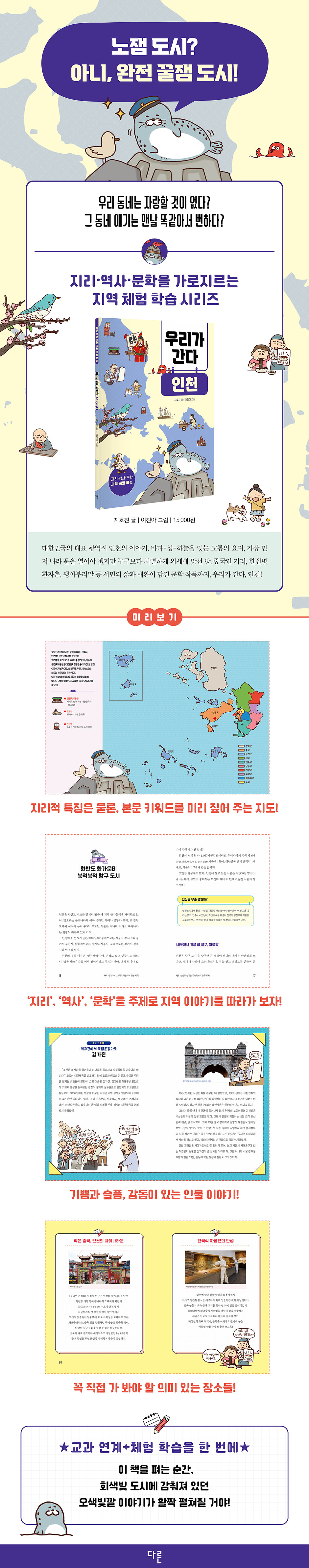 그중에서도 1권 《우리가 간다 인천》은 대한민국의 광역시 중 하나인 인천의 이야기야. 인천의 지도를 따로 떼어서 보면 느낌이 확 오겠지만, 인천은 바다-섬-하늘을 잇는 진짜 특별한 땅이야. 역사적으로는 가장 먼저 나라 문을 열고, 전쟁의 한복판에 서고, 독립운동의 함성이 울린 곳이기도 해. 게다가 평범한 서민의 삶과 애환이 절절히 담긴 문학 작품들의 단골 배경이 되기도 했지.