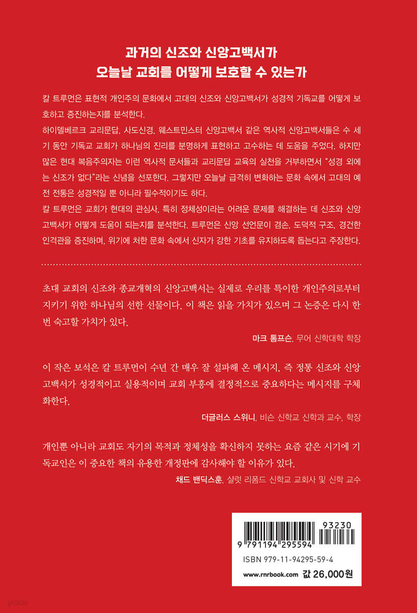 칼 트루먼은 다시 한번 우리에게 통찰력 있는 책을 선물했다. 트루먼은 오래된 신조가 얼마나 신선한지를 보여 줌으로써 신조의 타당성을 입증한다. 이 책은 이유도 모른 채 신조를 고수하는 사람이나 신조가 필요하지 않다는 것을 신조로 삼는 사람뿐 아니라 기독교 신앙을 실천하려는 모든 사람도 꼭 읽어야 할 필독서다. - 헤르만 셀더르하위스 (네덜란드 아펠도른 신학대학교 총장, 종교개혁 500주년 기념 사업 이사, 종교개혁 연구 컨소시엄 대표)