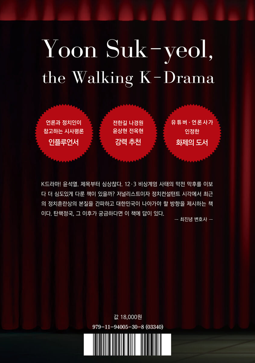 “계엄에서 탄핵을 거쳐, 다시 중심으로” 『K-드라마 윤석열』은 한 정치인의 흥망성쇠를 기록한 회고록이 아니다. 헌정 위기와 국민 분열, 그리고 정치 지도자의 결기라는 뜨거운 키워드를 중심에 두고 대한민국의 정치 현실을 입체적으로 해부한 정치 분석서이자 역사적 증언서다. 이 책은 2024년 말부터 촉발된 대통령 탄핵 정국과 그 전후 과정을 생생하게 기록했다. 대통령의 비상계엄 선포는 물론, 헌법재판소의 졸속 심리, 공수처의 ‘영장 쇼핑’ 스캔들, 그리고 언론과 여론전까지 …. 저자 심규진 교수는 이 복합적인 사건을 단순한 평면적 기술이 아닌, 구조적인 분석 방식으로 풀어냈다. 특히 윤석열 대통령의 리더십을 다룬 챕터는 백미로 꼽힌다. 단독으로 계엄을 결단하고, “내가 책임지겠다”며 헌법재판소에 출석한 장면은, 과거 노무현 대통령과의 서사적 유사성을 떠올리게 하면서도 보수 진영의 ‘힘의 미학’과 맞닿아 있음을 보여준다. 이는 단순한 정치적 반전이 아니라 국가의 방향성과 질서 회복을 위한 지도자의 실존적 결단이었다. 책은 또 하나의 화두를 던진다. “헌법이냐, 민심이냐.” 헌재의 심리가 길어진 이유를 비롯하여 여론 흐름의 변화, 진보와 보수를 넘나드는 계층 간의 균열. 이 모든 변수가 뒤얽힌 탄핵 정국에서 저자는 어느 한쪽으로 치우치지 않고 법리와 민심의 균형을 치열하게 고민한다. 특히 김계리 변호사의 “계몽되었다”는 말은 시대의 각성을 상징적으로 드러낸 장면으로 진정한 귀감이 되고 있다. 또한 작가는 정치 문화와 디지털 시대의 새로운 저항 방식을 짚는다. 2030 세대의 등장, 이대남의 반응, 트로트 스타와 유튜브 채널들이 만들어낸 의외의 결집력 등은 기존의 진영 정치가 더는 유효하지 않다는 경고이자, 새로운 정치 소비자의 탄생을 의미한다. 『K-드라마 윤석열』은 대통령을 중심으로 전개되는 이야기이지만, 결국 책이 담고자 한 것은 “대한민국 정치의 오늘과 내일”이다. 진영과 계급, 세대 및 지역을 초월한 질문에 응답하려는 치열한 시도이자, 자유민주주의란 무엇이며 우리는 어디로 가고 있는가에 대한 총체적 탐문이기도 하다. 역사적 사건을 넘어, ‘정치적 존재’인 윤석열을 이해하고 그가 지금 우리에게 던진 물음을 함께 고민해야 할 이유가 이 책에 담겨 있다. |