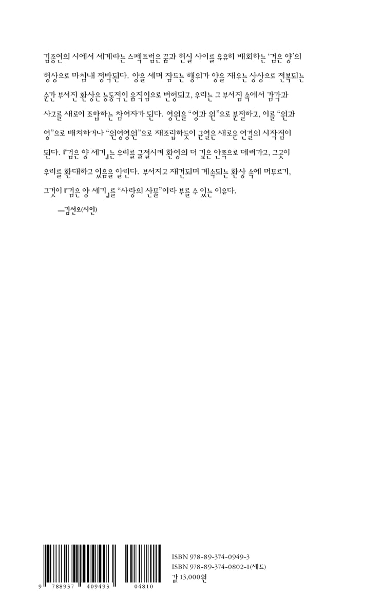 김종연의 시에서 세계라는 스펙트럼은 꿈과 현실 사이를 유유히 배회하는 ‘검은 양’의 형상으로 마침내 정박된다. 양을 세며 잠드는 행위가 양을 재우는 상상으로 전복되는 순간 부서진 환상은 능동적인 움직임으로 변형되고, 우리는 그 부서짐 속에서 감각과 사고를 새로이 조합하는 참여자가 된다. 영원을 “영과 원”으로 분절하고, 이를 “원과 영”으로 배치하거나 “원영영원”으로 재조립하듯이 균열은 새로운 연결의 시작점이 된다. 『검은 양 세기』는 우리를 굴절시켜 환영의 더 깊은 안쪽으로 데려가고, 그곳이 우리를 환대하고 있음을 알린다. 부서지고 재건되며 계속되는 환상 속에 머무르기, 그것이 『검은 양 세기』를 “사랑의 산물”이라 부를 수 있는 이유다. - 김선오 (시인)