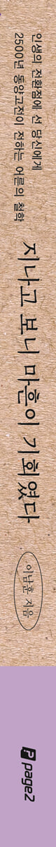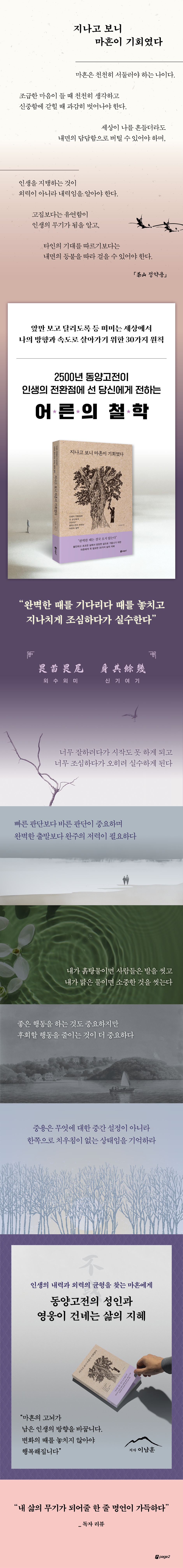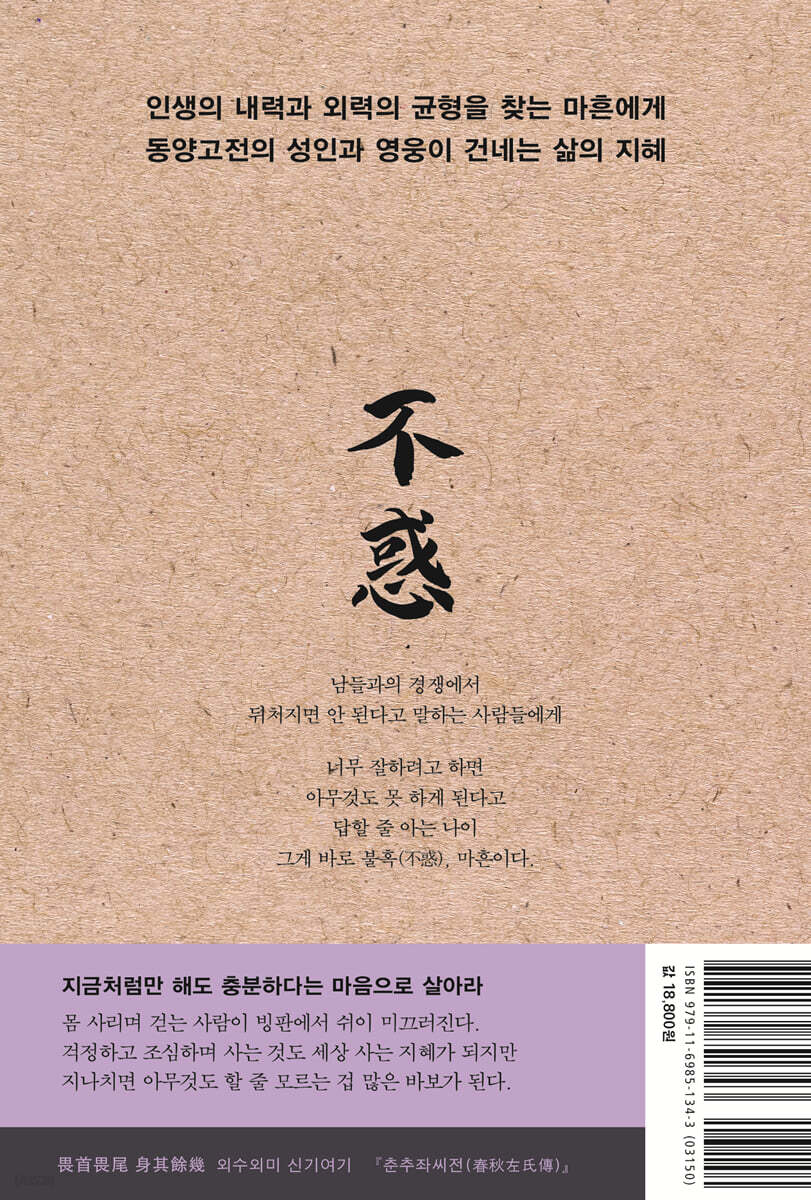 PART 1 과거의 경험을 버려야 비로소 미래를 탐험할 수 있다 〈목표〉 - 남들을 따라 넘었던 ‘첫 번째 산’을 뒤로하고 혼자 넘을 ‘두 번째 산’을 보라 젊을 땐 인간의 질서를 봐야 하지만, 마흔에는 자연의 질서를 봐야 한다 - 무위자연(無爲自然), 마흔이 받아들여야 할 진정한 삶의 태도 태어난 날을 기념하지 말고, 왜 사는지 깨달은 날을 기념하라 - 호가호위(狐假虎威), 등 뒤의 호랑이가 사라질 때면 마음속에 매화나무를 심어야 한다 젊다고 지혜롭지 말라는 법은 없지만, 지혜는 반드시 나이를 동반한다 - 노성지인(老成之人), 지혜로워지려면 반드시 나이가 들어야만 한다 내가 흙탕물이면 사람들은 발을 씻고, 내가 맑은 물이면 소중한 것을 씻는다 - 현동(玄同), 마흔이 도달해야 할 천하의 귀한 차원 더 많은 것을 갈망할수록, 우리 삶은 더 초라해진다 - 단사표음(簞食瓢飮), 욕망의 회오리를 멈추는 법 PART 2 세상은 당신을 흔들지 못한다. 당신 스스로 흔들렸을 뿐이다 〈방향〉 - 외부의 스포트라이트에 관심을 두지 말고, 내면의 촛불에 의지하라 마음이 튀는 혼란함을 막아야 방향성이 분명해진다 - 치대국약팽소선(治大國若烹小鮮), 말을 줄여야 마음과 정신이 다치지 않는다 나로부터 해방되지 않으면, 새로운 출발도 존재하지 않는다 - 절차탁마(切磋琢磨), 과거를 자르고 줄여야 보석 같은 내가 탄생한다 마흔은 유혹에 흔들리지 않는 나이가 아니라, 유혹의 뒷면을 보는 나이다 - 인드라망(因陀羅網), 행복은 고통의 출발이고 고통은 행복의 시작이다 중용은 애매한 중간이 아닌 단단한 중심이다 - 금의야행(錦衣夜行), 새로운 의미와 가치로 인생 재건축을 해야 한다 고집은 미련한 사람의 힘이고, 유연성은 지혜로운 사람의 무기다 - 교왕과직(矯枉過直), 굽은 것을 바로잡으려다 지나치게 곧아지지 마라 PART 3 빨리 가는 것은 나쁜 것이 아니라 위험한 것이다 〈속도〉 - 빠르게 문제를 해결하려다 빠르게 망할 수 있다 문제는 잘못된 생각이 아니라 조급한 생각 때문에 발생한다 - 우직지계(迂直之計), 멀리 돌아가는 방법을 알아야 승리한다 빠른 것이 중요한 것이 아니라 지치지 않는 것이 중요하다 - 망중한(忙中閑), 시간을 분절하고, 프레임을 씌우면 훨씬 효과적이다 나를 늦추는 절제의 시간이 오히려 더 빠른 추진력이 된다 - 낙불가극(樂不可極), 즐거움을 극도로 추구하지 않아야 탁월한 인간이 된다 서두르지 않지만 멈추지 않고, 팽팽하지 않지만 느슨하지도 않게 하라 - 해현경장(解弦更張), 끊임없는 점검과 관리가 조급함을 해소한다 편안할 때 위기를 상상하고, 위기가 왔을 때는 오히려 편안해져라 - 거안사위(居安思危), 위기가 없는 것처럼 보이는 사람들에게는 다 이유가 있다 PART 4 인생의 외력이 강해도 더 강한 내력이 있으면 된다 〈태도〉 - 역경 없이 강해지는 사람은 아무도 없다 마음의 흔들림, 기울어질 수는 있어도 쓰러지지는 말자 - 애이불비(哀而不悲), 담담하게 살아갈 수 있다면 인생은 훨씬 편안해진다 익숙한 나날에 속아 오늘의 소중함을 잊지 마라 - 생사일여(生死一如) 물아일체(物我一體), 내 하루의 가치를 잊지 말라 좋은 행동을 하려 하지 말고 후회할 행동부터 줄여라 - 살계취란(殺鷄取卵), 단기적인 관점에서 벗어나면 후회할 행동이 줄어든다 매력적인 사람은 완벽한 사람이 아니라, 결점이 있어도 빛나는 사람이다 - 매독환주(買?還珠), 무엇보다 중요한 마흔의 멋과 매력 돈이 없으면 노후가 비참하지만, 돈이 많다고 찬란해지는 것도 아니다 - 전가통신(錢可通神), 귀신과도 통하게 하는 돈을 어떻게 대할 것인가? PART 5 실패란 넘어지는 것이 아니라 넘어진 자리에서 머무는 것이다 〈동력〉 - 새로운 환경에서는 새로운 추진력이 필요하다 인간관계 손절하려다 내면의 불꽃까지 사그라든다 - 교학상장(敎學相長), 누군가를 가르친다는 것은 내가 곧 배운다는 이야기다 자신감은 나를 추켜세우는 힘이 아니라 미지의 세계로 들어가는 힘이다 - 일엽장목(一葉障目), 자신감이 괴물이 되지 않도록 하라 젊음은 인생의 어떤 기간이 아니라, 특정한 마음의 상태다 - 호추불두(戶樞不蠹), 호기심을 통해 반짝이는 짜릿함을 찾아가는 법 완벽하게 출발하려 하지 말고 끝까지 완주하는 힘을 길러라 - 행백리자 반어구십(行百里者 半於九十), 위대한 출발보다는 초라한 출발이 더 낫다 영화 속 영웅이 되려 하지 말고 게임 속 플레이어가 되어라 - 자등명 법등명(自燈明 法燈明), 자신을 등불로 삼아라 [에필로그] 지혜의 배를 타고 고통의 바다를 건너라 |